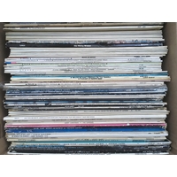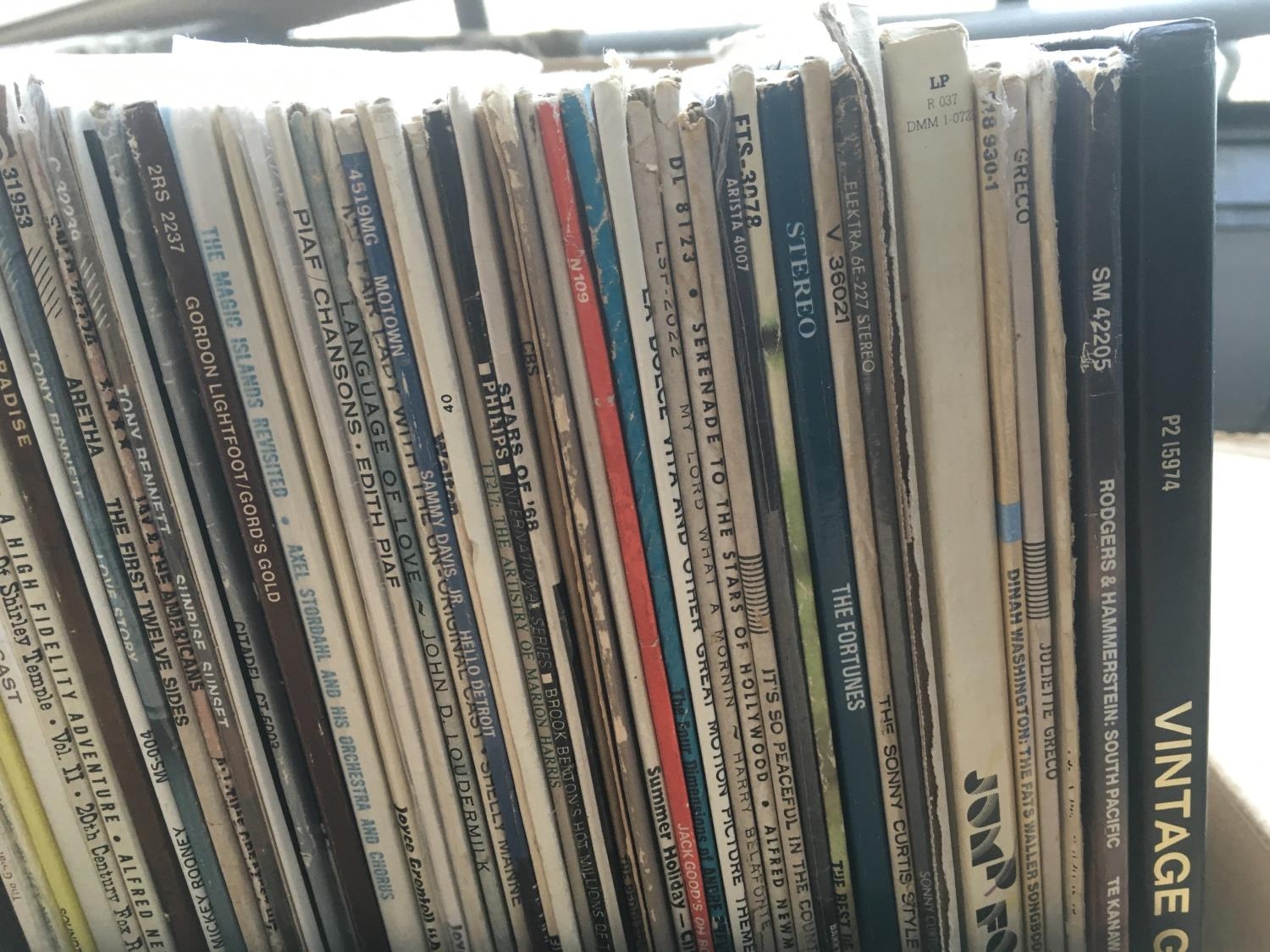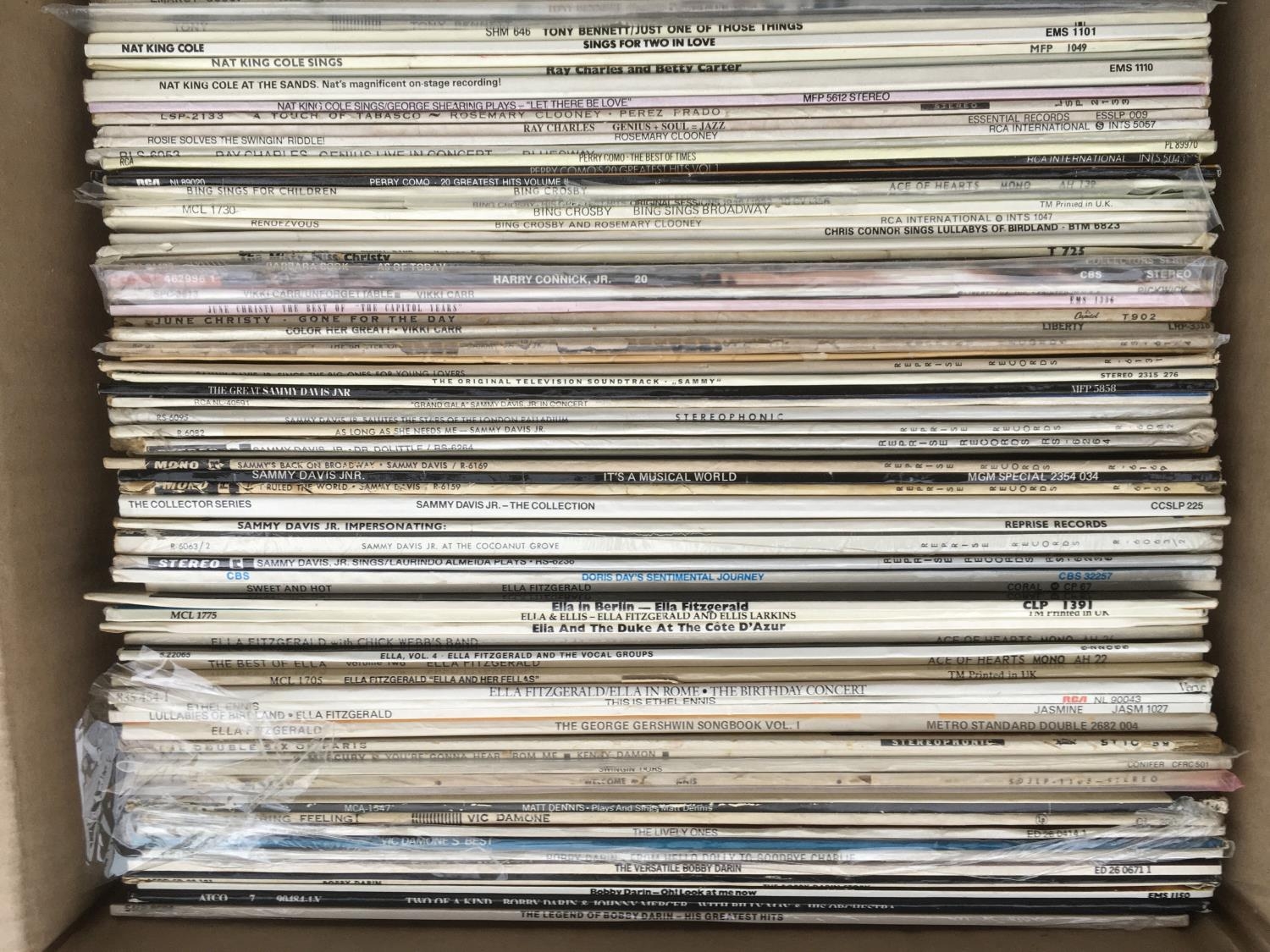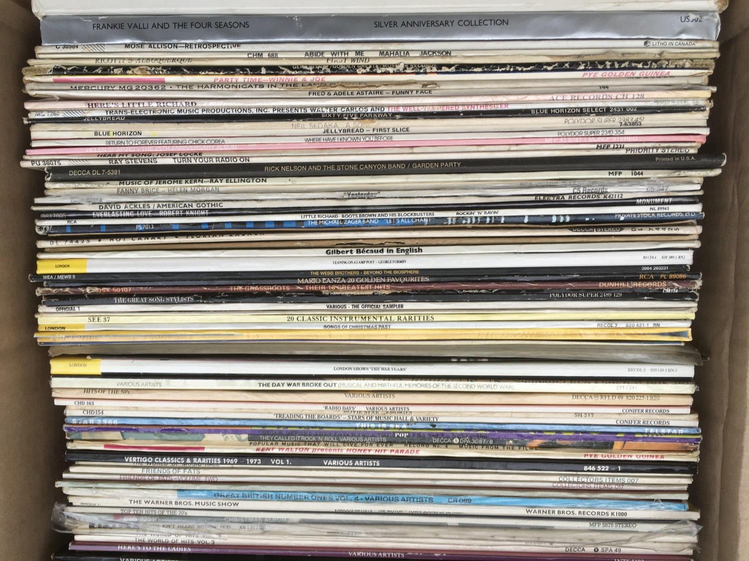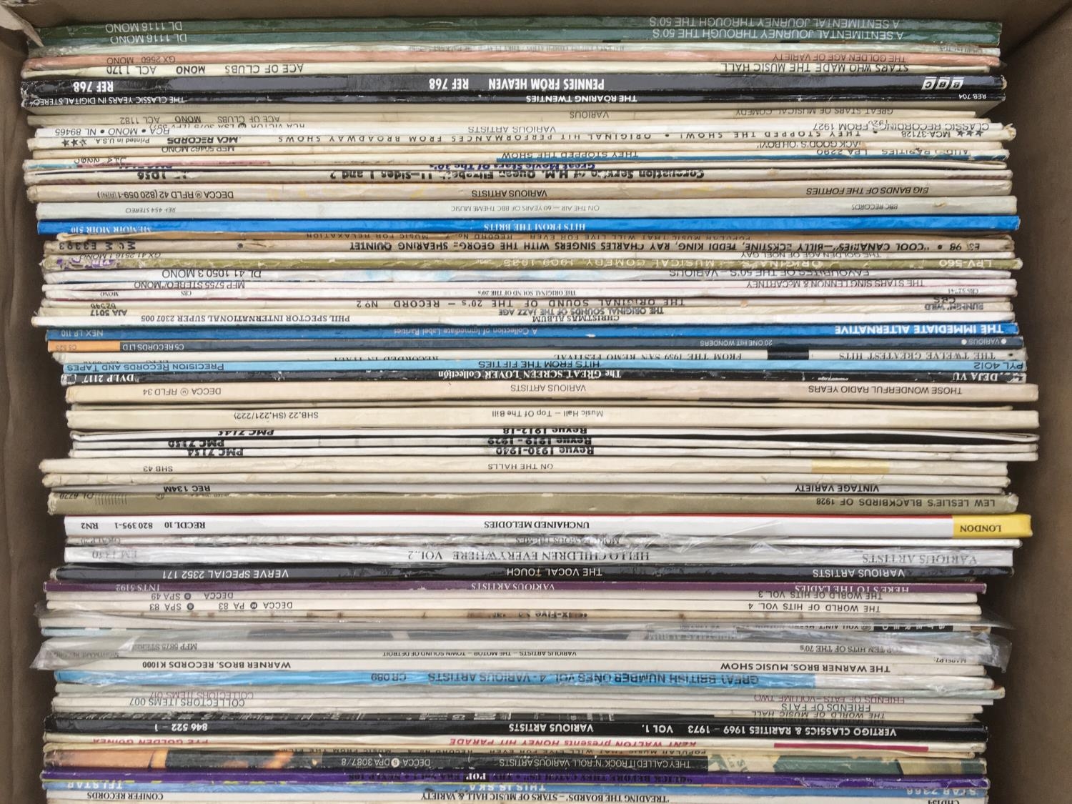 Four boxes of LPs and 10 inch records including jazz titles and popular shows of the 1940s/50s and 60s.