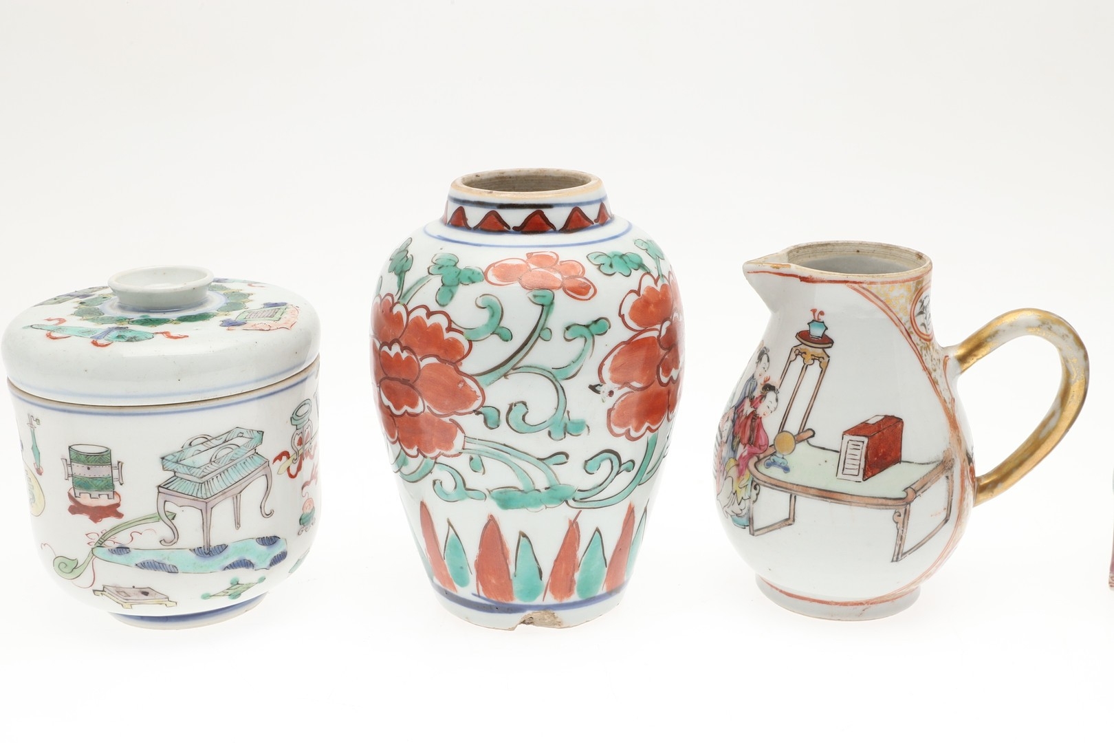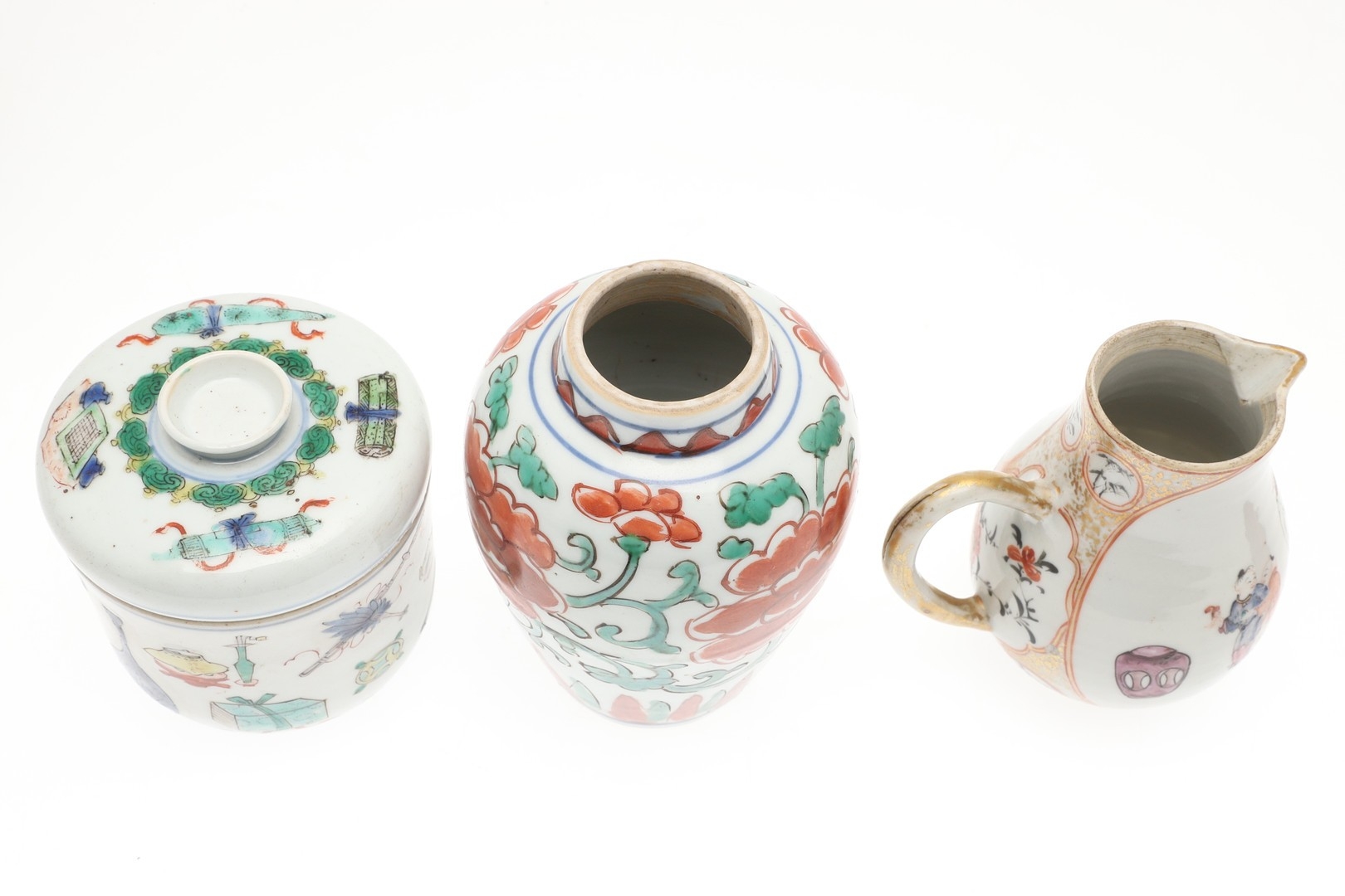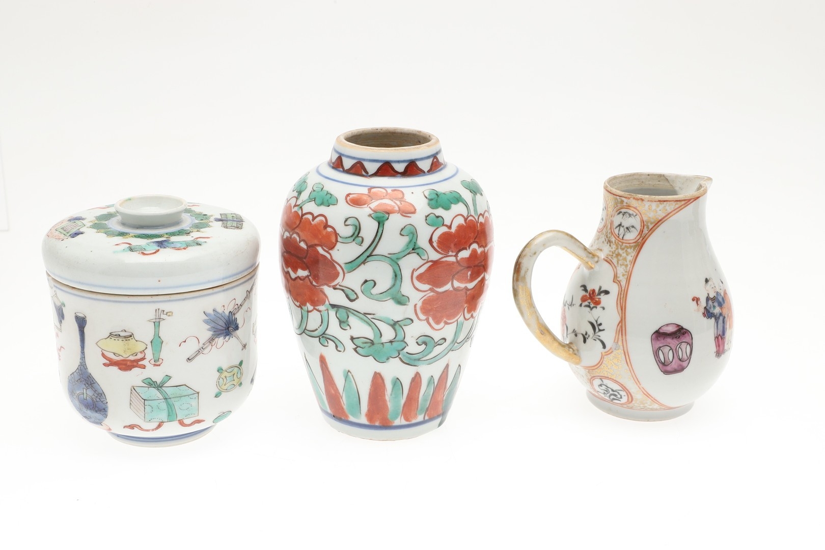 CHINESE FAMILLE VERTE LIDDED JAR & OTHER ITEMS. A small lidded jar painted with a variety of precious objects, probably Kangxi Period (10cms high), also with a small Wucai peony vase (17thc, 12.5cms high), a sparrow beak cream jug (10cms high) and matching cups, pair of small seated figures (13cms high) and other items. Various damages.