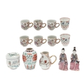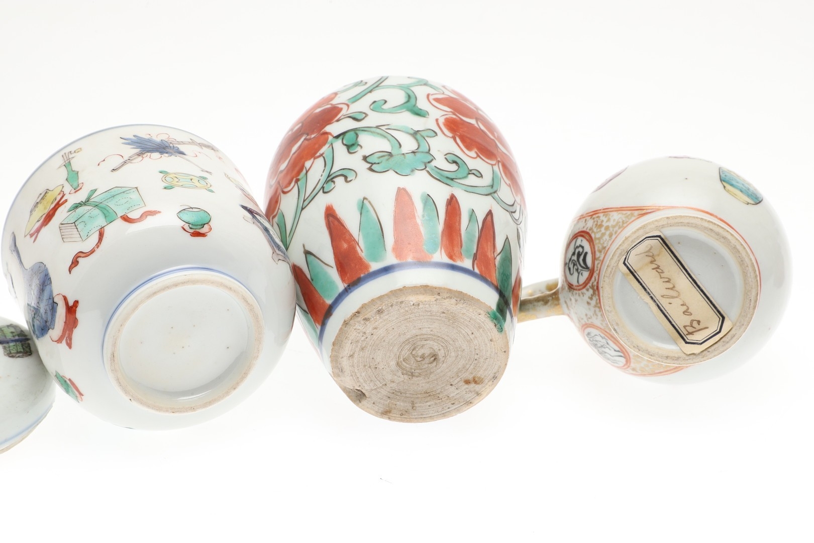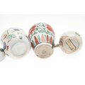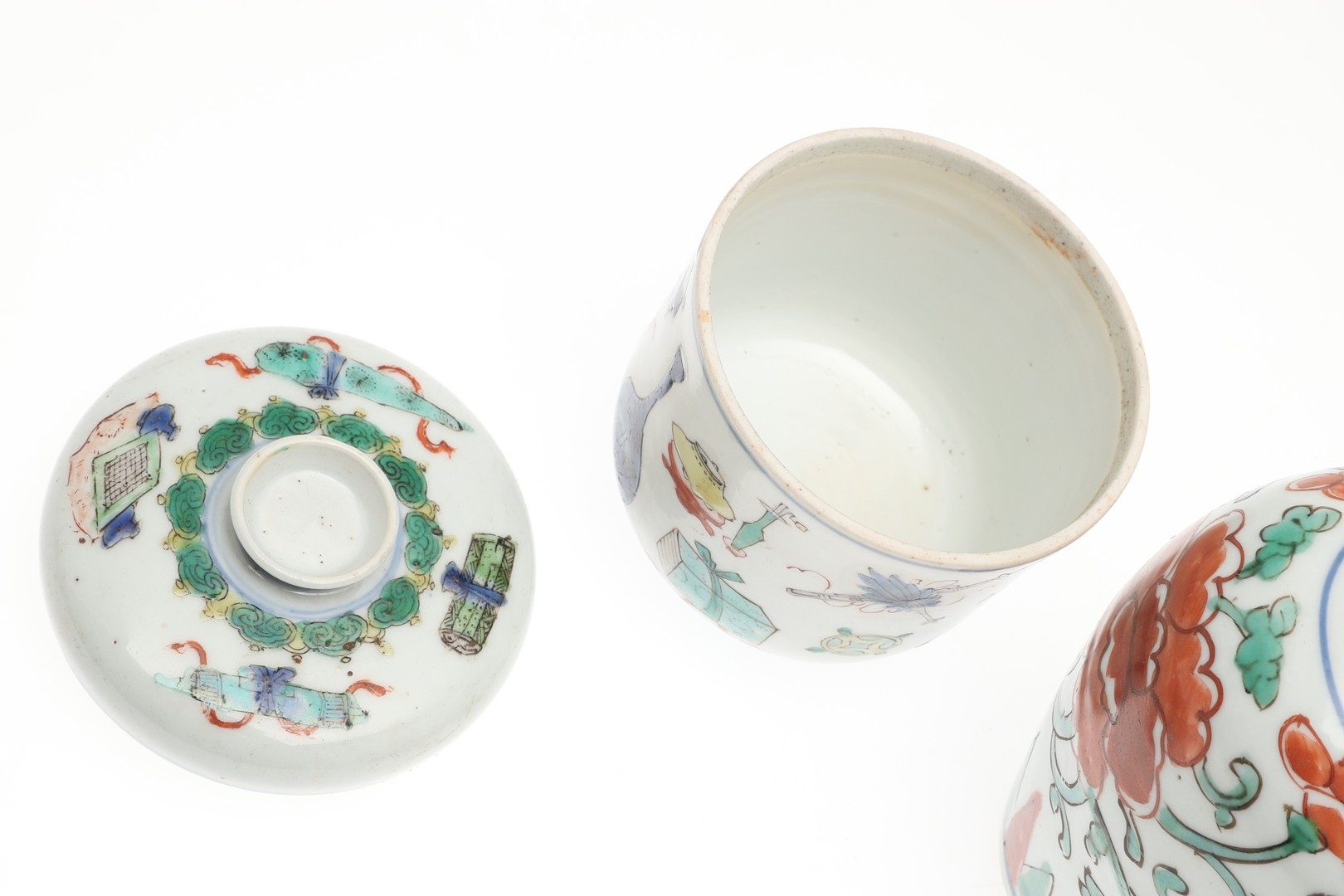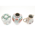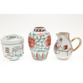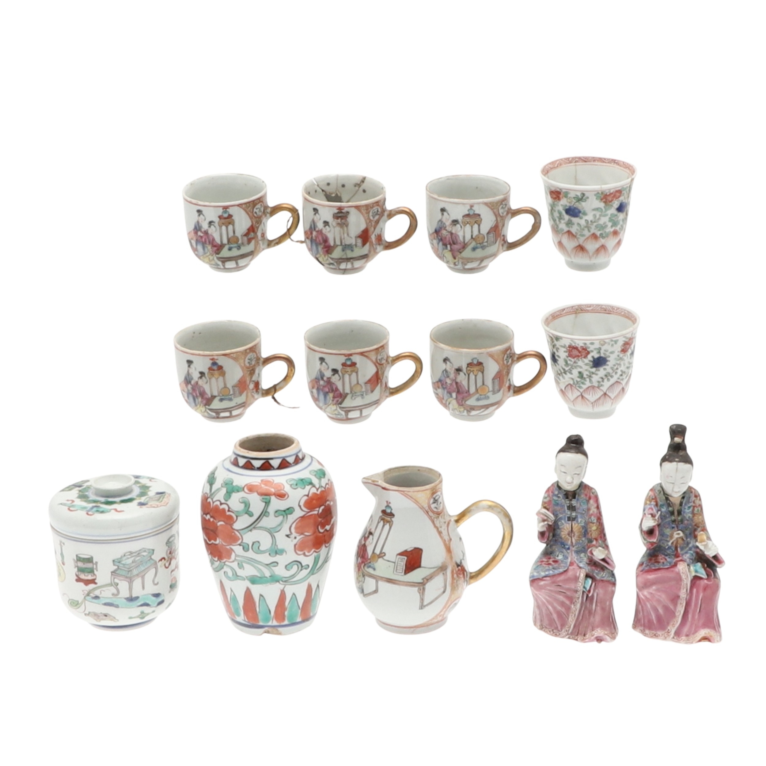 CHINESE FAMILLE VERTE LIDDED JAR & OTHER ITEMS. A small lidded jar painted with a variety of precious objects, probably Kangxi Period (10cms high), also with a small Wucai peony vase (17thc, 12.5cms high), a sparrow beak cream jug (10cms high) and matching cups, pair of small seated figures (13cms high) and other items. Various damages.