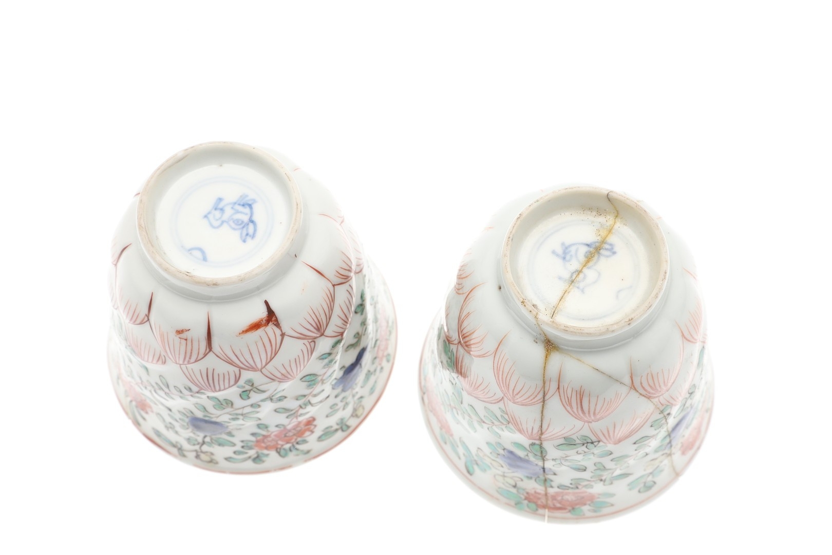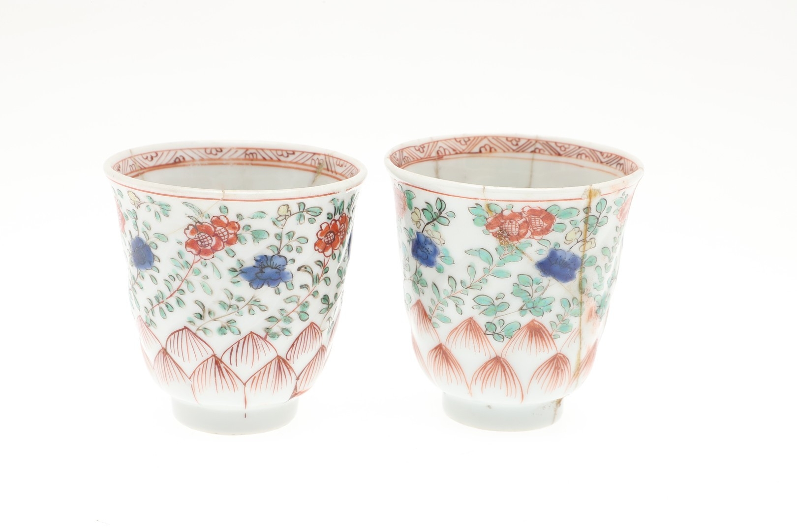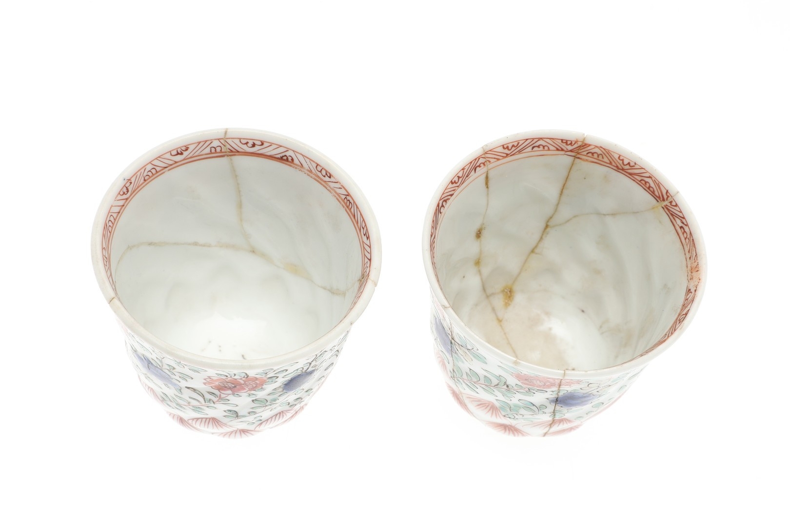 pair of cups, both heavily broken and repaired