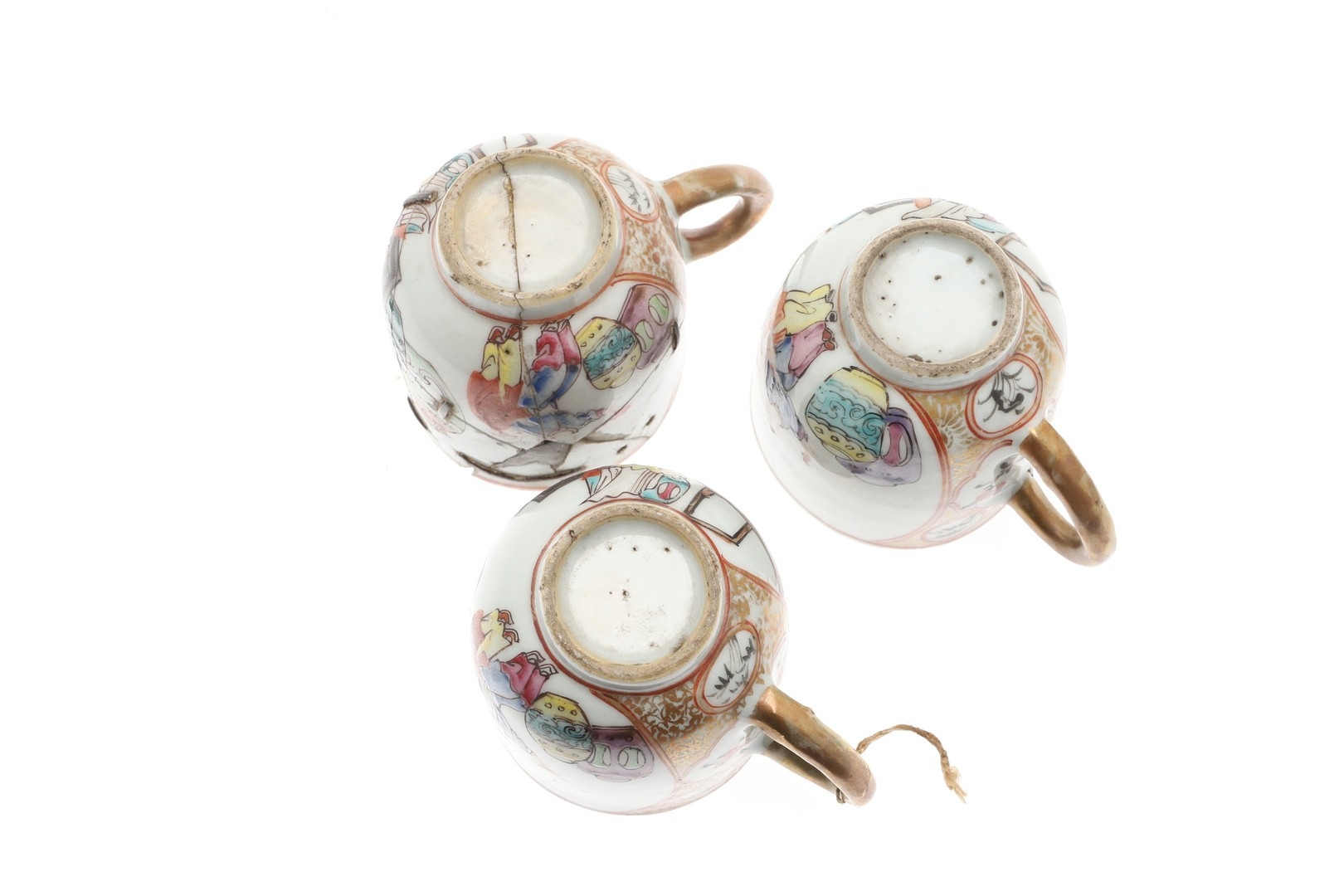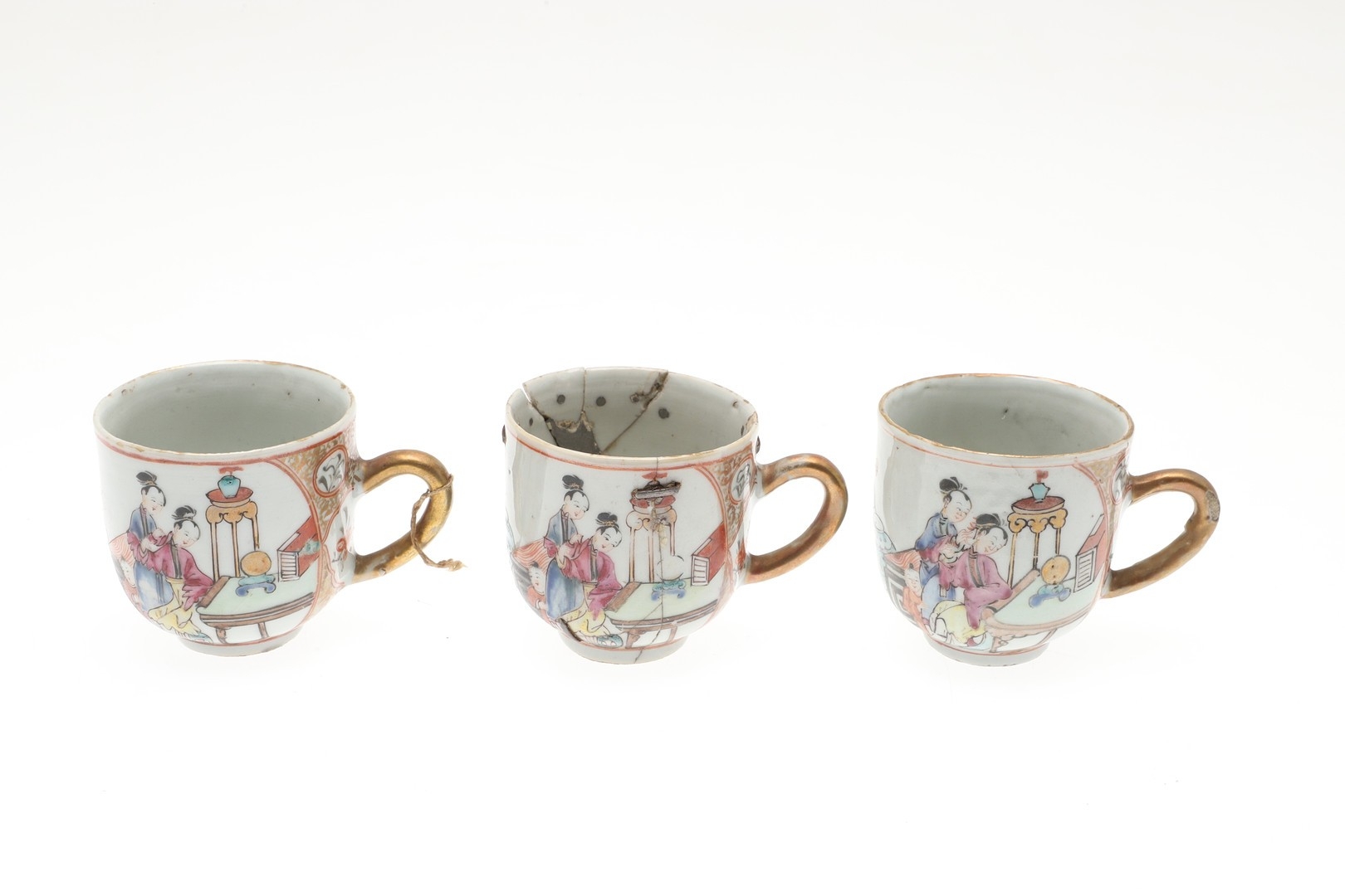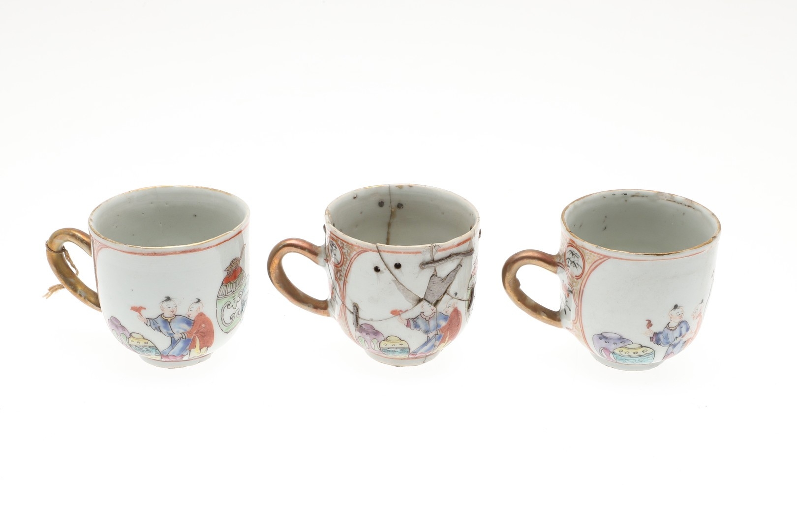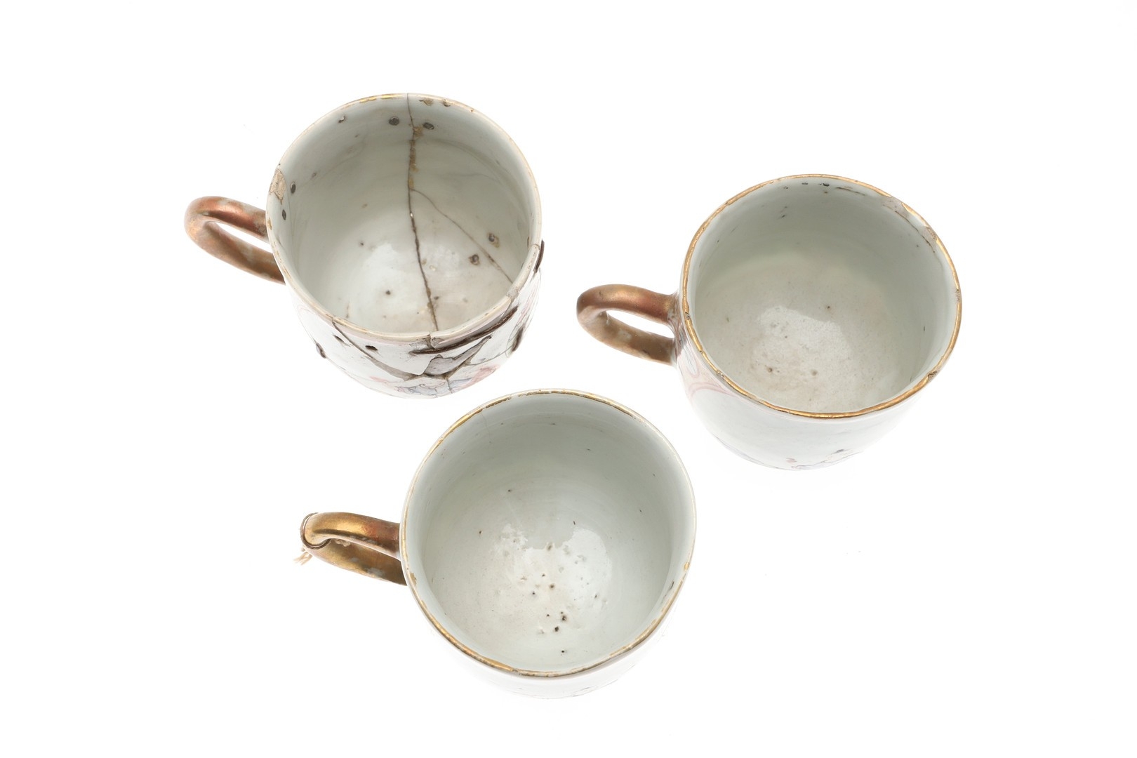 six cups, one smashed and repaired, the others with nibbles and chips to the rims and general wear.