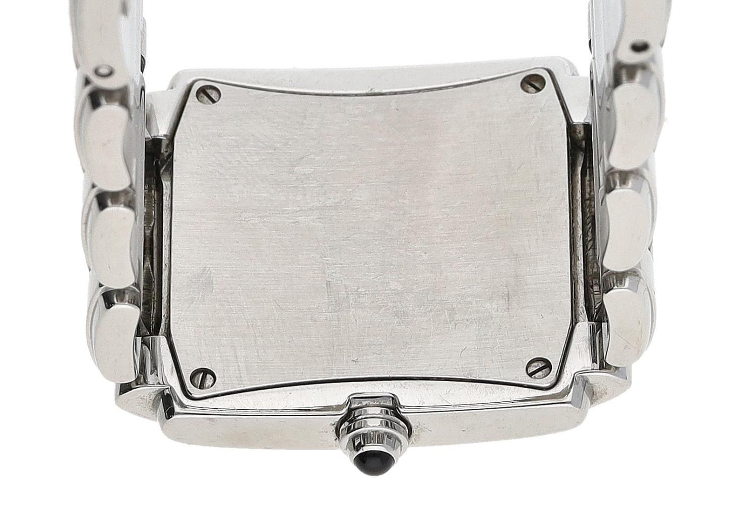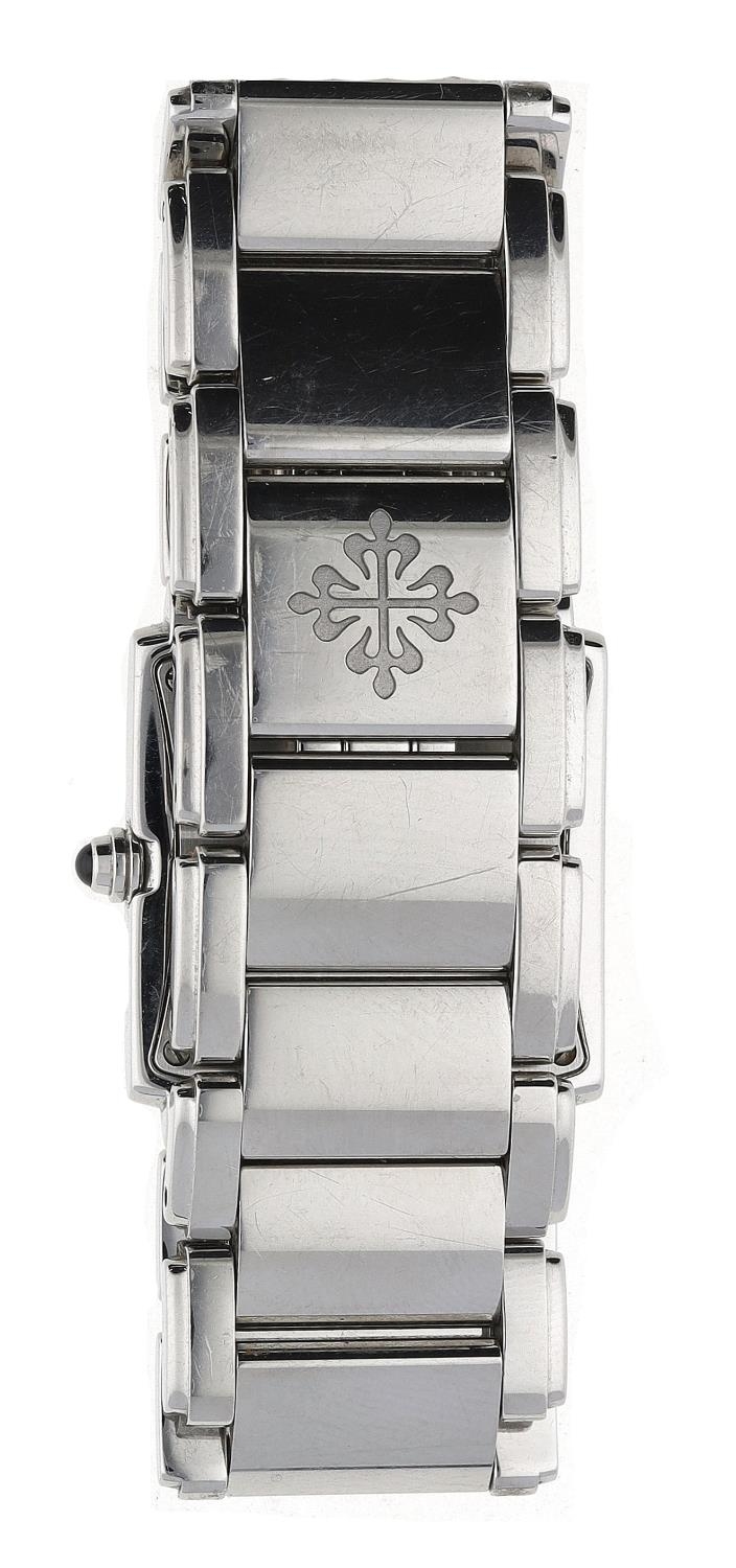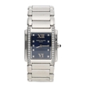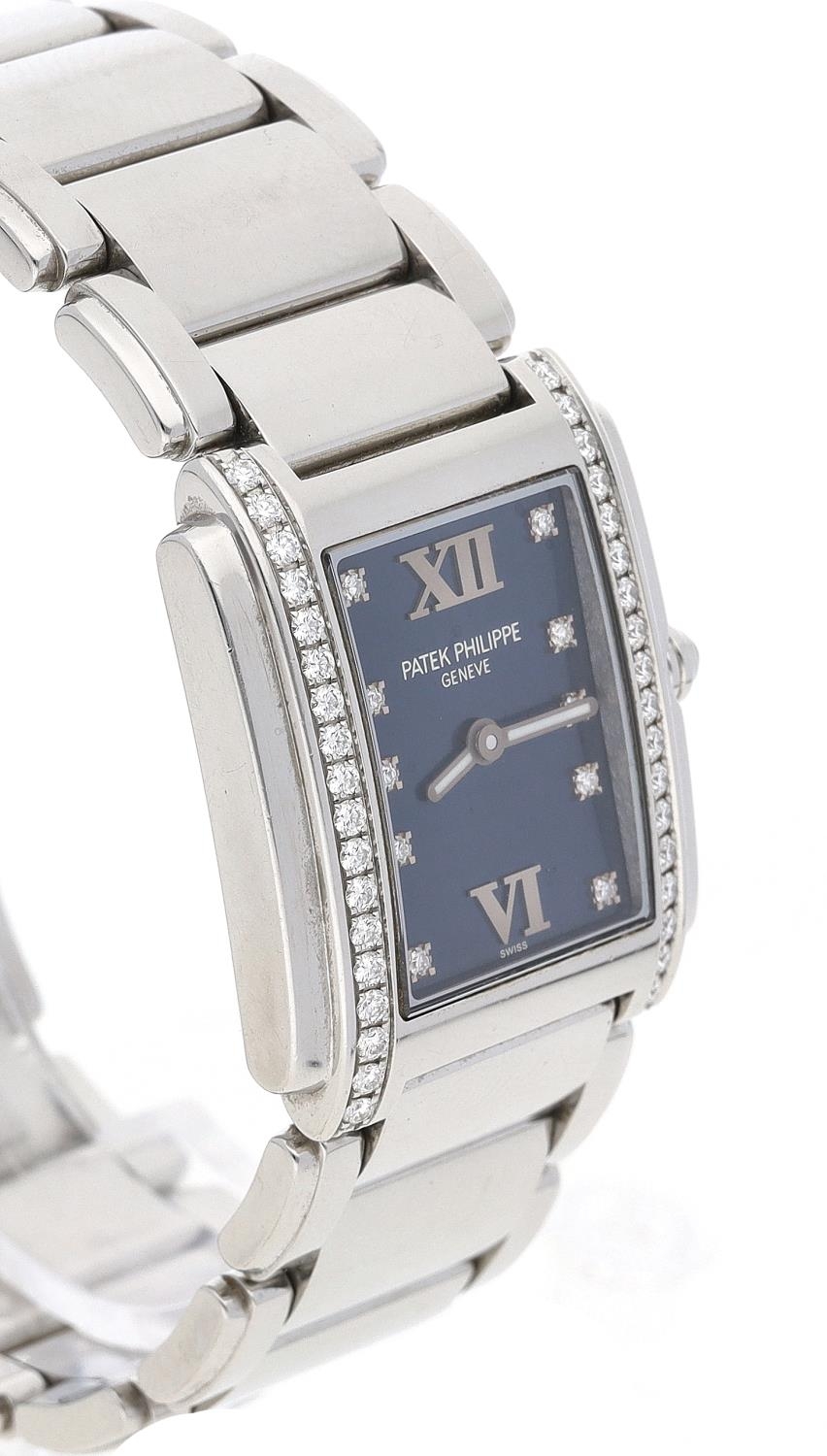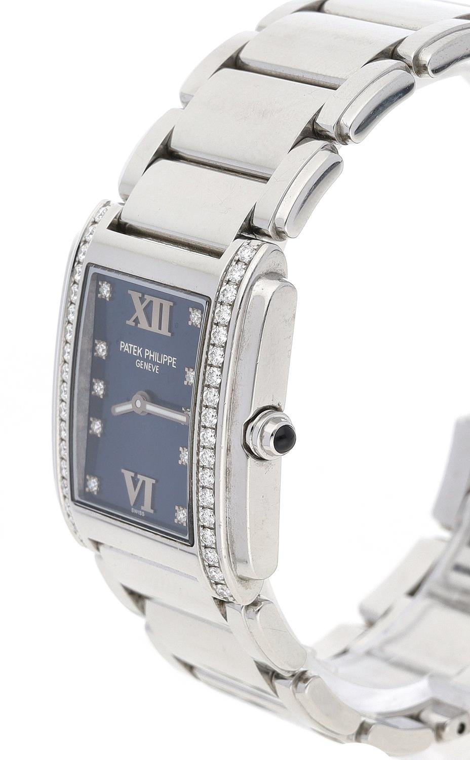Patek Philippe Twenty-4 stainless steel lady's wristwatch, blue dial with diamond markers, diamond set bezel, cabouchon crown, Patek Philippe bracelet with signed butterfly clasp, quartz, 25mm (ref: 308)