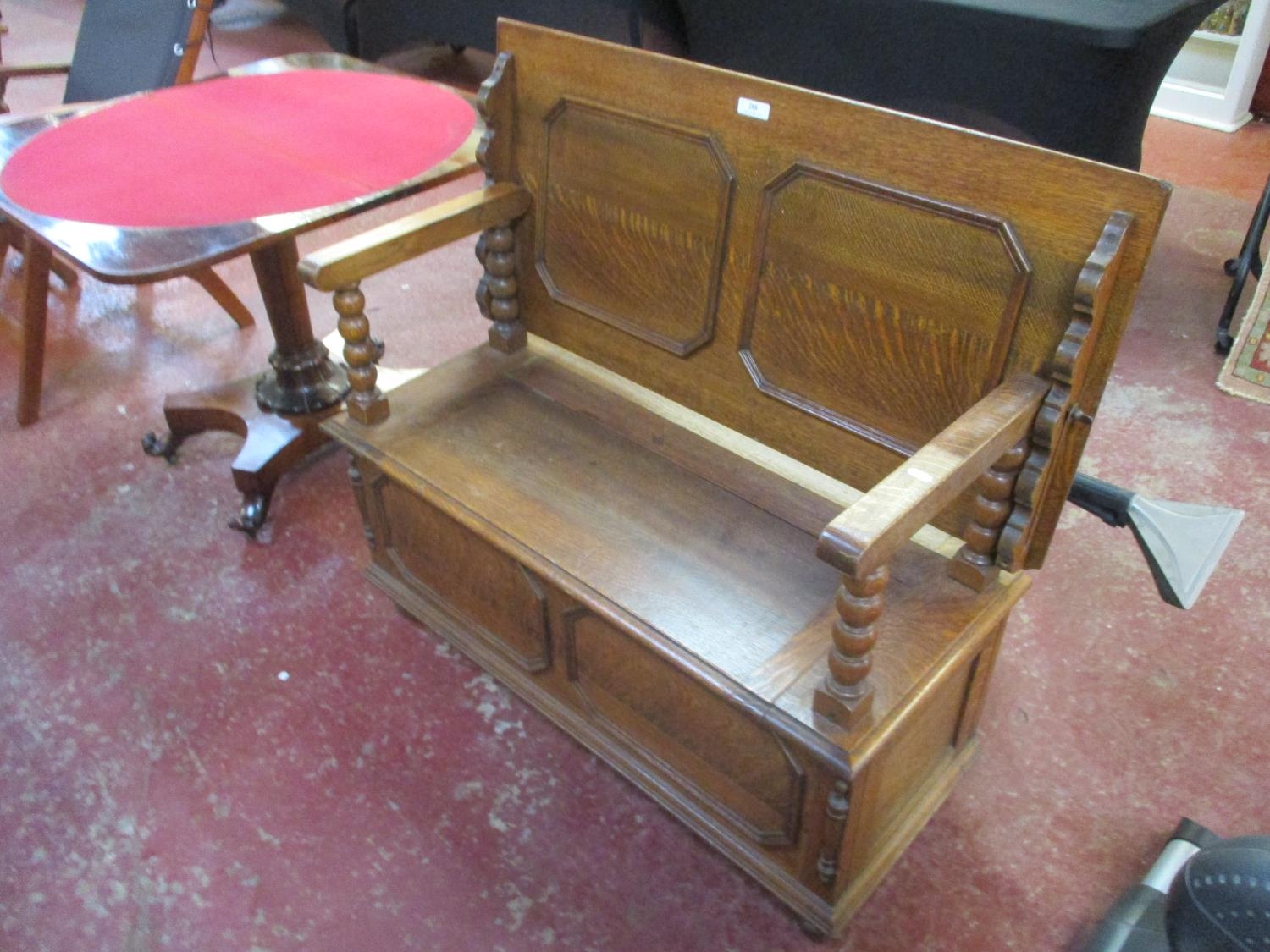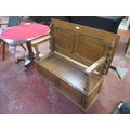 An early twentieth century oak monk's bench, the lifting seat revealing storage within