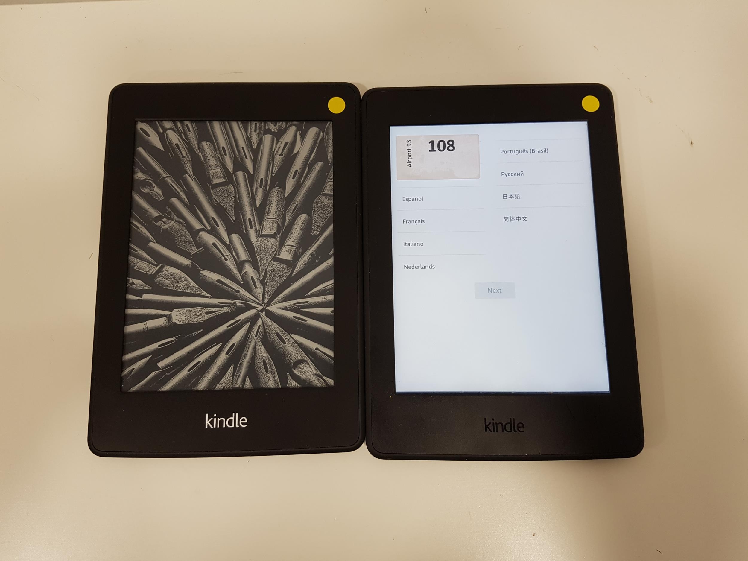 comprising a Paperwhite 3 wifi (2015) serial number G090 G105 5457 04BS; and a Kindle Paperwhite wifi, serial number B024 1502 2476 003E (2)