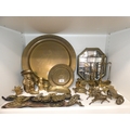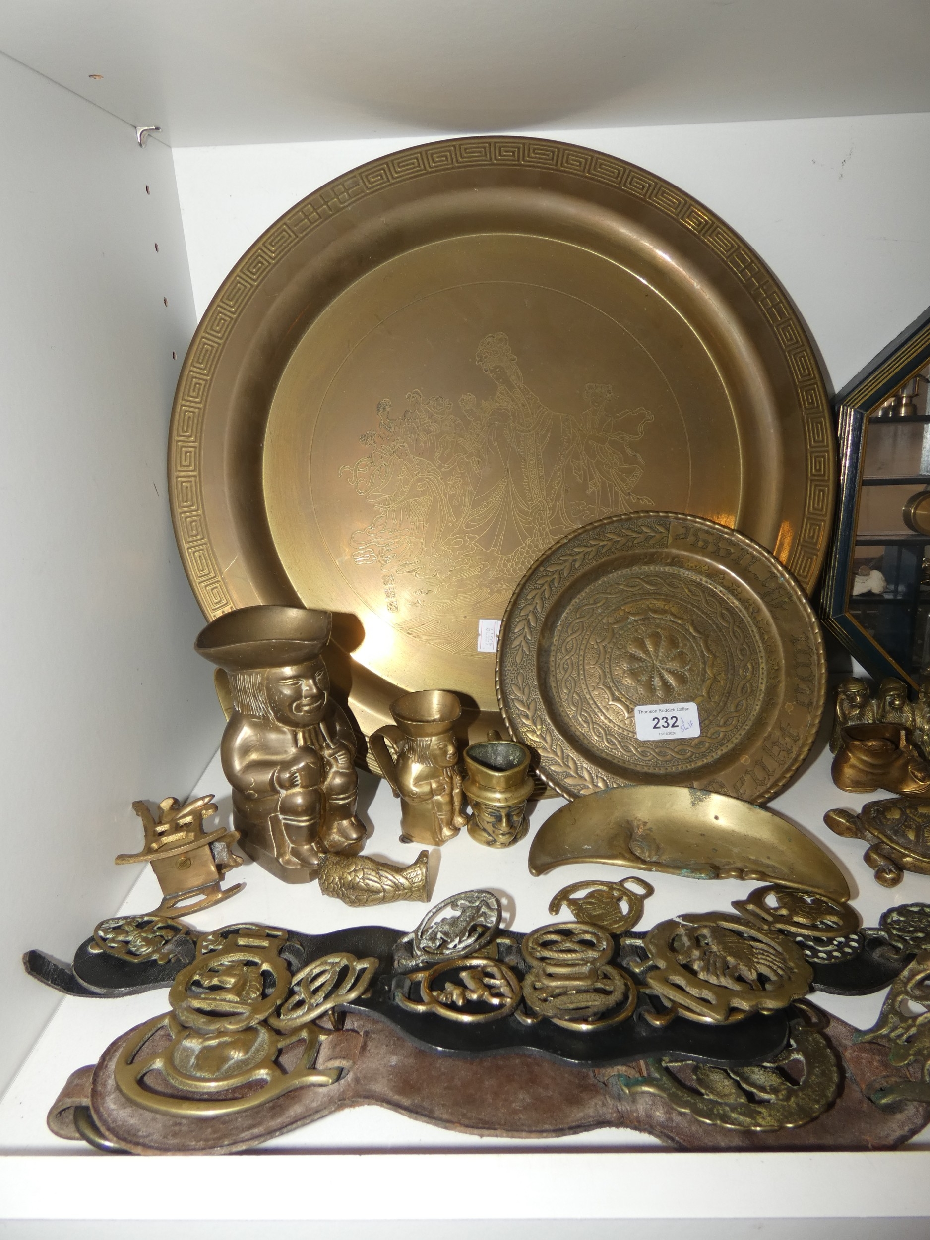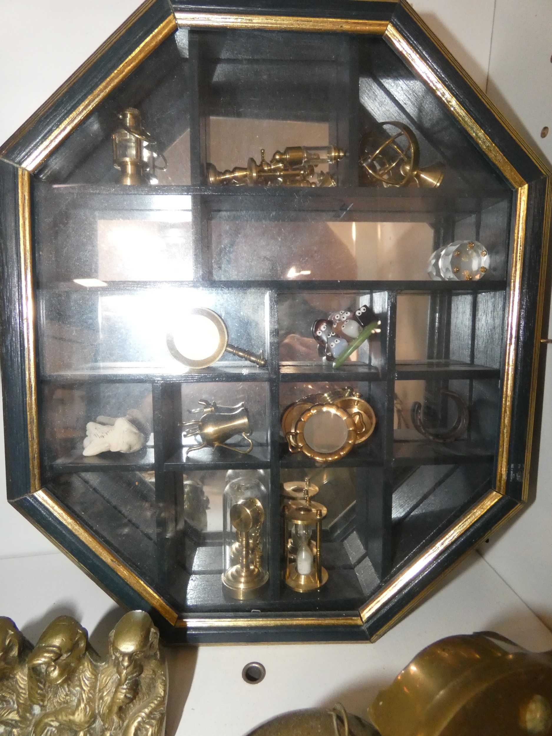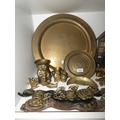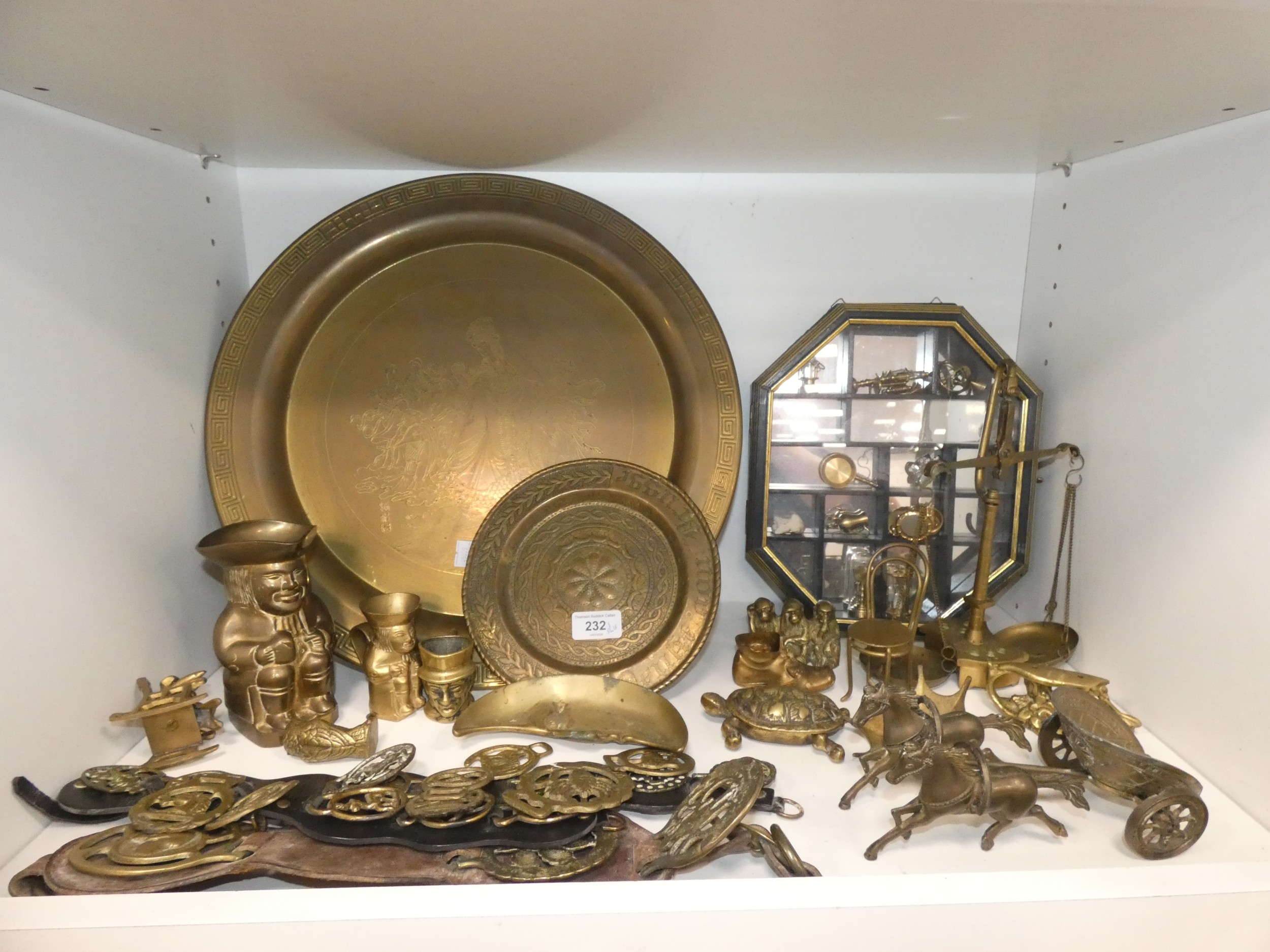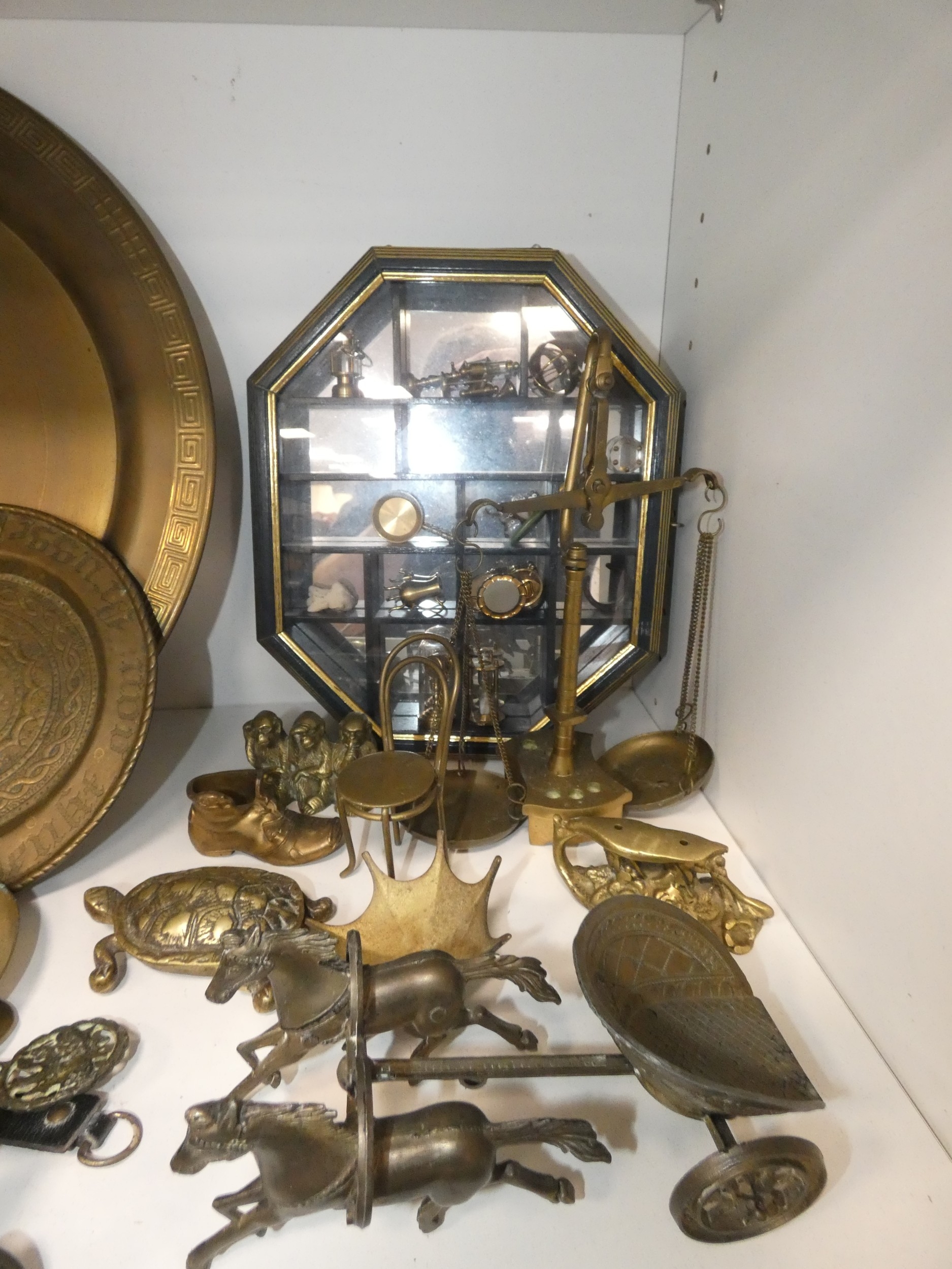 Brassware to include charger, horse brasses, balance scales, animal figures, horse and chariot, and a display case containing miniatures to include miner's lamp, frying pan etc (one shelf).