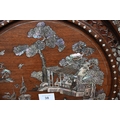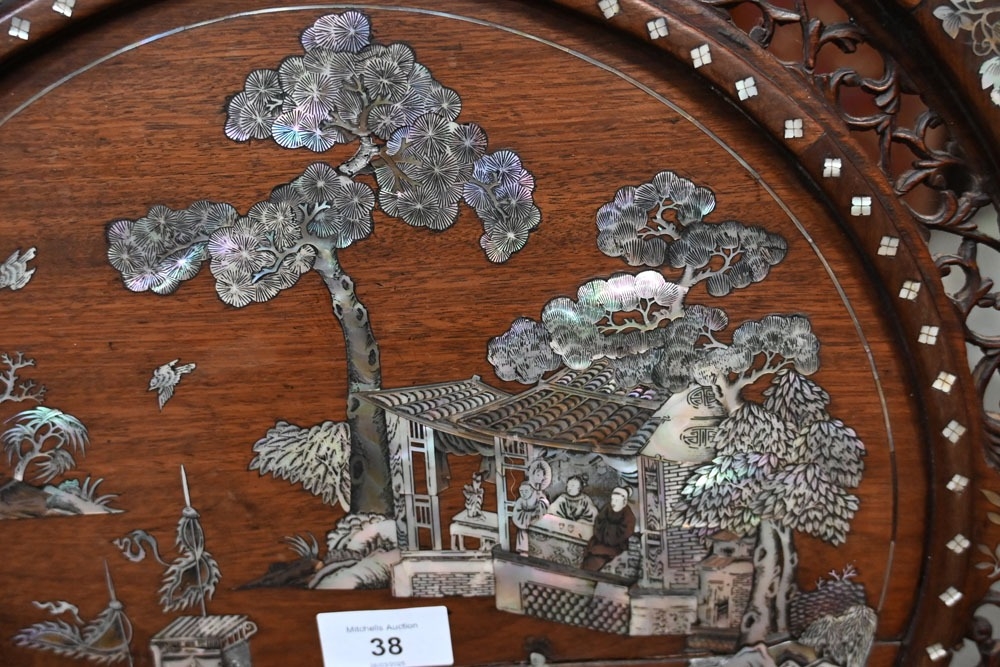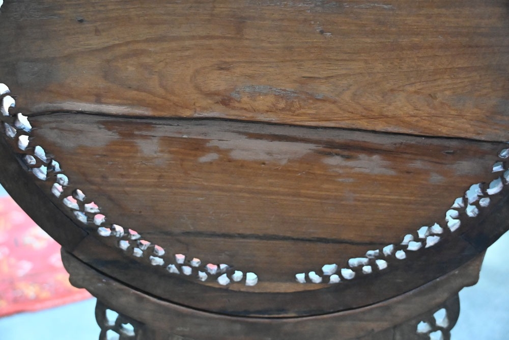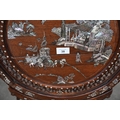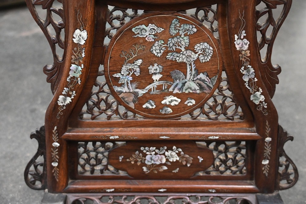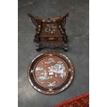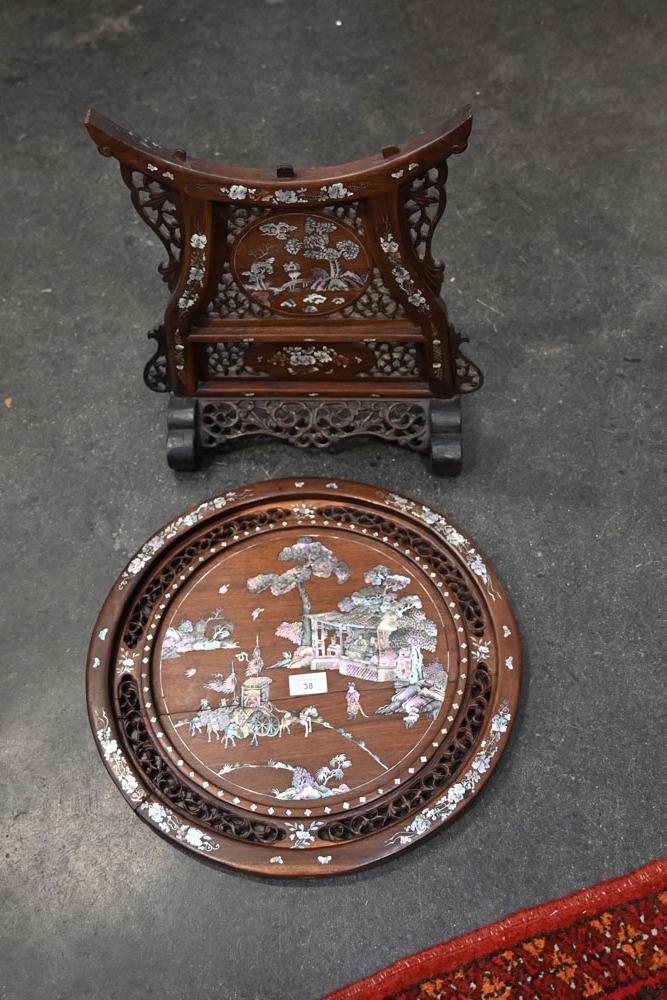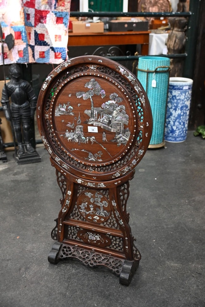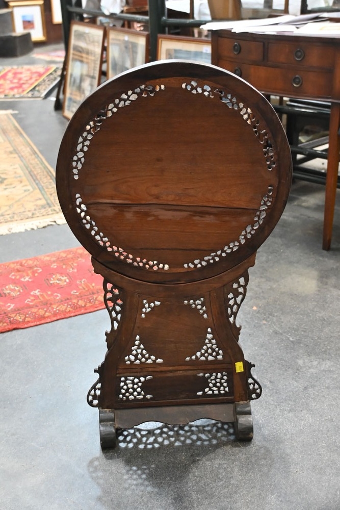 A Chinese hardwood inlaid mother of pearl table screen. Height 85 cm, top diameter 46 cm.