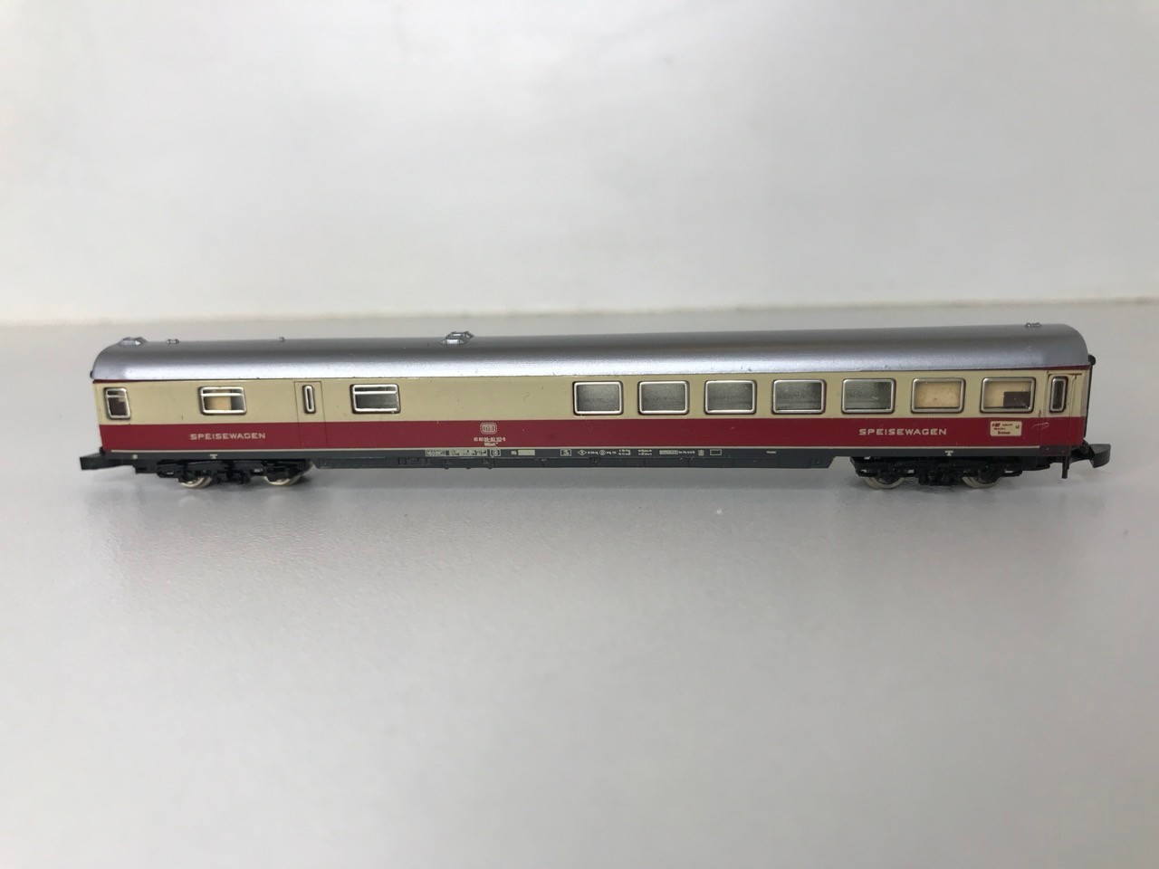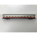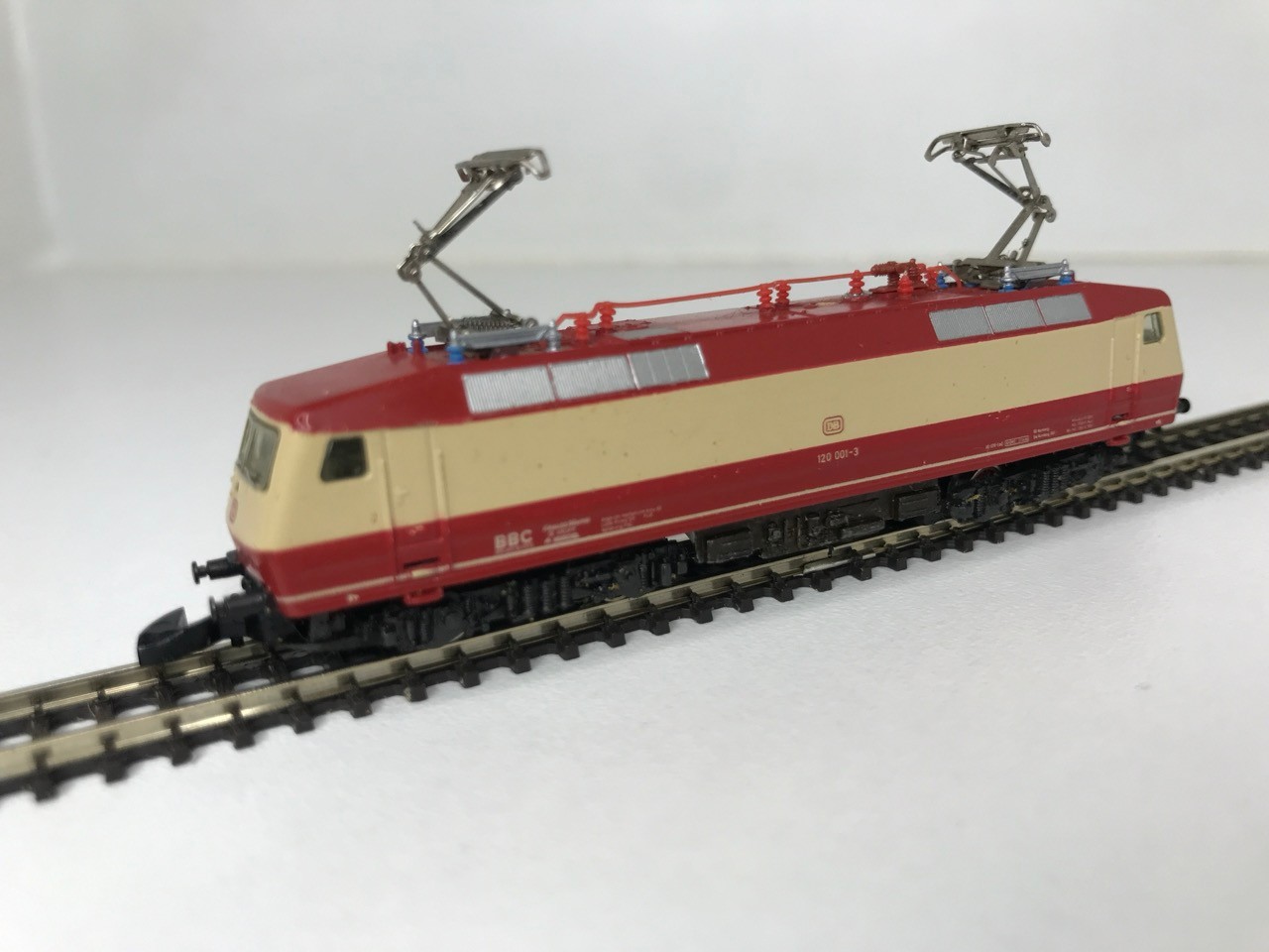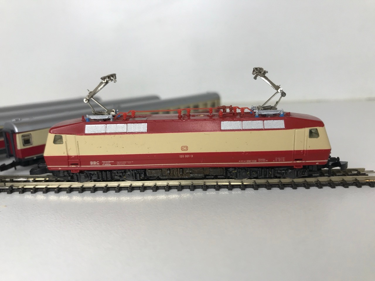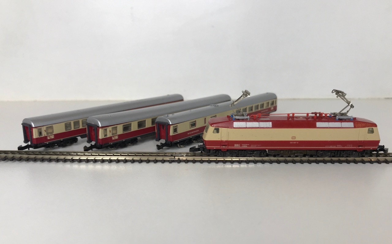 Z Gauge/Scale Marklin mini-club 8853 DB 120 001-3 Electric Locomotive and Rake of Three matching colour DB coach/Car (Speisewagen) Few marks to Roofs, Pantographs extend but do not clip in down position, Loco body loose from chassis, Bi-directional Lights, Unboxed, Instructions, Tested Runners - Loco Good, Coaches Good (4) 80g