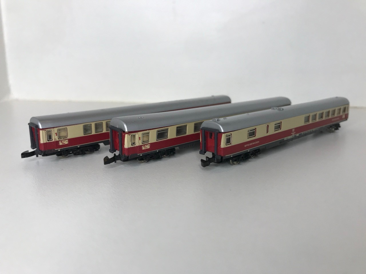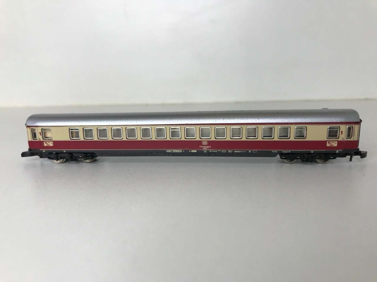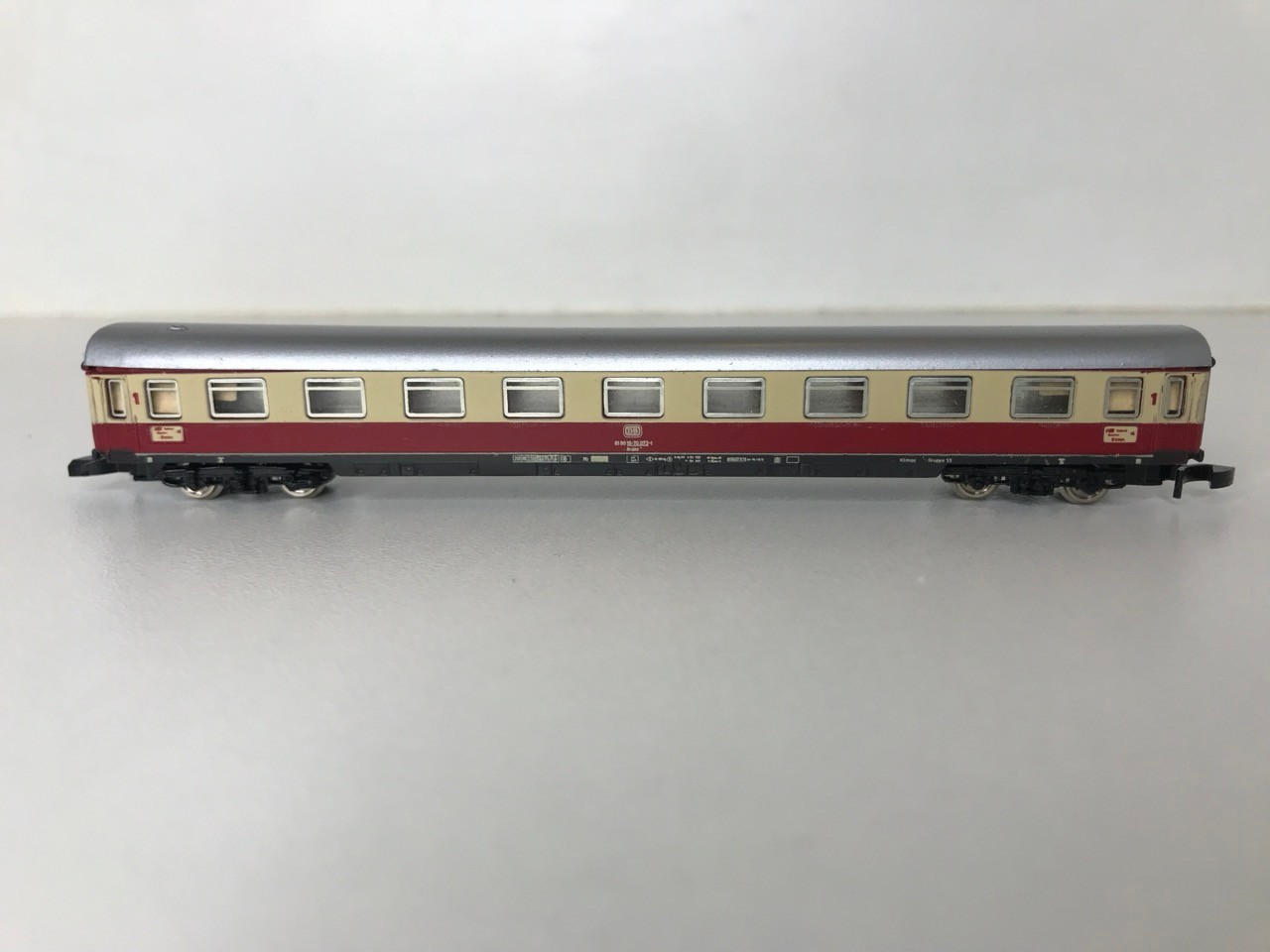 Z Gauge/Scale Marklin mini-club 8853 DB 120 001-3 Electric Locomotive and Rake of Three matching colour DB coach/Car (Speisewagen) Few marks to Roofs, Pantographs extend but do not clip in down position, Loco body loose from chassis, Bi-directional Lights, Unboxed, Instructions, Tested Runners - Loco Good, Coaches Good (4) 80g