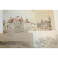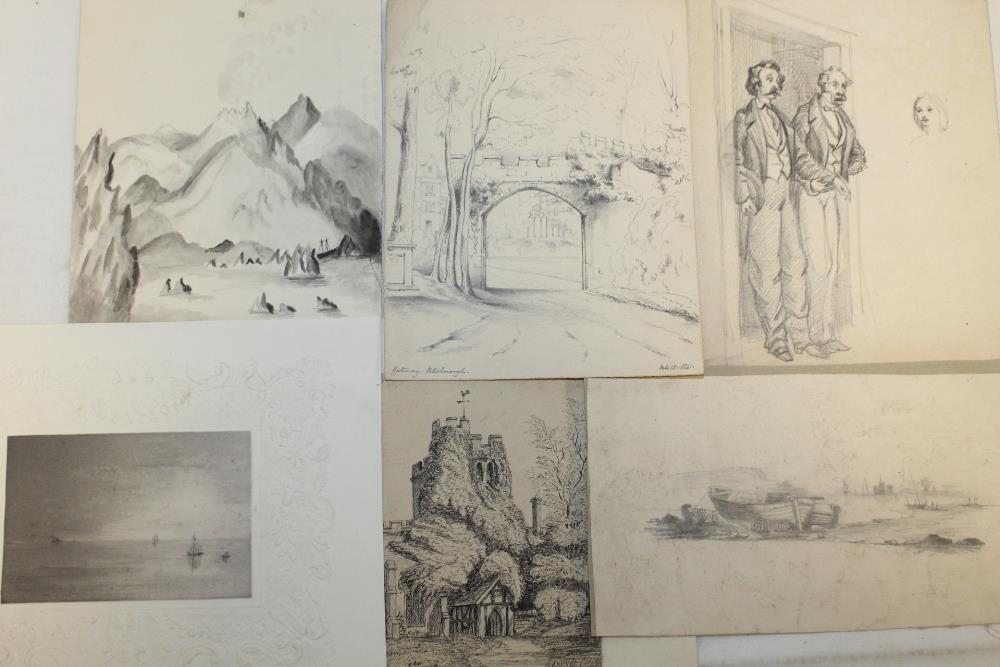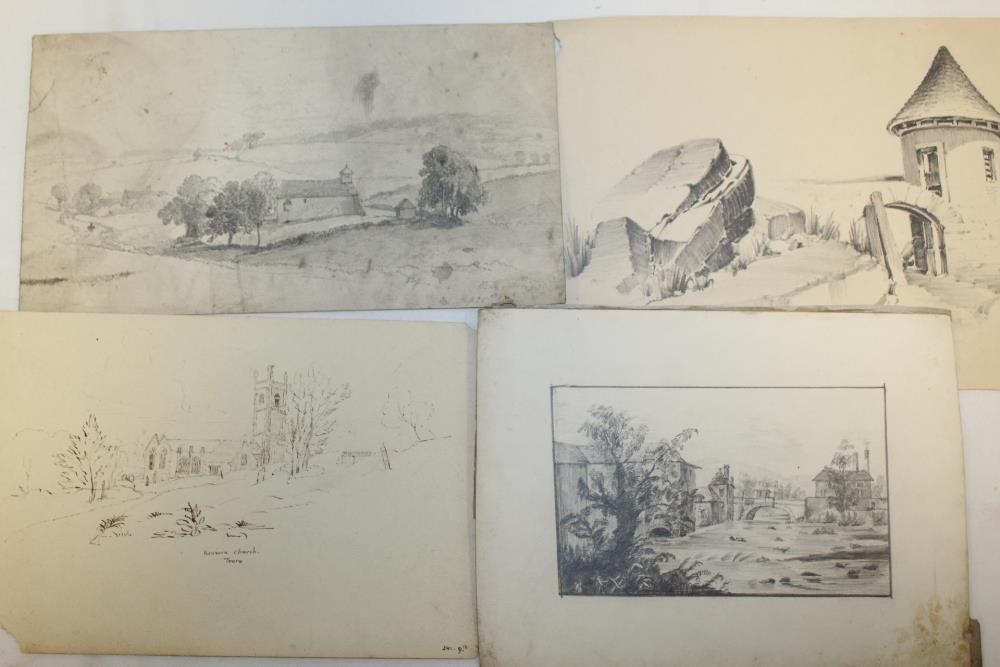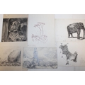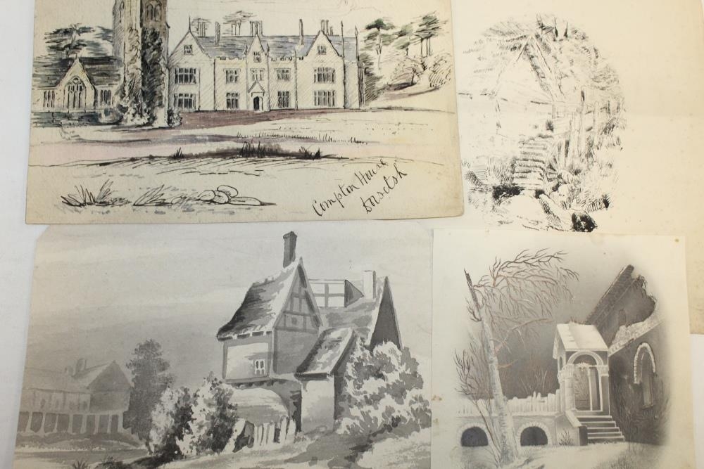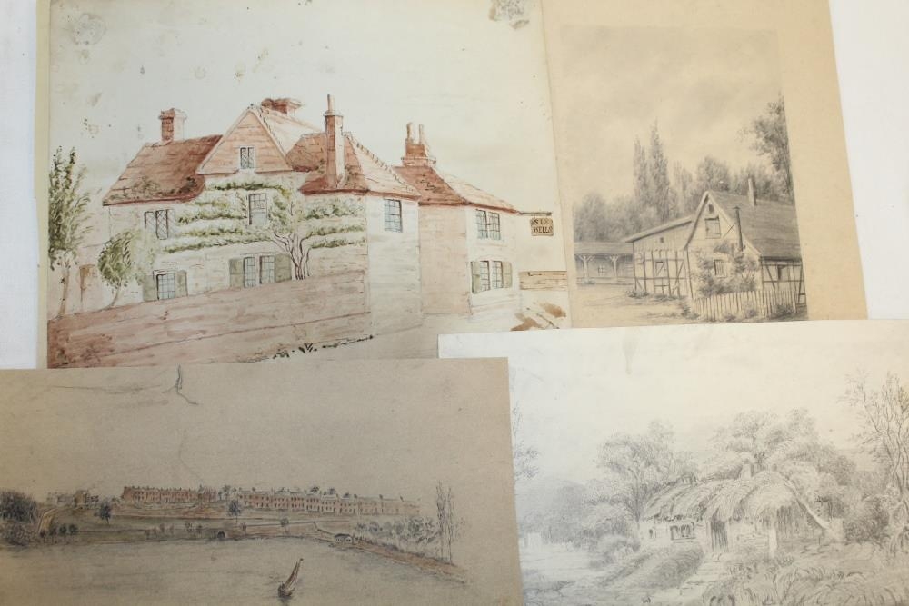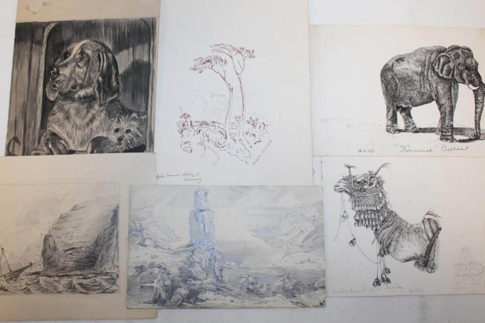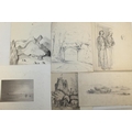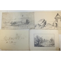 A FOLDER OF UNFRAMED ANTIQUE AND VINTAGE PENCIL DRAWINGS AND WATERCOLOURS ETC. TO INCLUDE ANIMAL STUDIES, LANDSCAPES ETC.