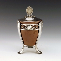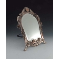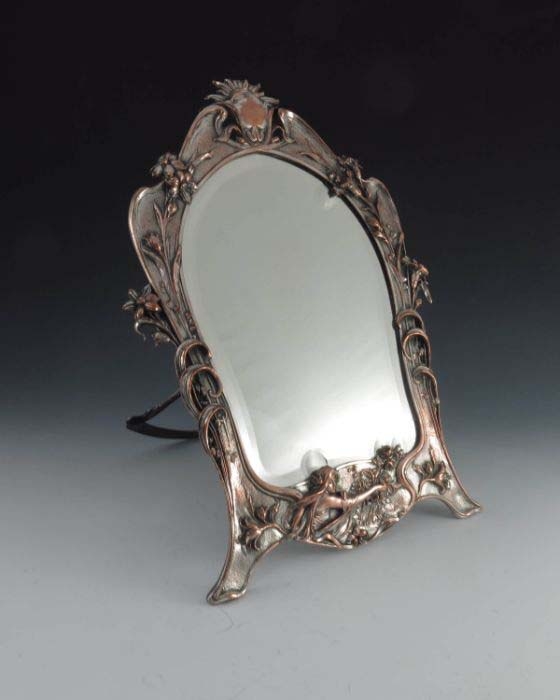 An Arts and Crafts silver plated easel mirror, Walker and Hall, circa 1904, the bevelled and arched glass within a relief moulded frame in the Art Nouveau style, of sinuous maiden and flowers, surmounted by cartouche and sunrise motif, 47.5cm high