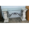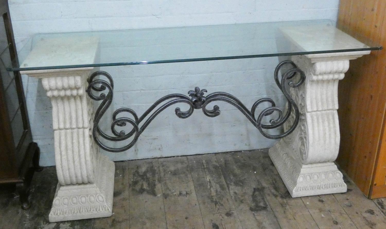 A simulated carved stone and plate glass top hall table with wrought iron detail