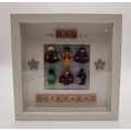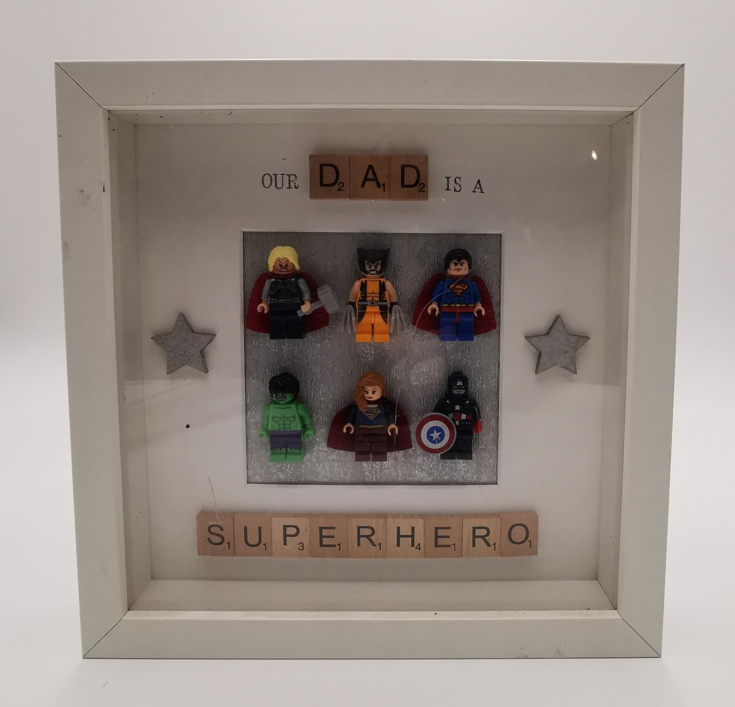 FRAMED 25cm x 25cm LEGO SUPER ERO SERIES SIX LEGO SUPER HEROES (Plastic Cover Is Cracked)