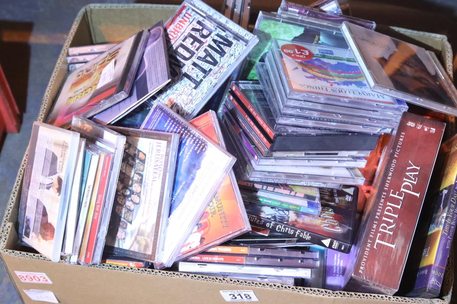 Box containing a large selection of various CDs and a quantity of DVDs. Not available for in-house P&P