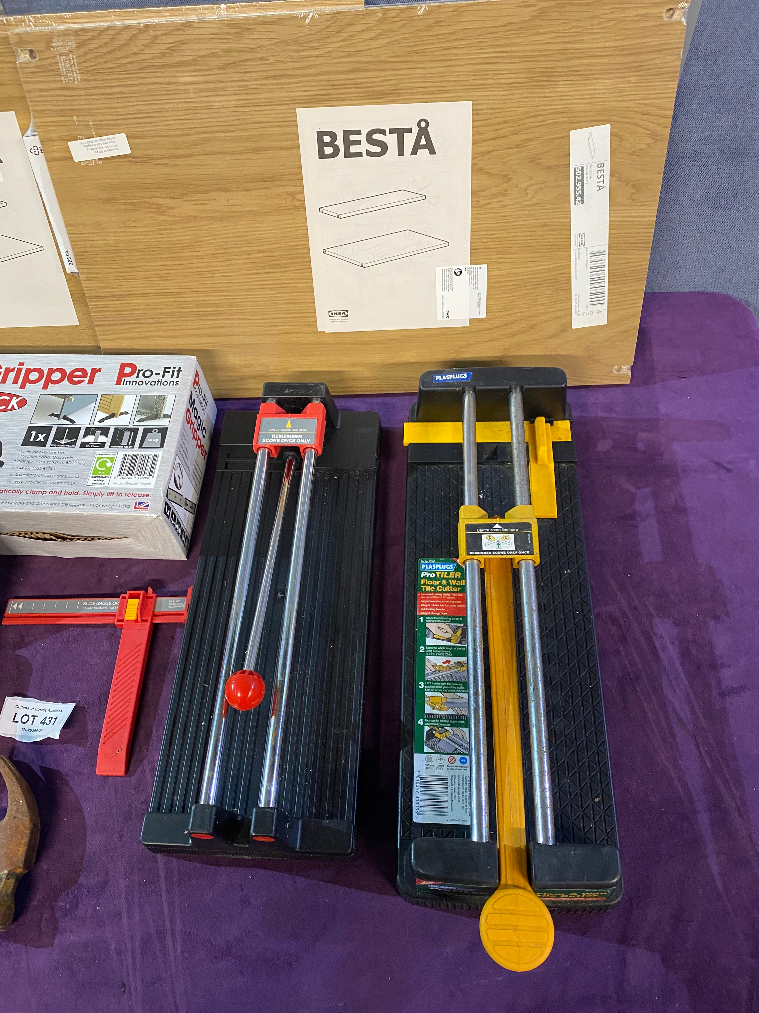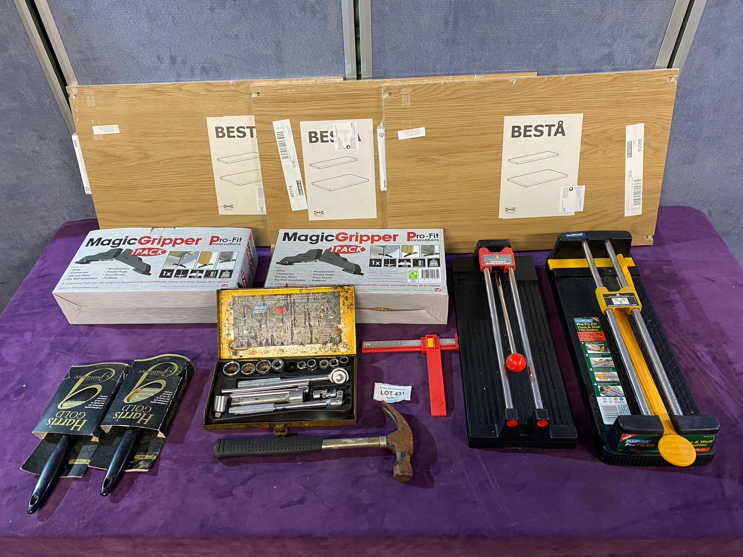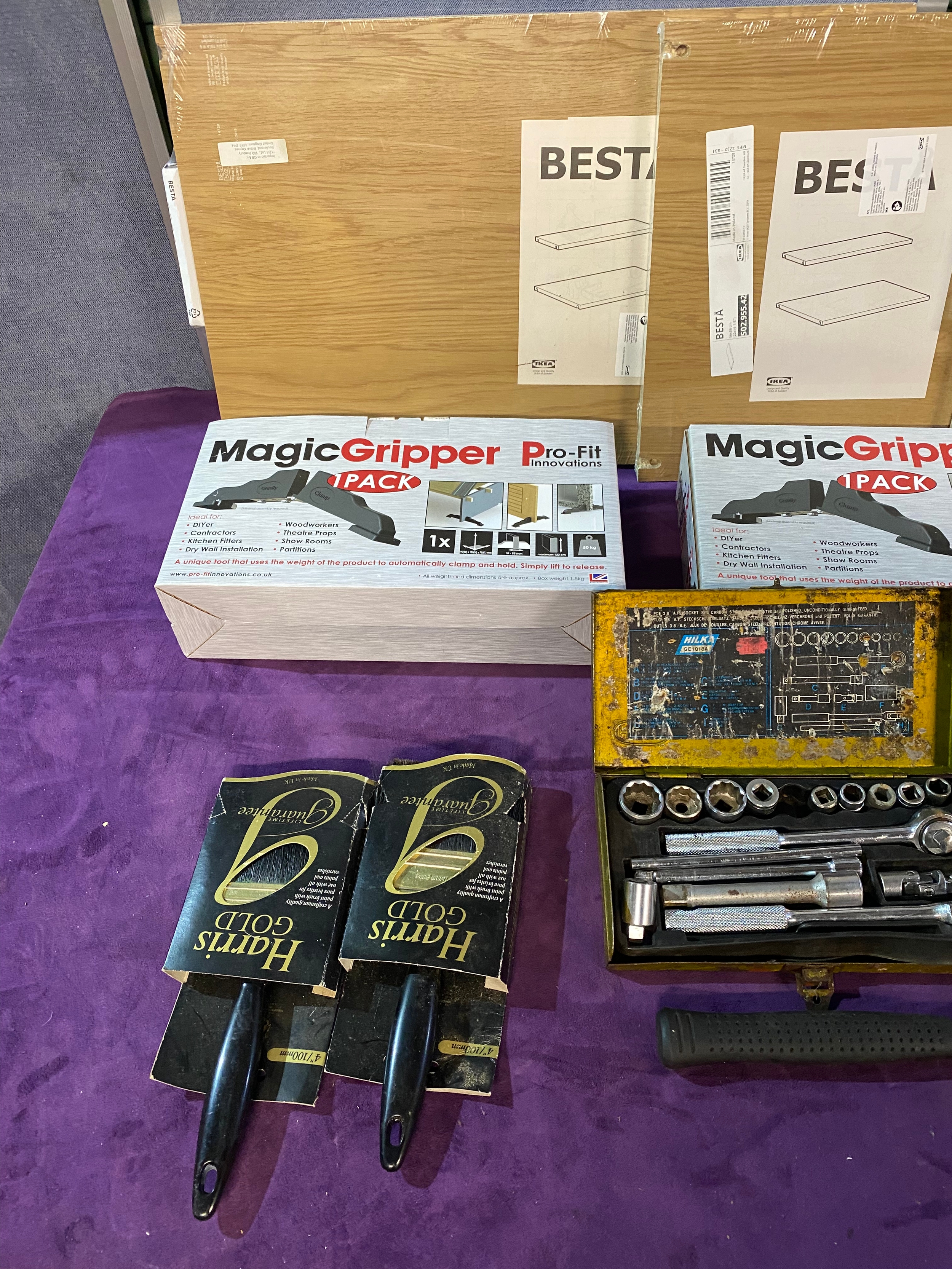 Two Magic gripper sets, Two Harris gold paintbrushes, 2 tile cutting tools and some Ikea Besta Shelves
