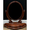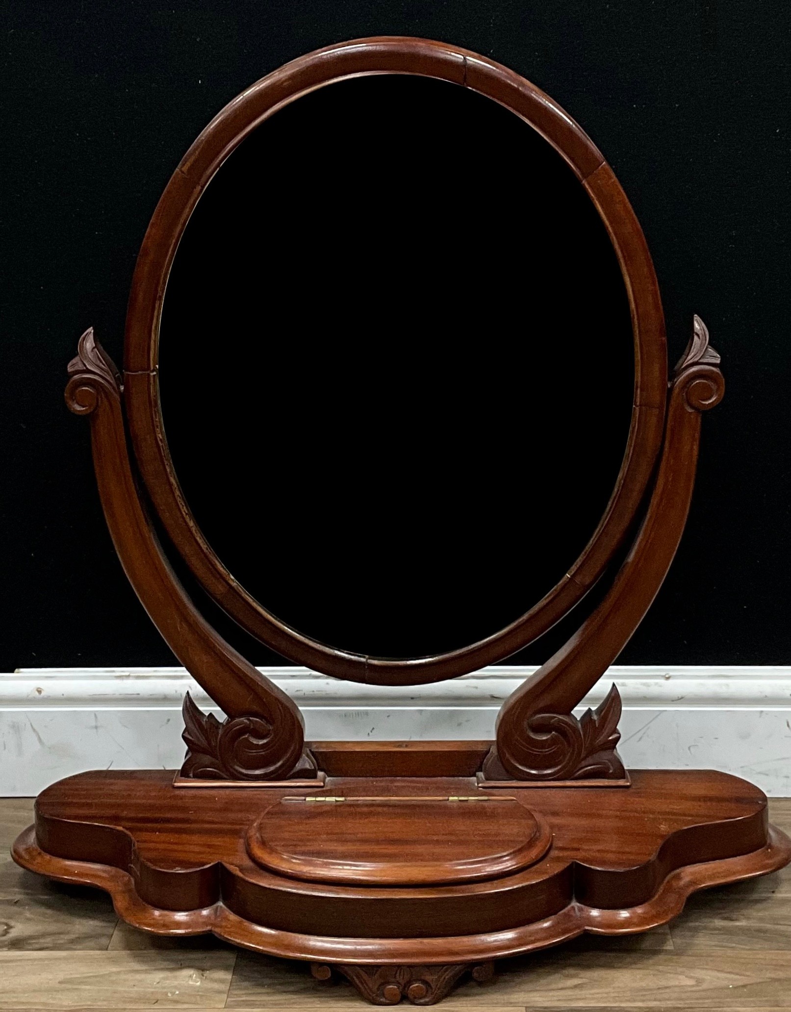A Victorian mahogany dressing table mirror, hinged oval looking glass with acanthus capped supports, shaped base holding a hinged niche, scrolling acanthus feet, 71cm x 64cm x 25cm, c.1890