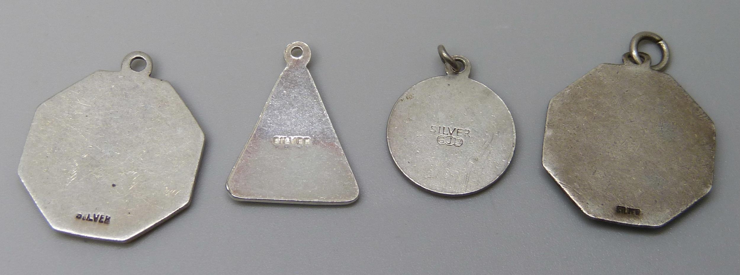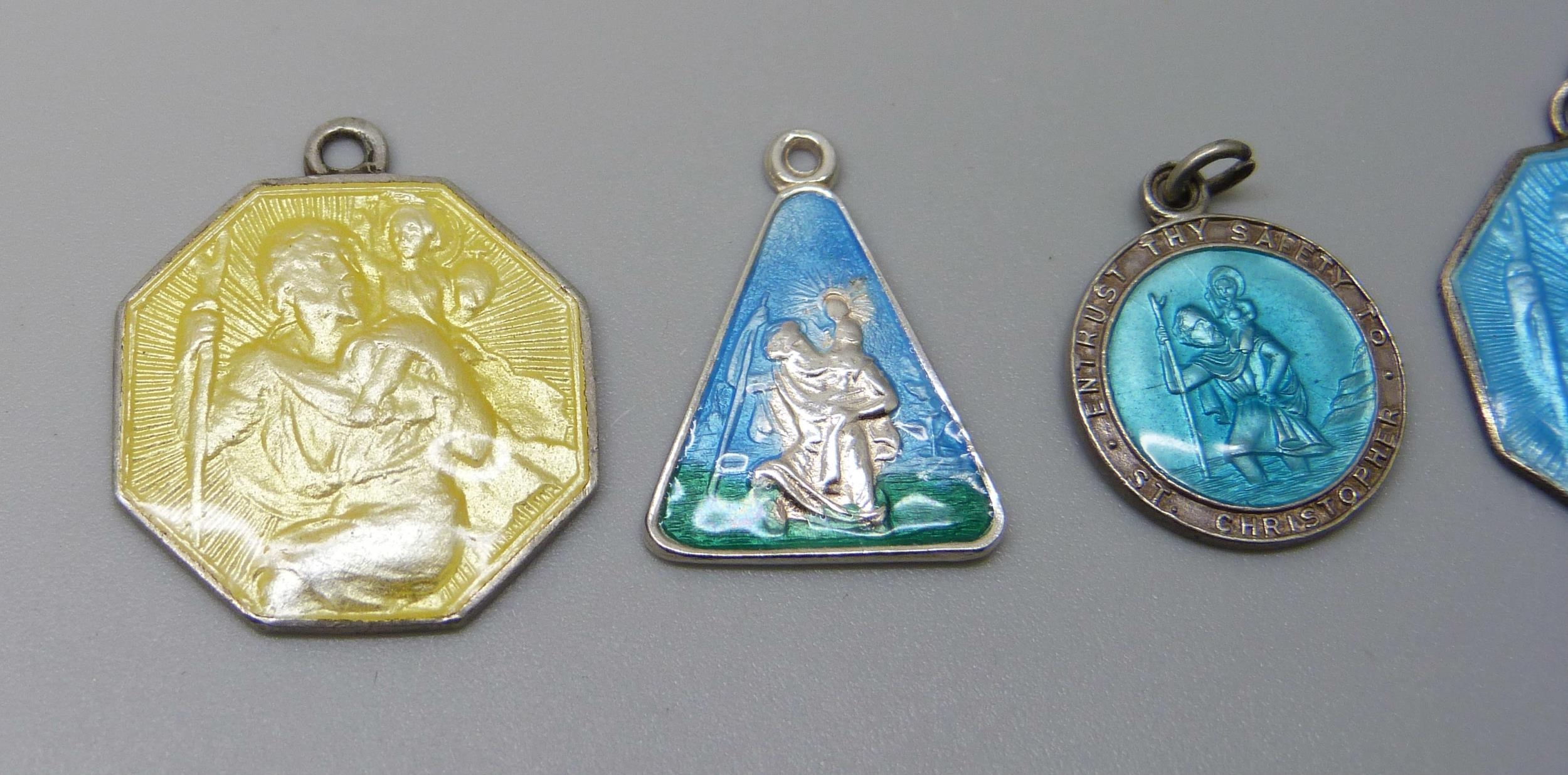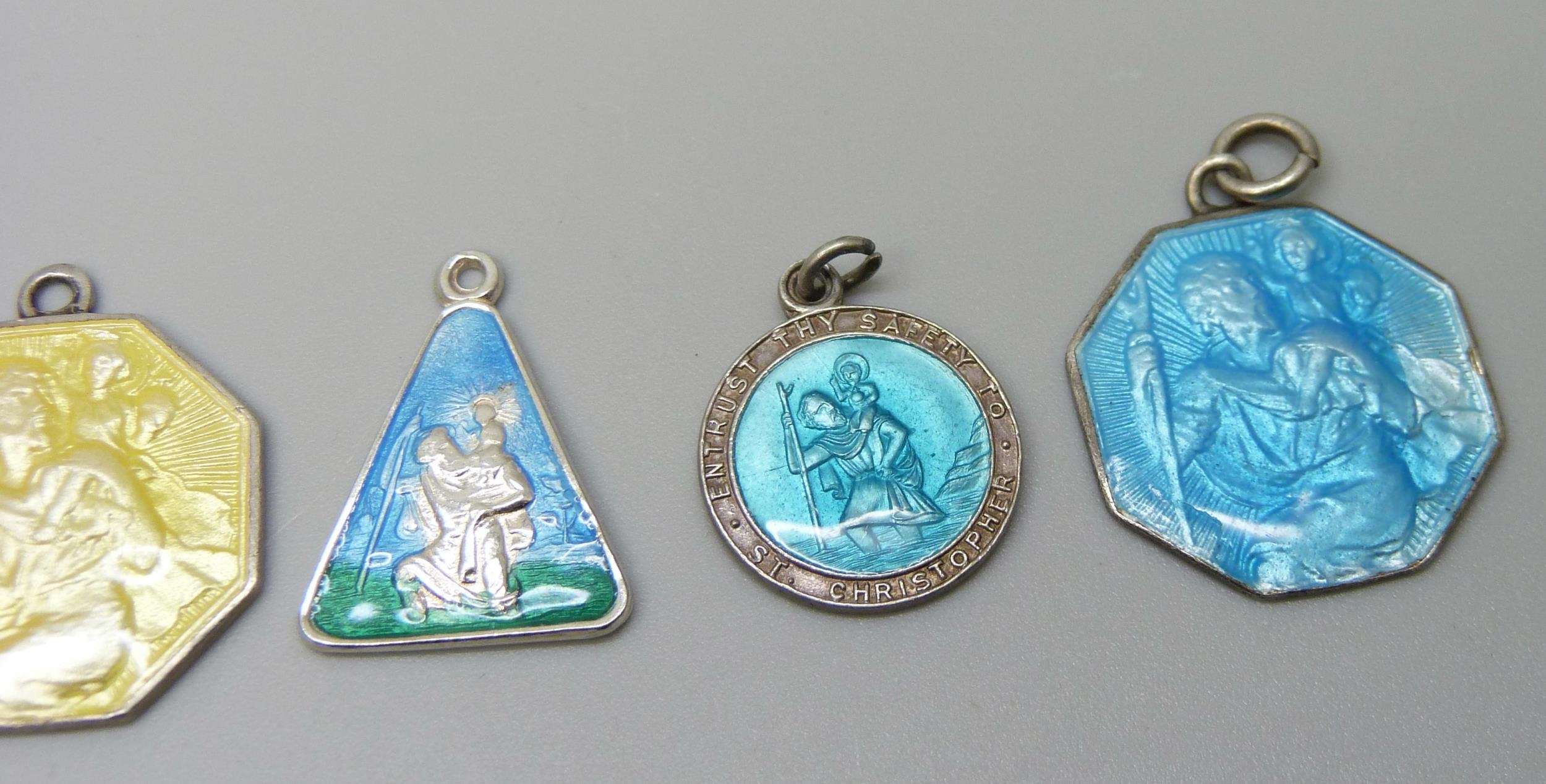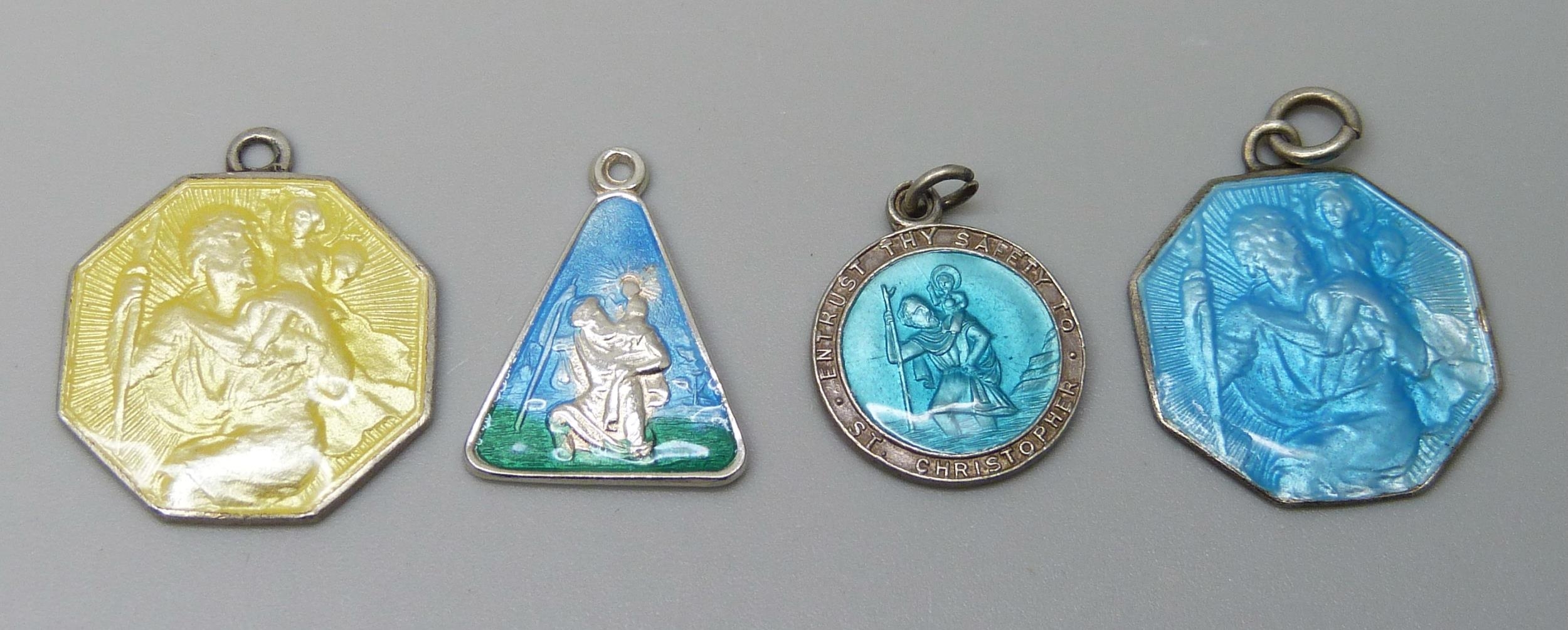 Four silver and enamelled St. Christopher pendants including a Georg Jensen example, largest 2.1cm