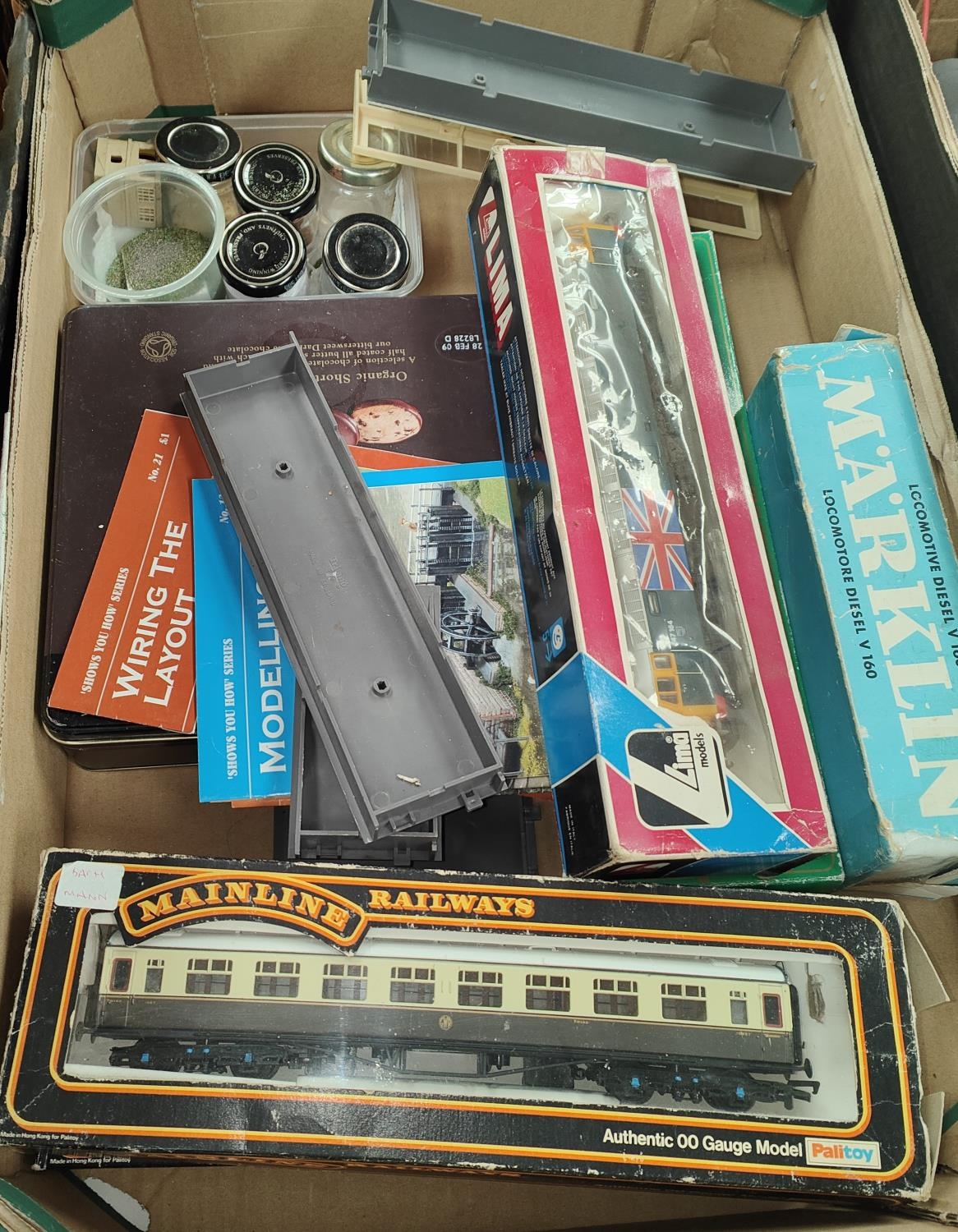 00 gauge in 2 boxes, rolling stock, coaches inc. 2 mainline, 4 engines inc. Marklin V160, Mehano Boeing Vertol, Lima 20 5210 Diesel, Wiring etc