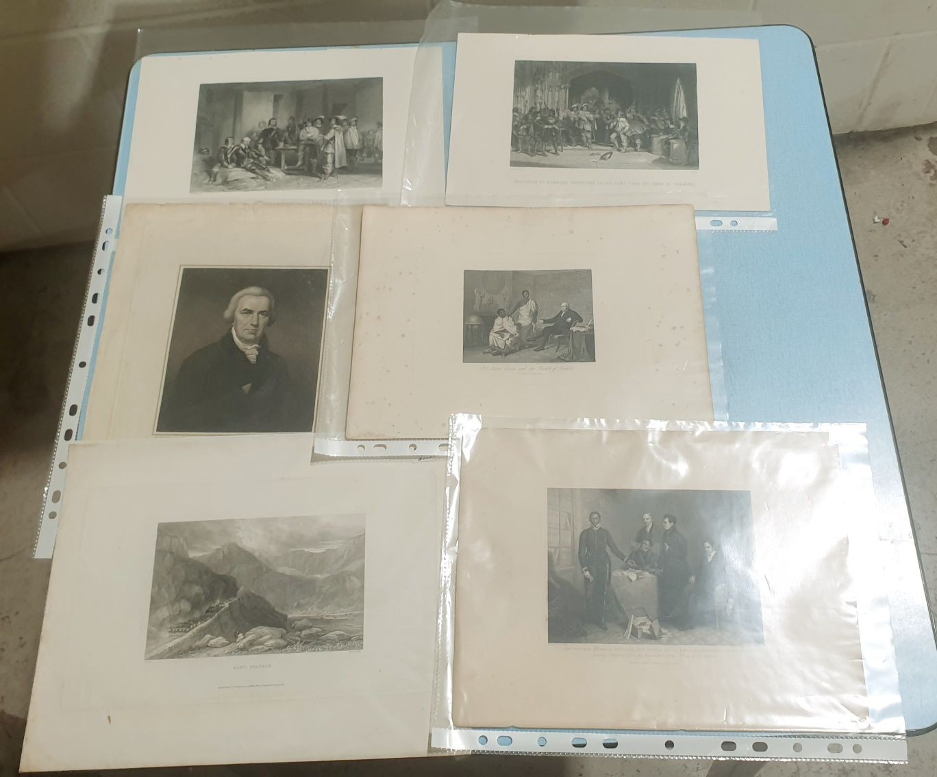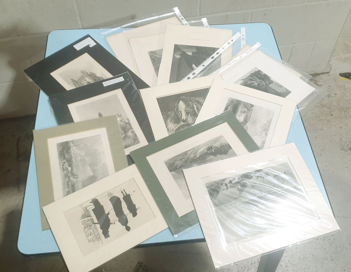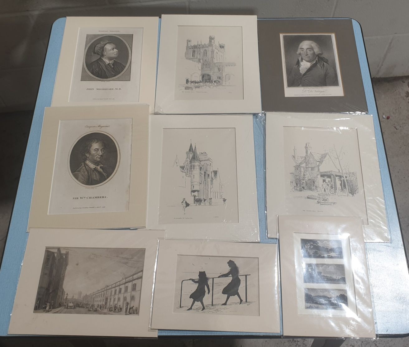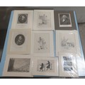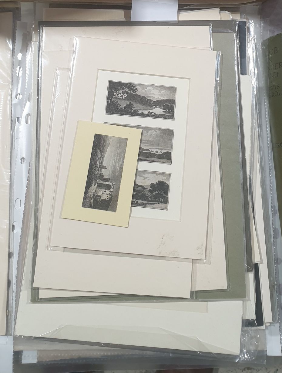 A selection of 19th century engravings and prints, many mounted together with early 1900s pencil drawings of Oxford Collages. UK shipping £14.