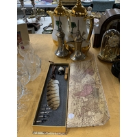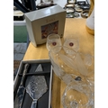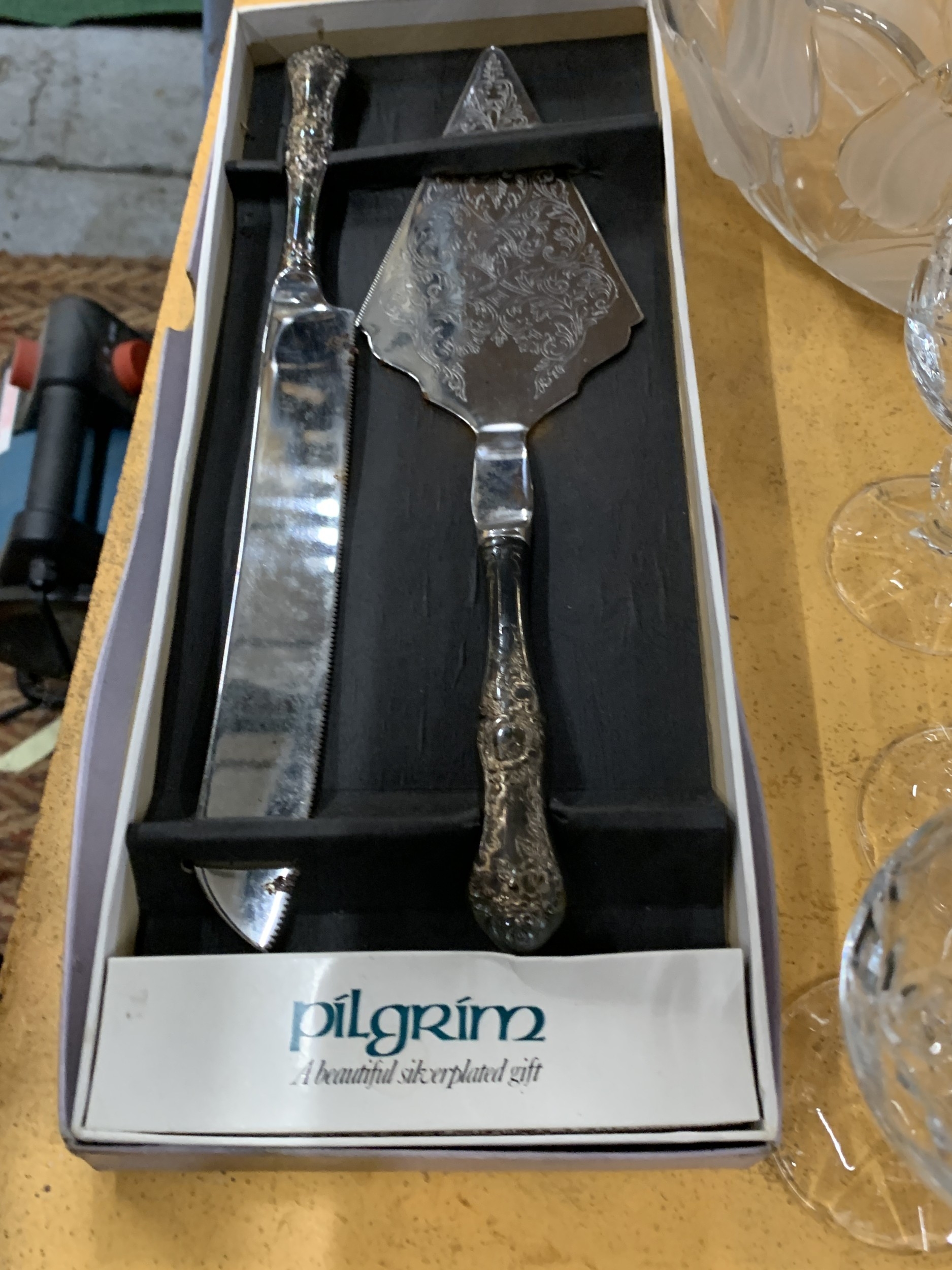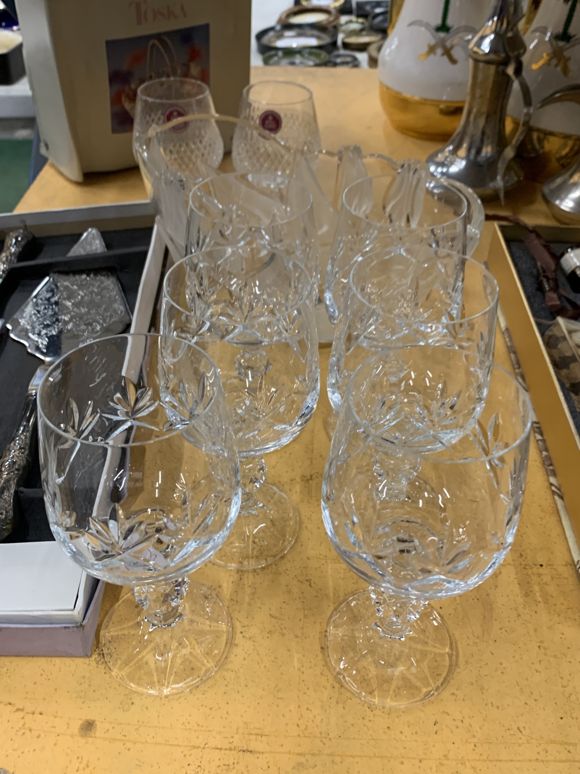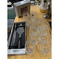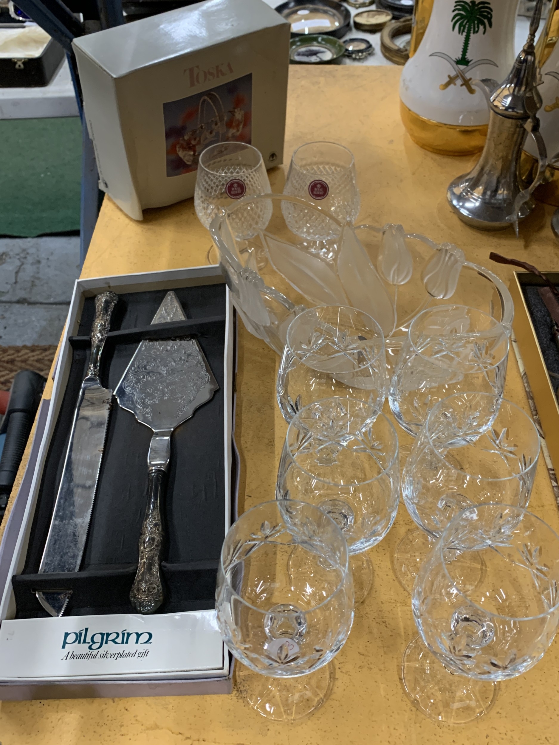 A QUANTITY OF GLASSWARE TO INCLUDE WINE GLASSES, A BOXED 'TOSKA' BASKET, BOXED PILGRIM CAKE SERVING SET, ETC