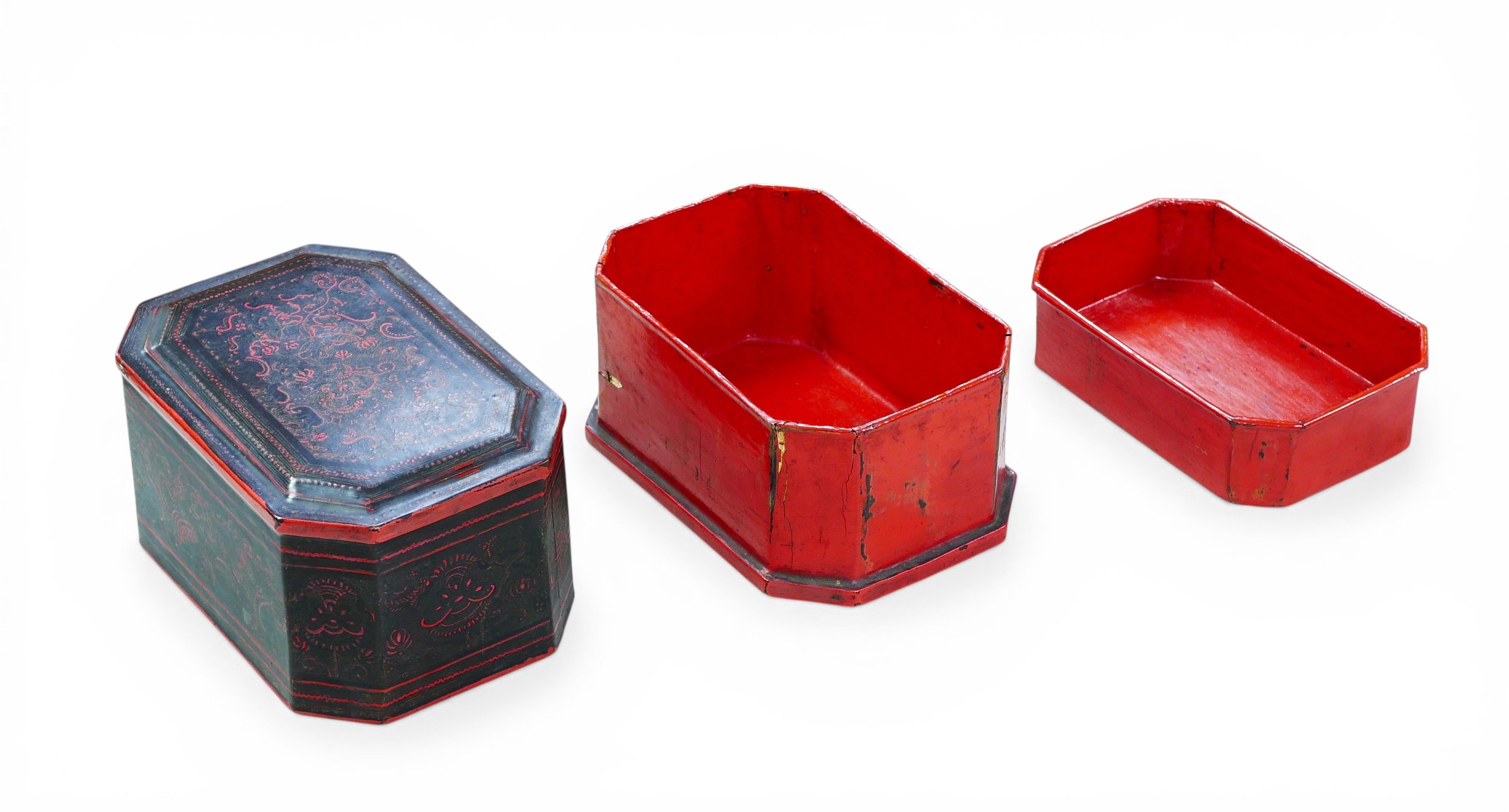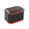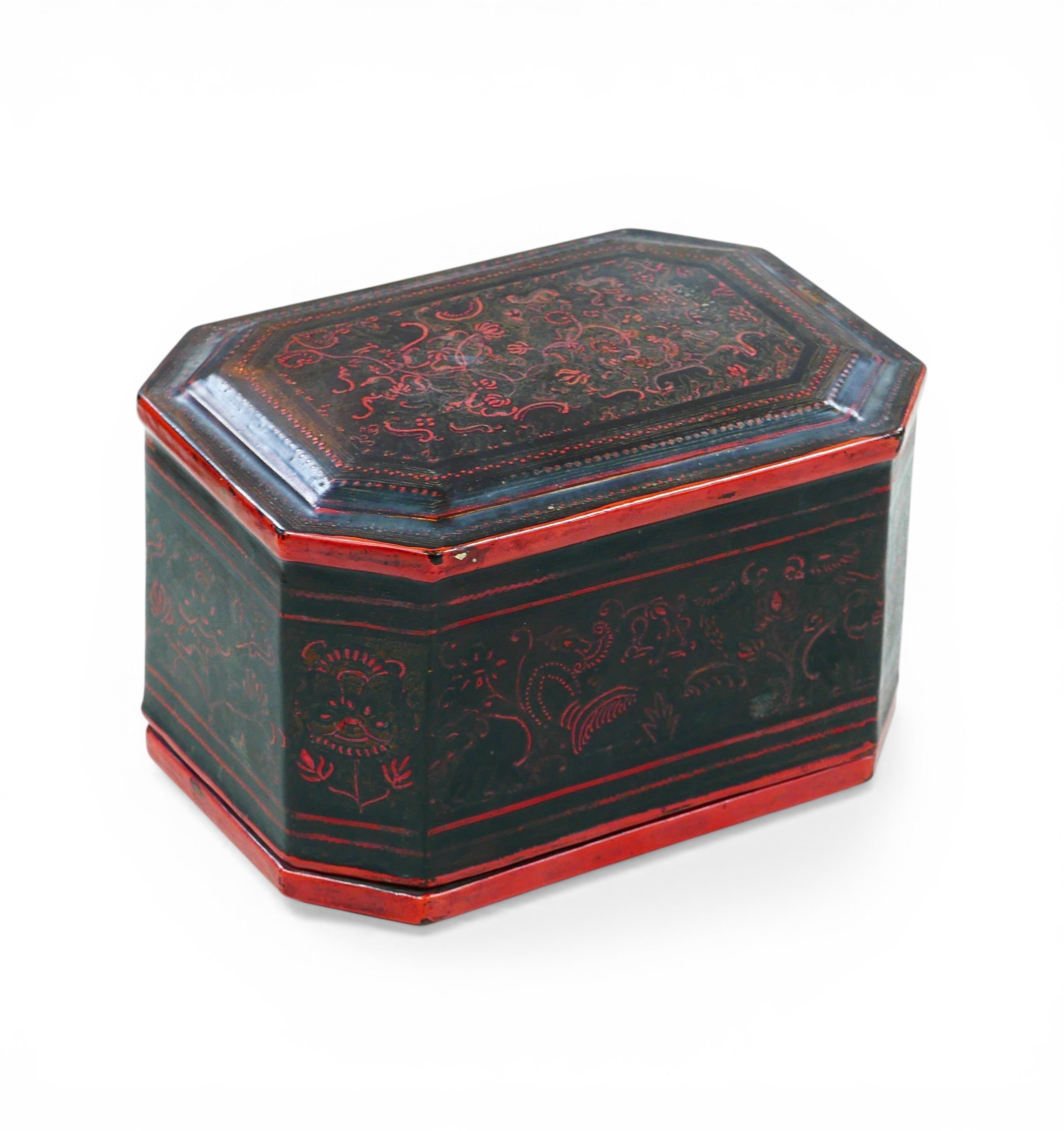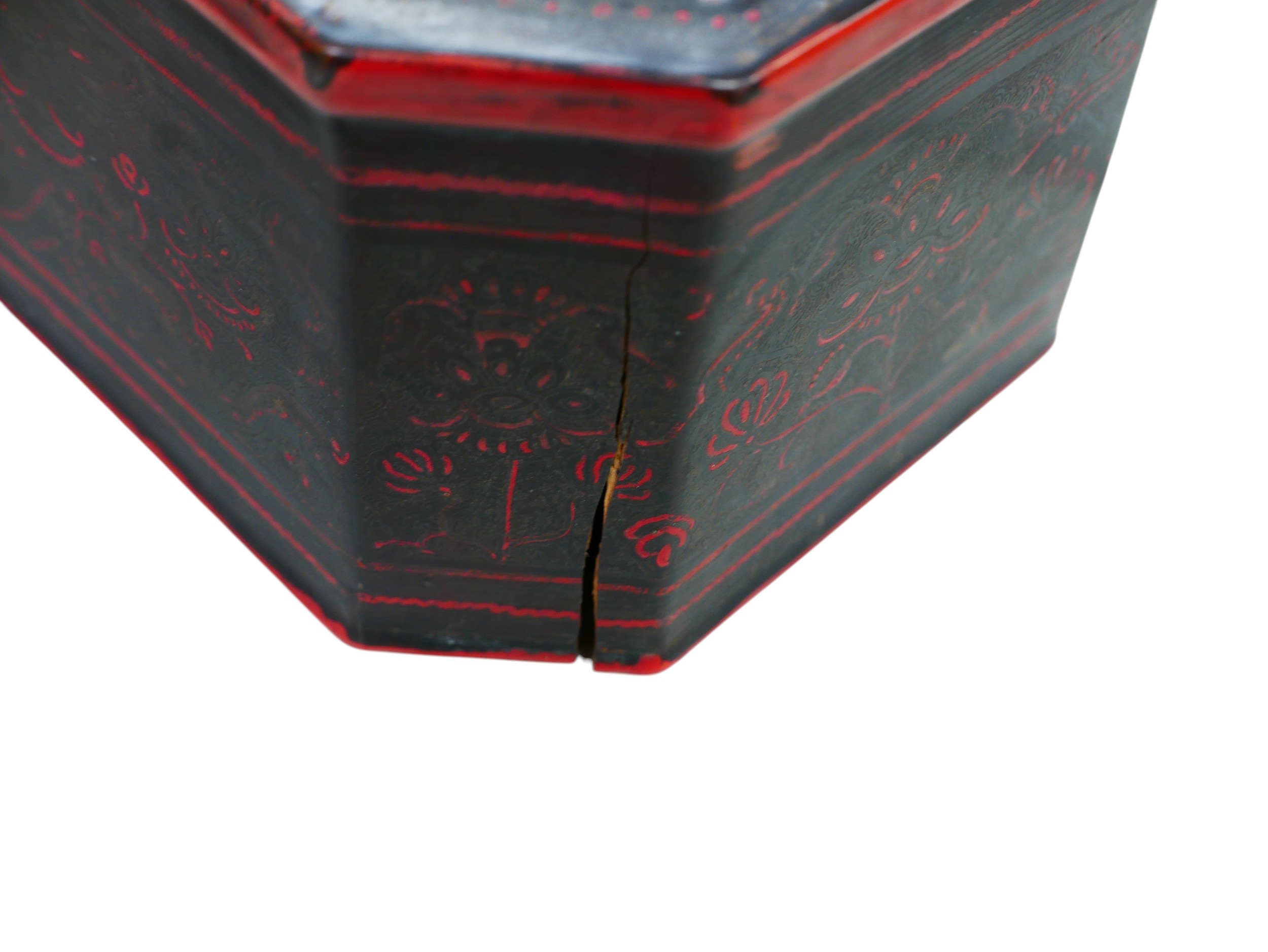A late 19th/early 20th century Oriental lacquer box of octagonal form, with inner tray, a/f, 20.5 by 14 by 12.5cm high.