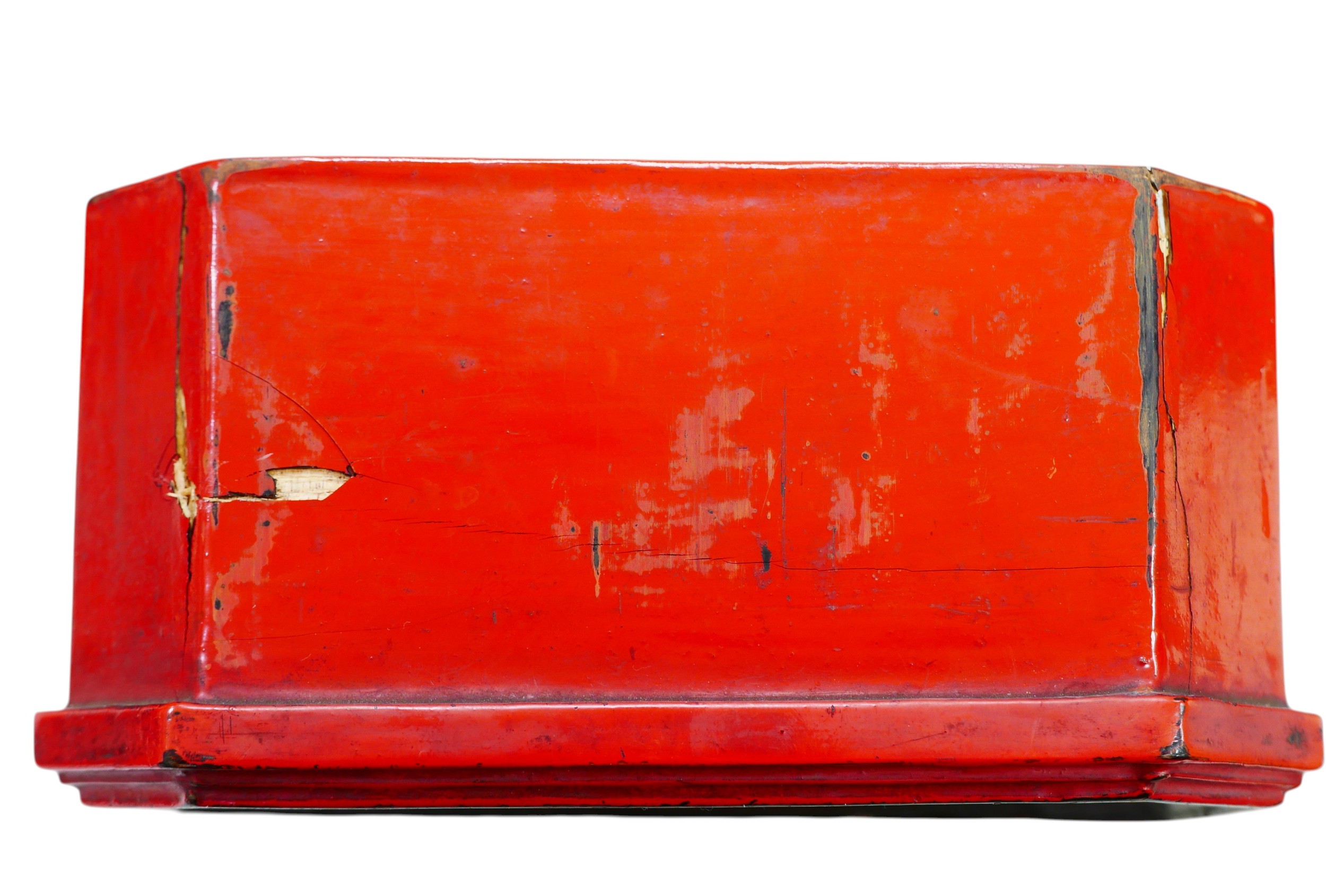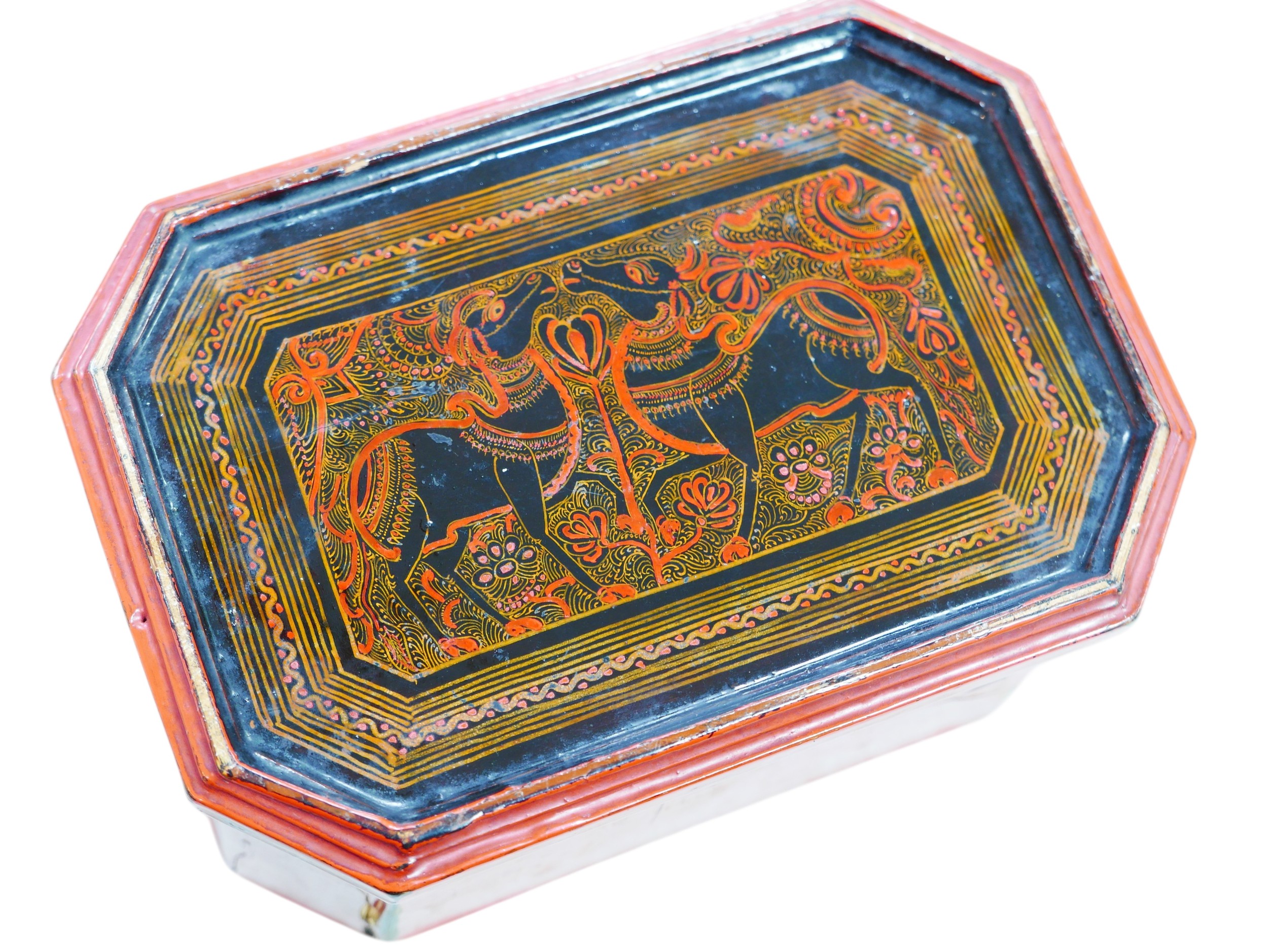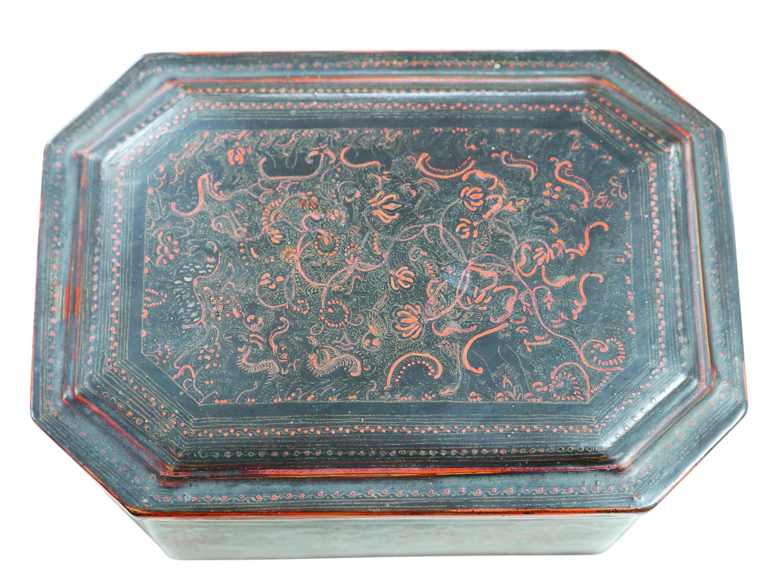 A late 19th/early 20th century Oriental lacquer box of octagonal form, with inner tray, a/f, 20.5 by 14 by 12.5cm high.