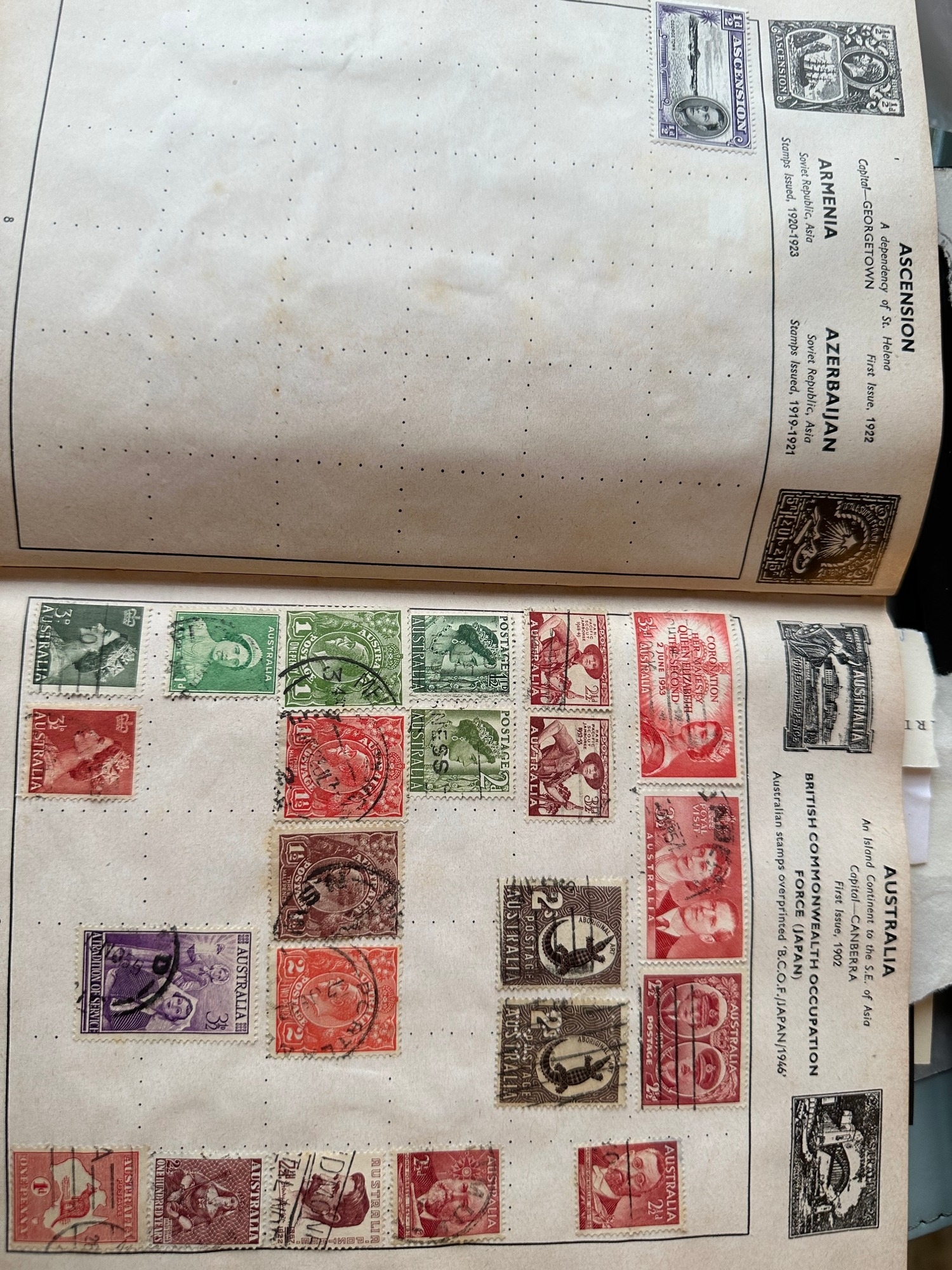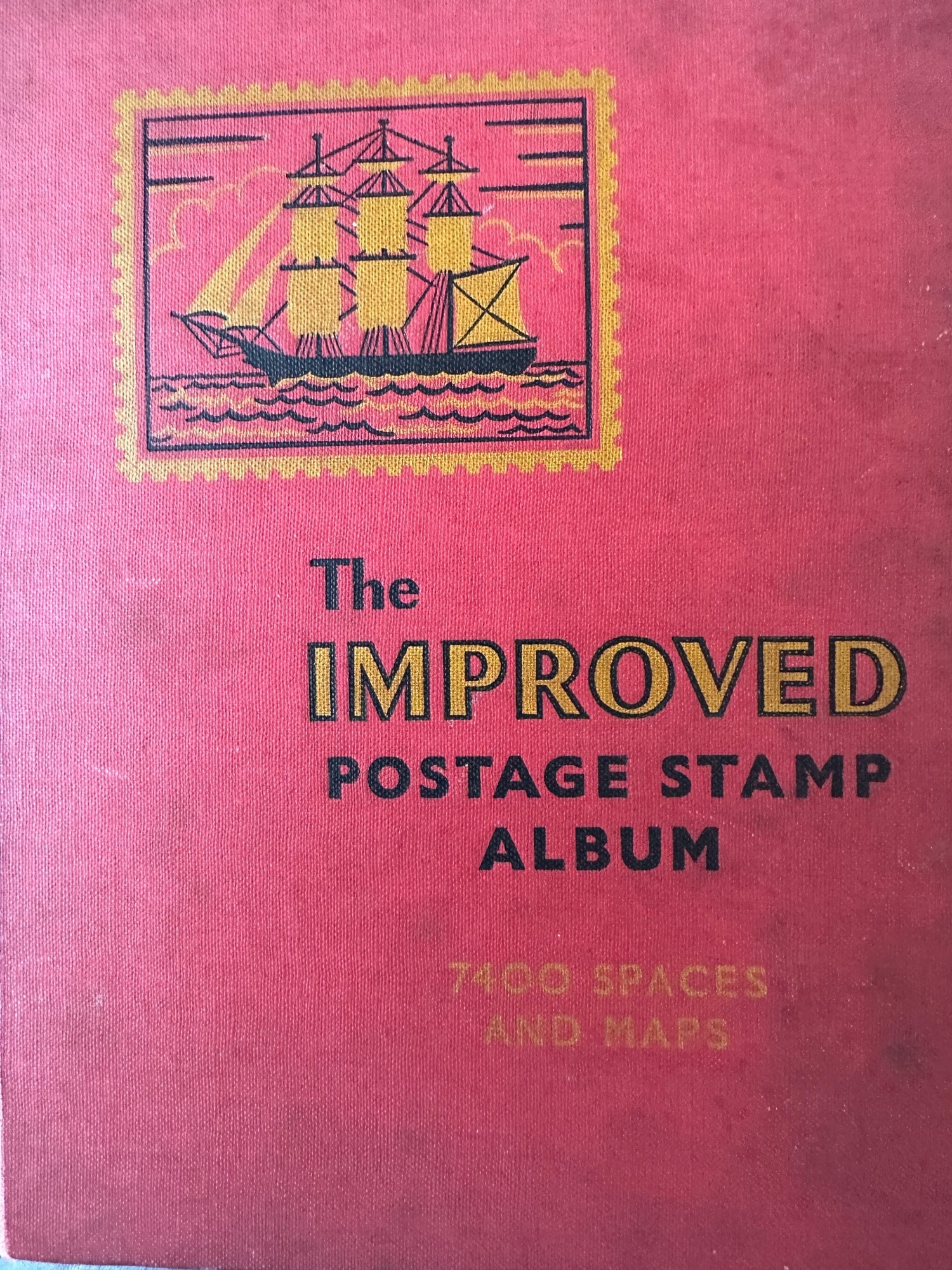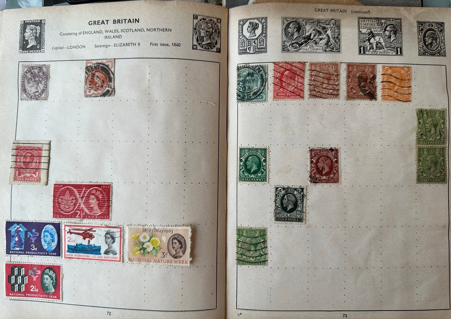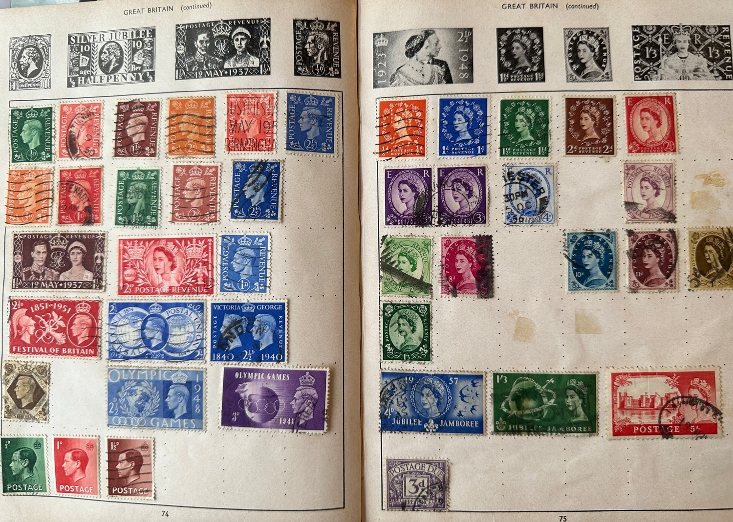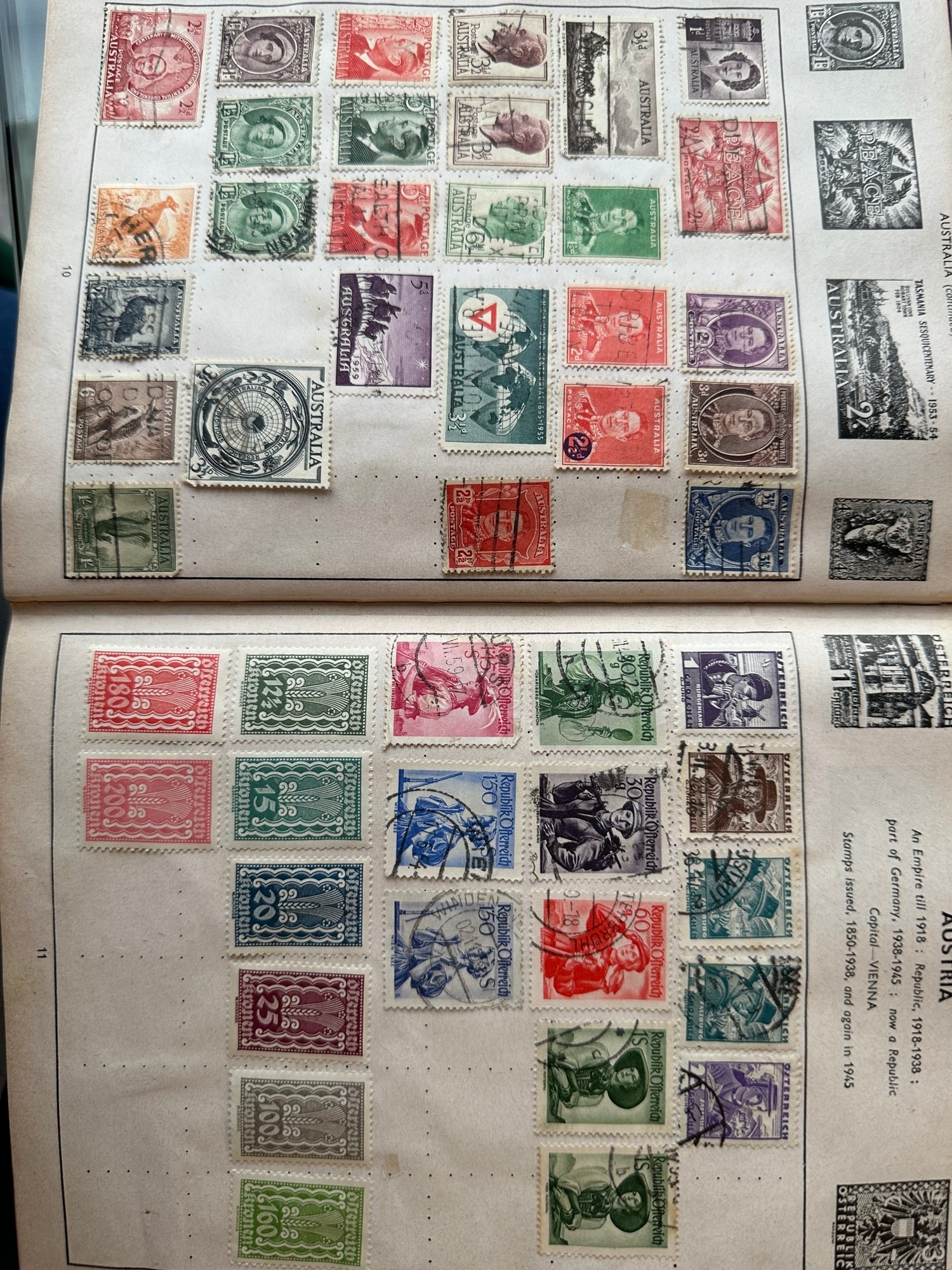 IMPROVED vintage stamp album by Stanley Gibbons with colour world maps, GB (QV onwards), commonwealth and worldwide inc. USA. many hundreds of stamps. mainly used a few mint