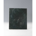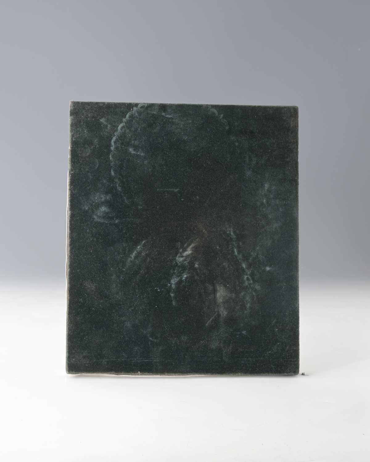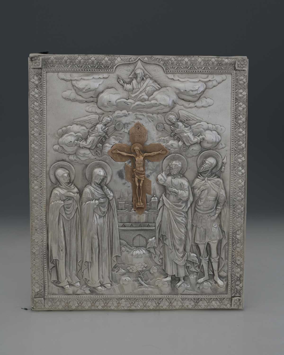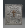 A Russian icon, with decoration depicting figures modelled in relief, with a floral and foliate border, with a baise-covered wooden back plate, dimensions 30x26x2.5cm approx