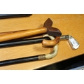FIVE ASSORTED WALKING STICKS TO INCLUDE A YELLOW METAL BANDED EXAMPLE, MODERN GOLF INTEREST EXAMPLE ETC.