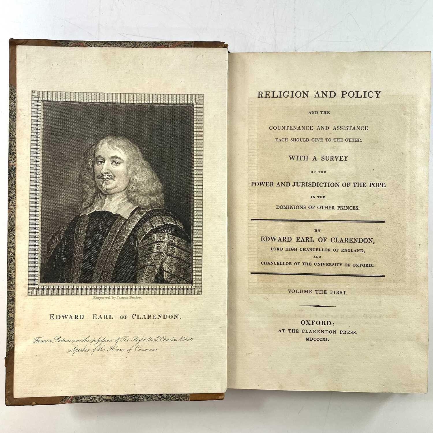 EDWARD Earl of CLARENDON. 'Religion and Policy and the Countenance and Assistance Each Should Give to the Other....' two vols, fine copy, ex libris label, he Clarendon Press, Oxford, 1811. (2)