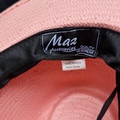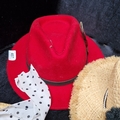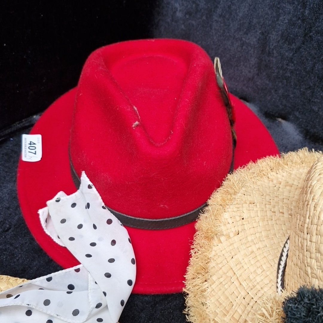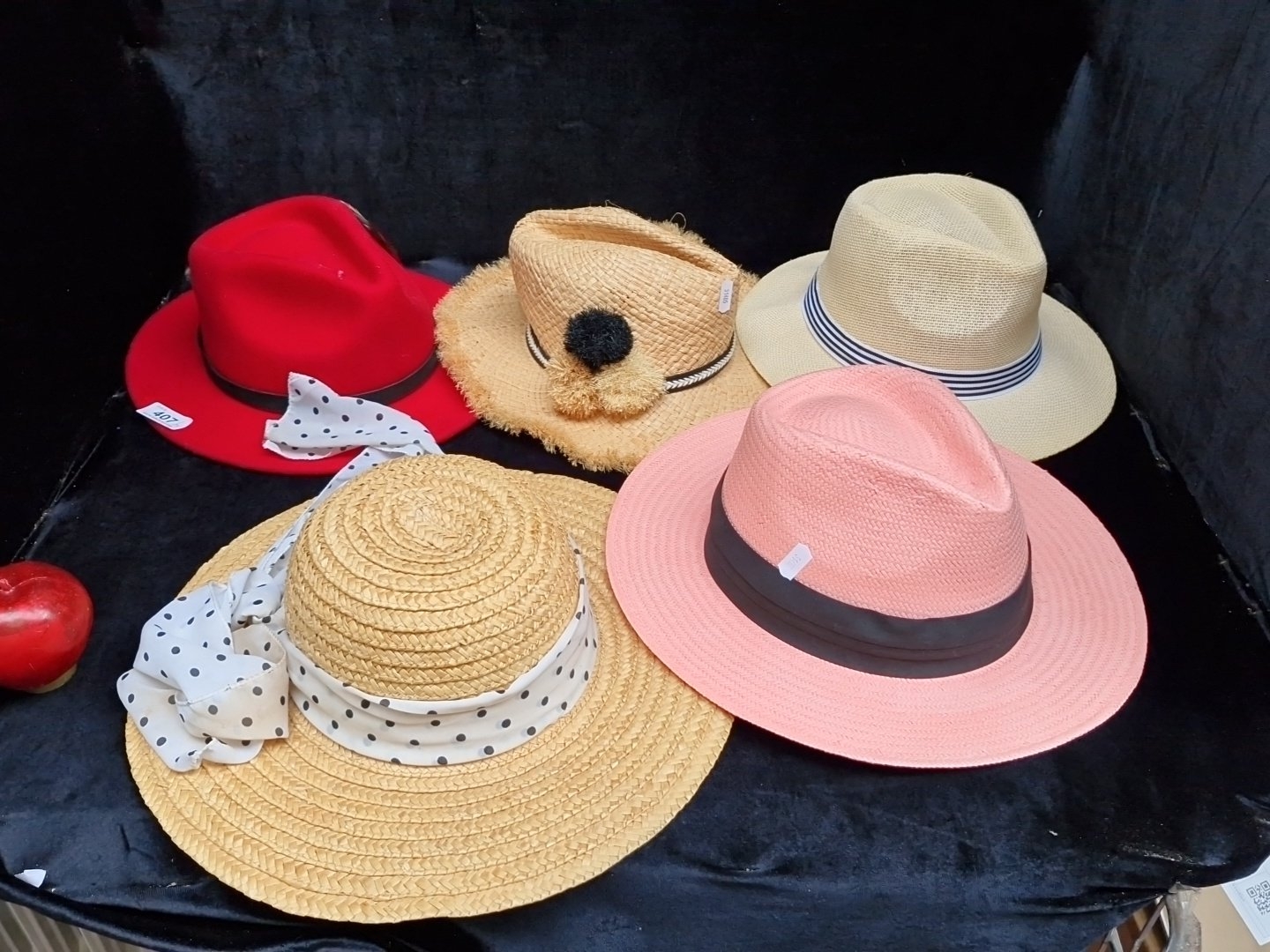 A group of fashion hats, including felt and woven paper styles, comprising a red fedora, straw sunhats with ribbon trim, and a pink paper-weave fedora, various makers.