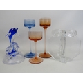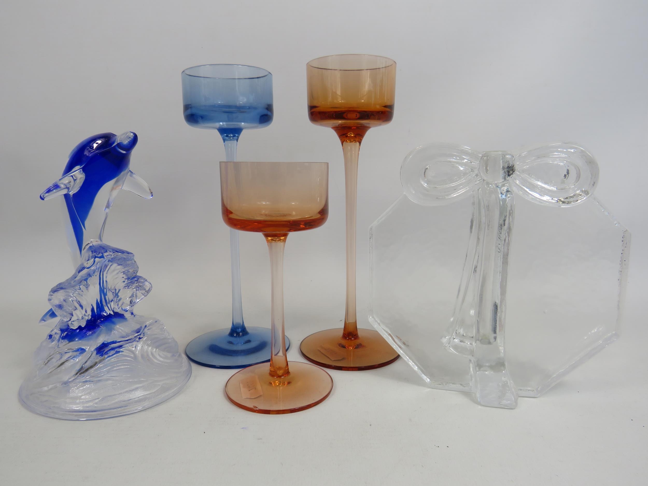 3 Wedgwood Brancaster candlesticks, a dolphin paperweight and a vase.
