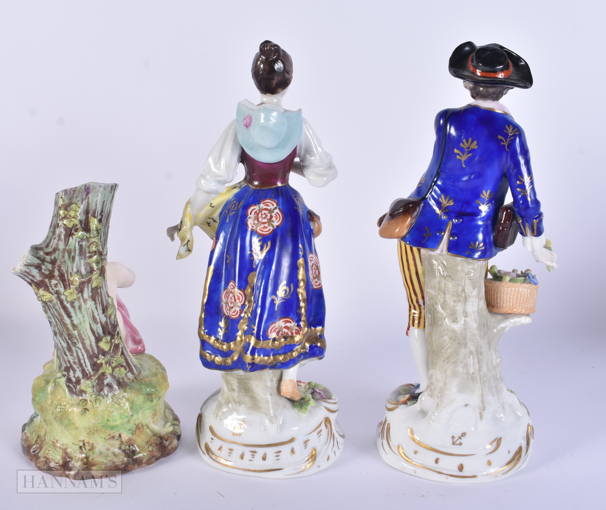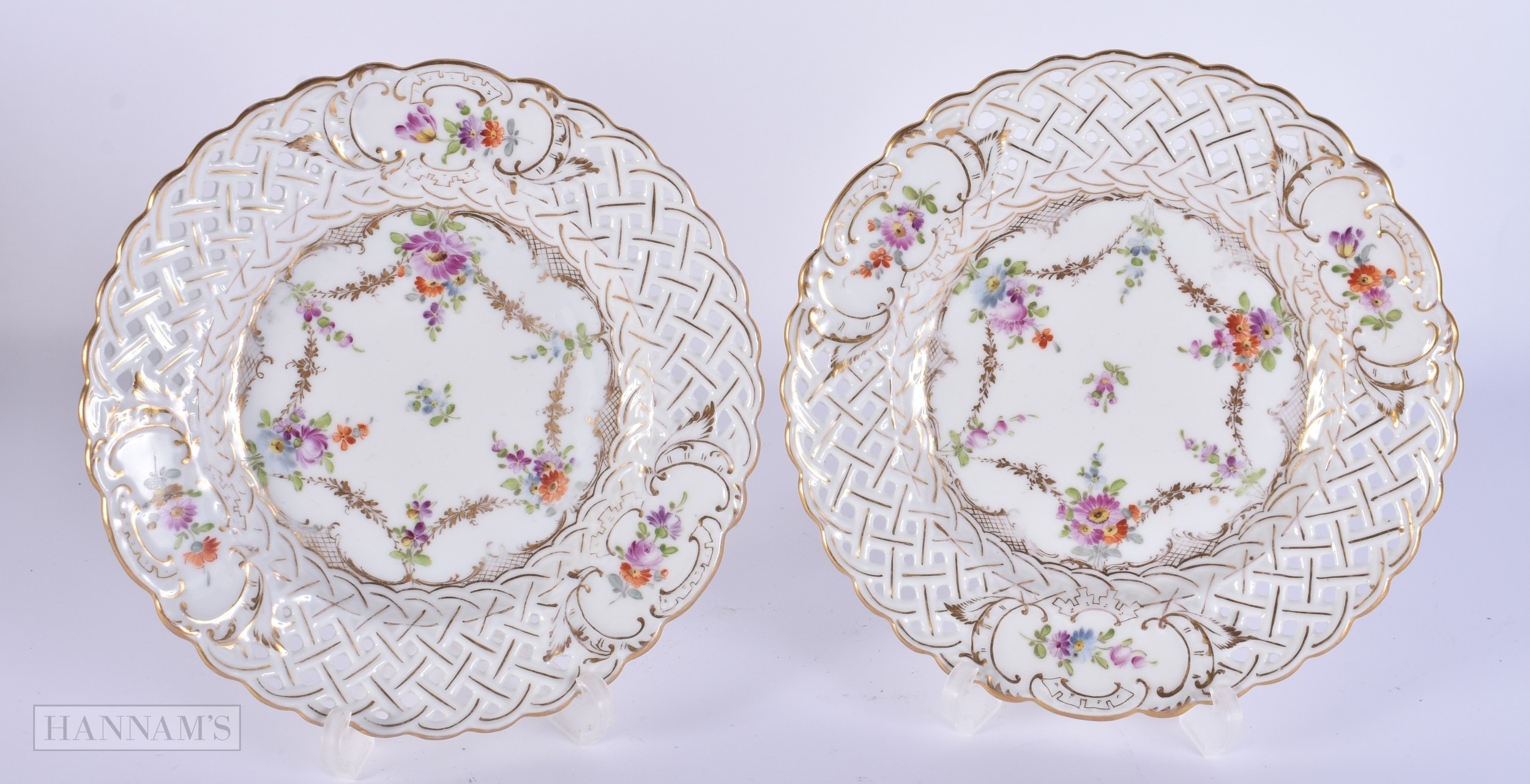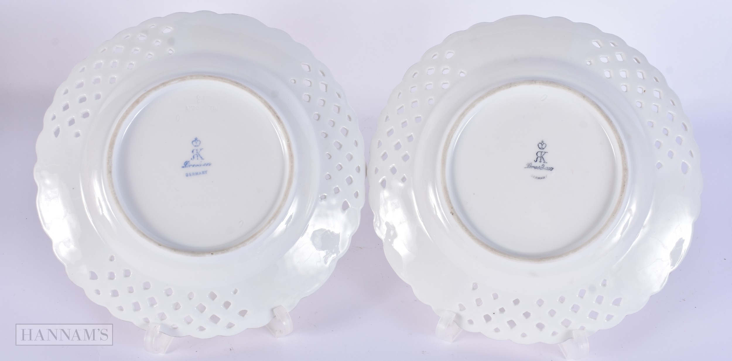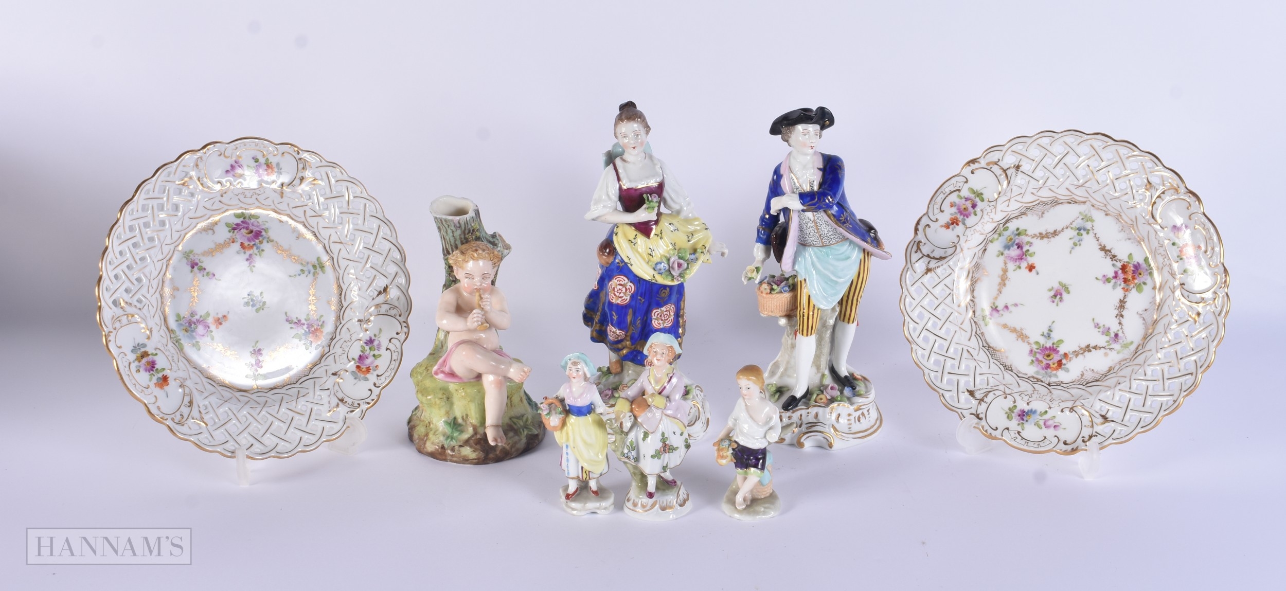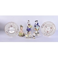 A PAIR OF DRESDEN PLATES together with Continental figures etc. (qty)