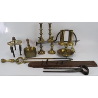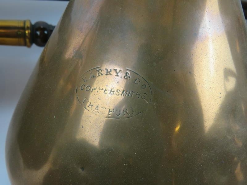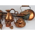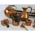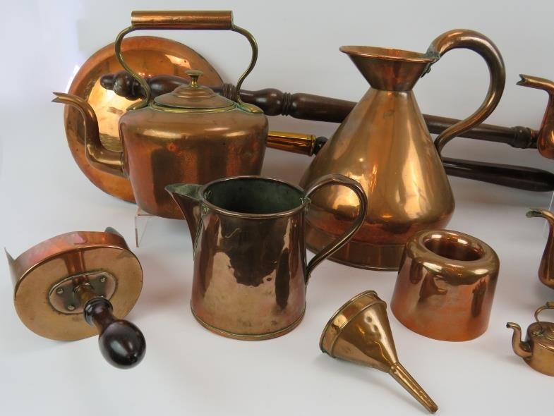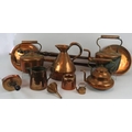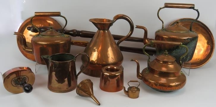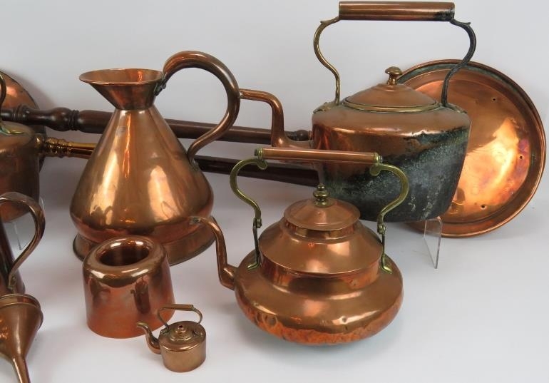 A quantity of antique copper ware including four kettles, a Barry & Co. half gallon jug, two bed warming pans, jelly mould, funnel, scoop and a quart jug. (1).