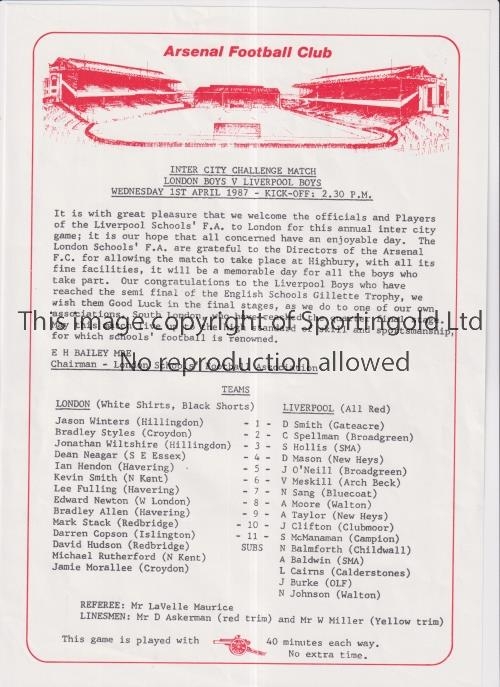 AT ARSENAL / INTER CITY BOYS CHALLENGE MATCH 1987 Single sheet programme for London v Liverpool 1/4/1987. Good