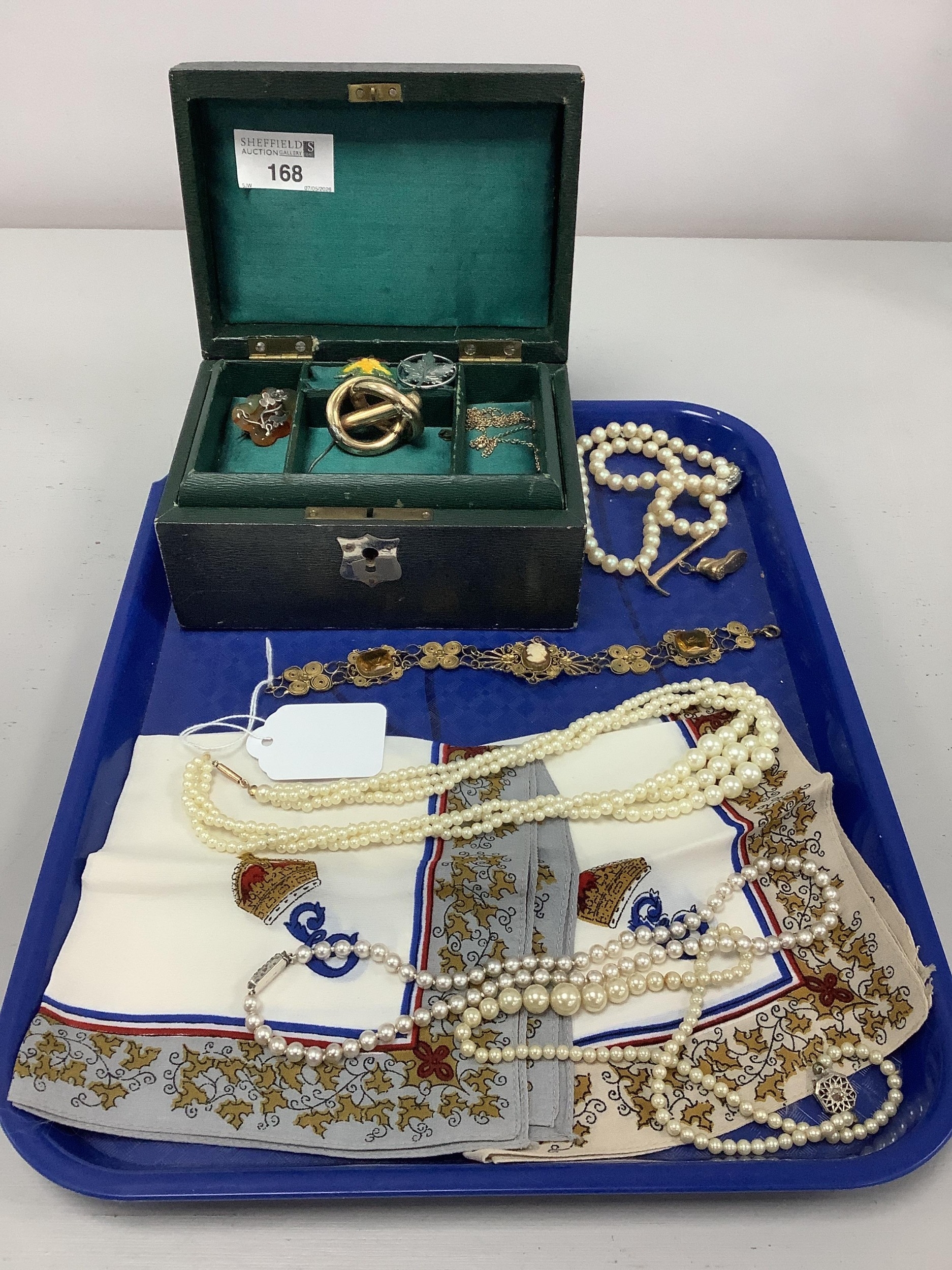 Antique Jewellery Box, containing assorted imitation pearl bead necklaces, Victorian polished hardstone foliate brooch (damage), fine chain, vintage gilt metal camel panel bracelet, vintage Royal Commemorative silk hankies, etc.