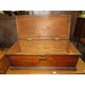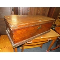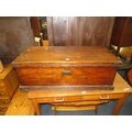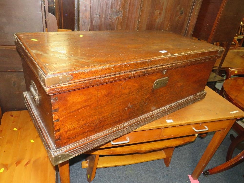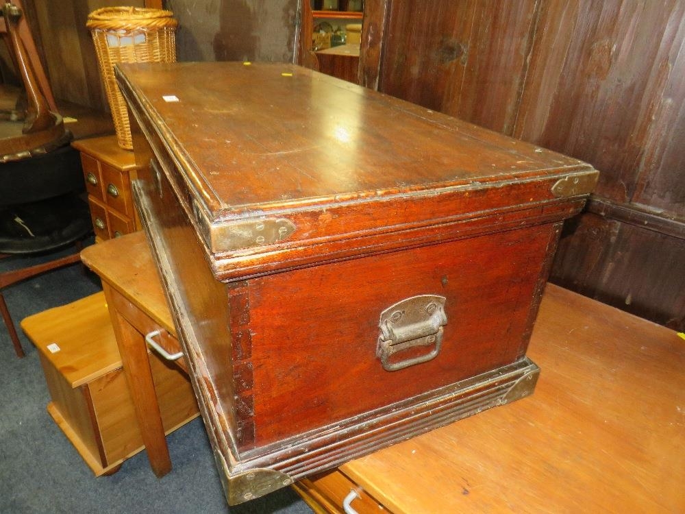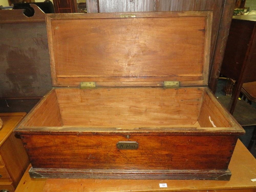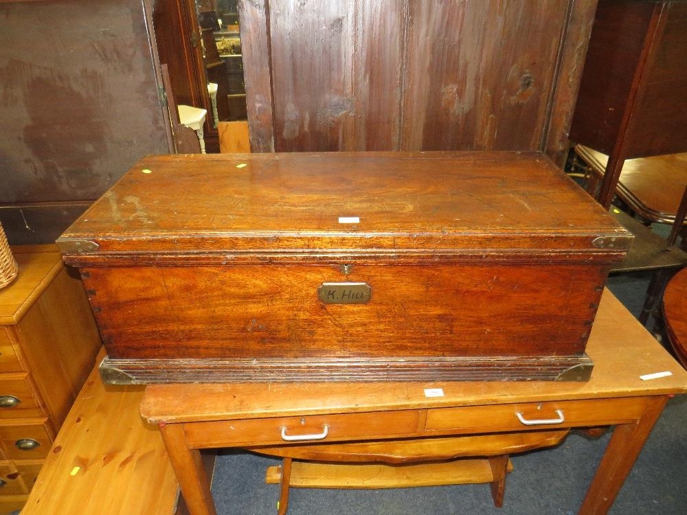 AN ANTIQUE MAHOGANY TRUNK WITH TWO CARRY HANDLES AND NAME PLAQUE - K. HILL W- CM