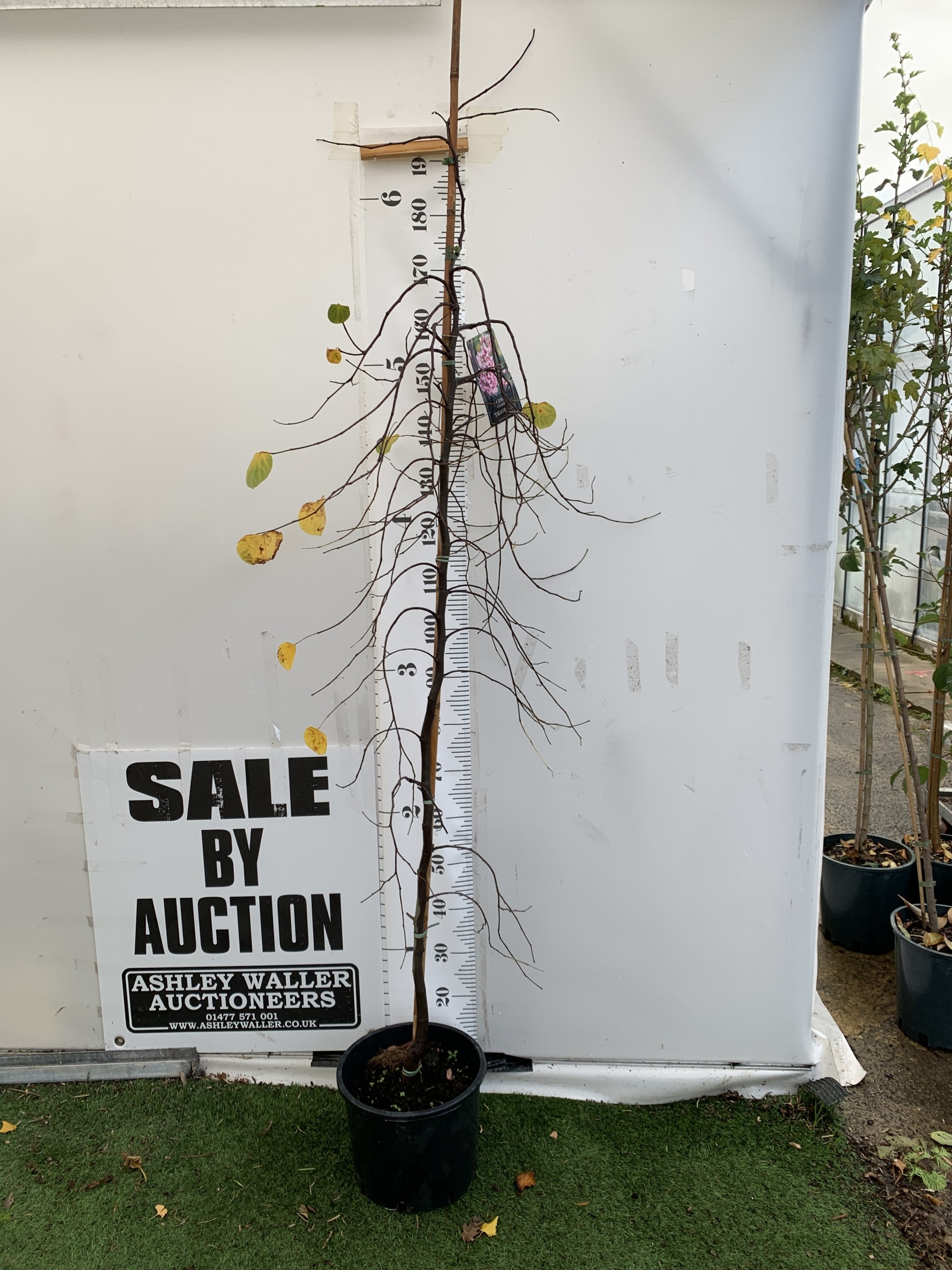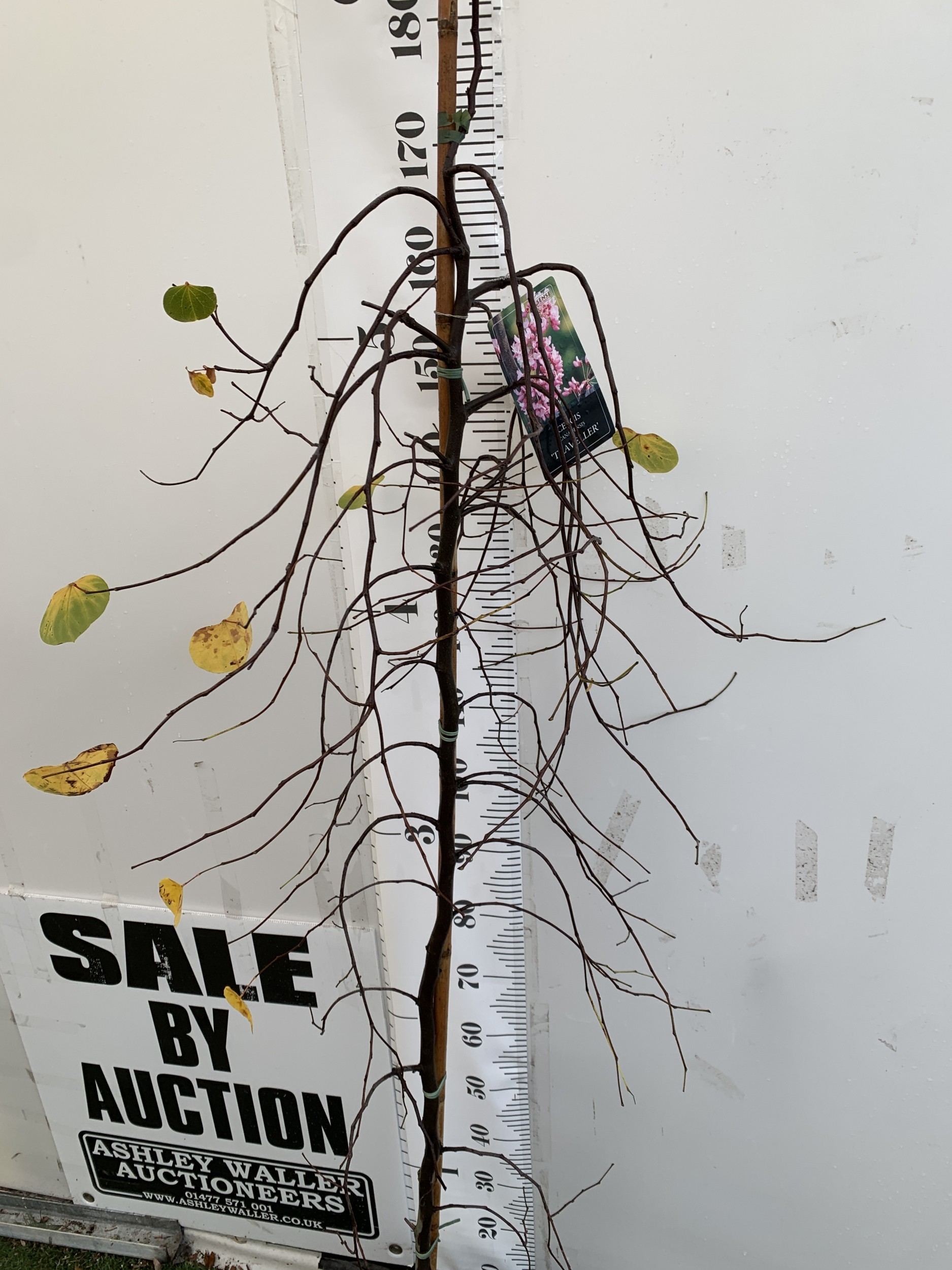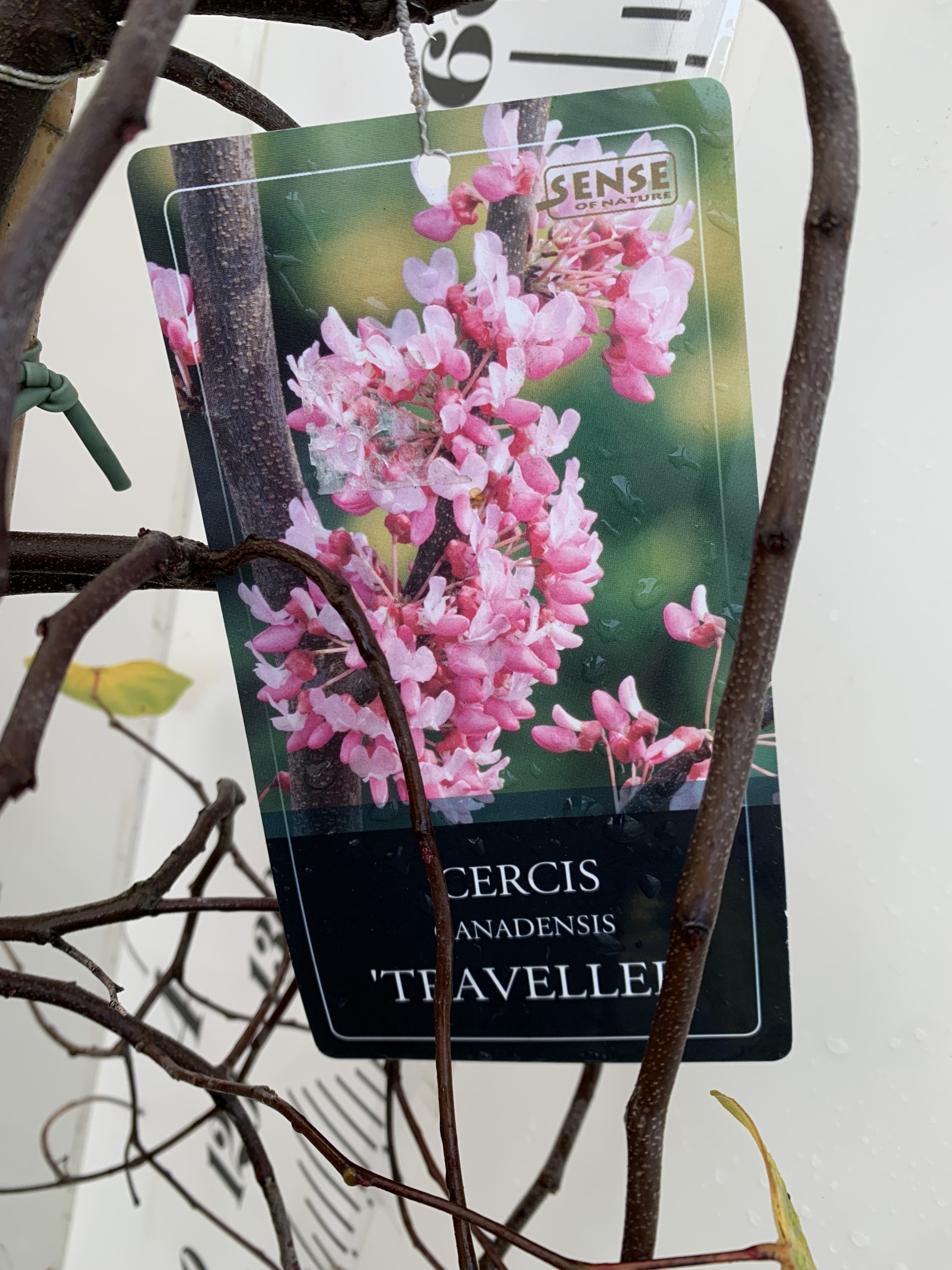 ONE CERCIS CANADENSIS 'TRAVELLER', A WEEPING EASTERN REDBUD THAT PRODUCES A YEAR ROUND DISPLAY. IN EARLY SPRING AND LATE WINTER HAS VIBRANT FUCHSIA-PINK FLOWERS IN CLUSTERS. FOLLOWED BY COPPERY HEART SHAPED LEAVES, FEATHERED STRUCTURE WHICH GIVES A BUSHIER APPEARANCE. IN A 10 LTR POT, OVER 2 METRES IN HEIGHT.