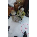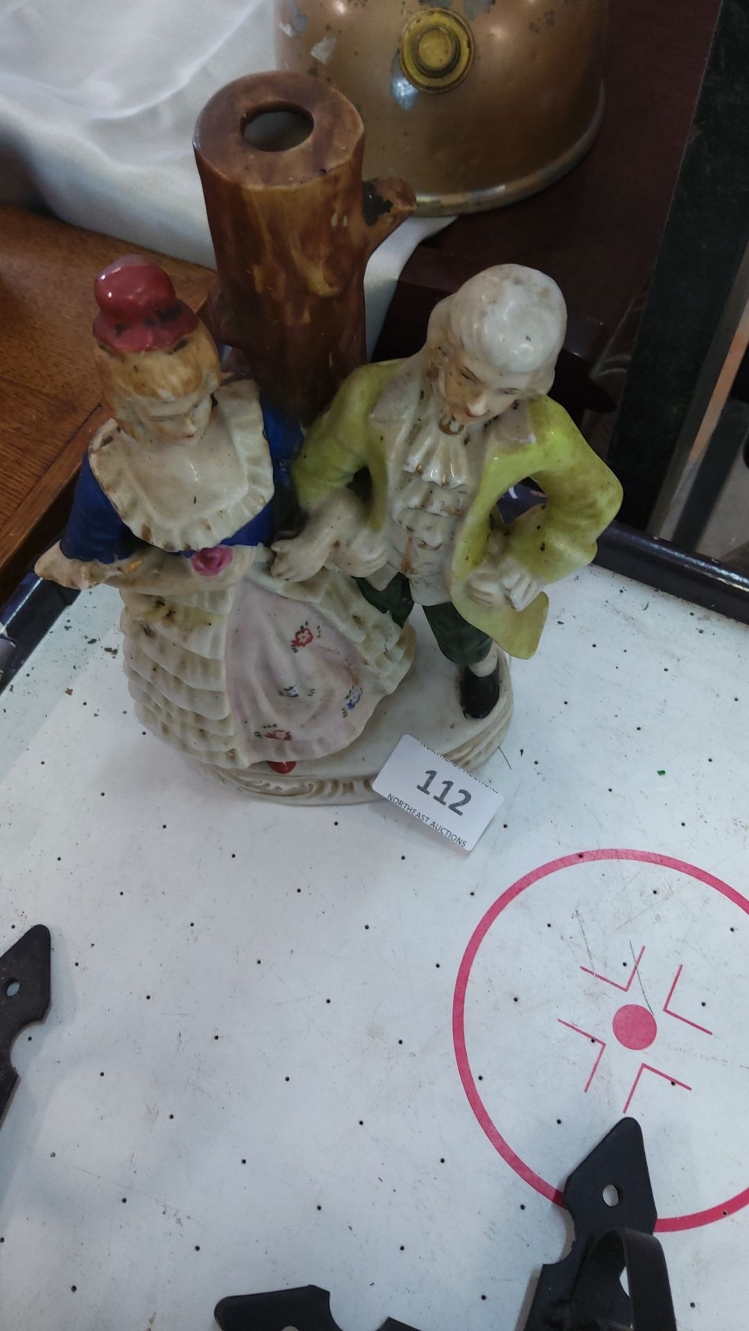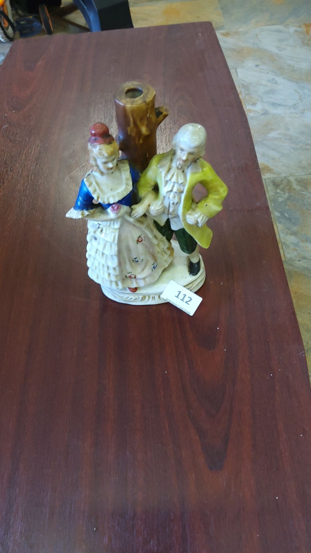 Staffordshire-style earthenware spill vase modelled as an 18th-century courting couple beside a tree stump, hand-painted polychrome glazes, early 20th century.