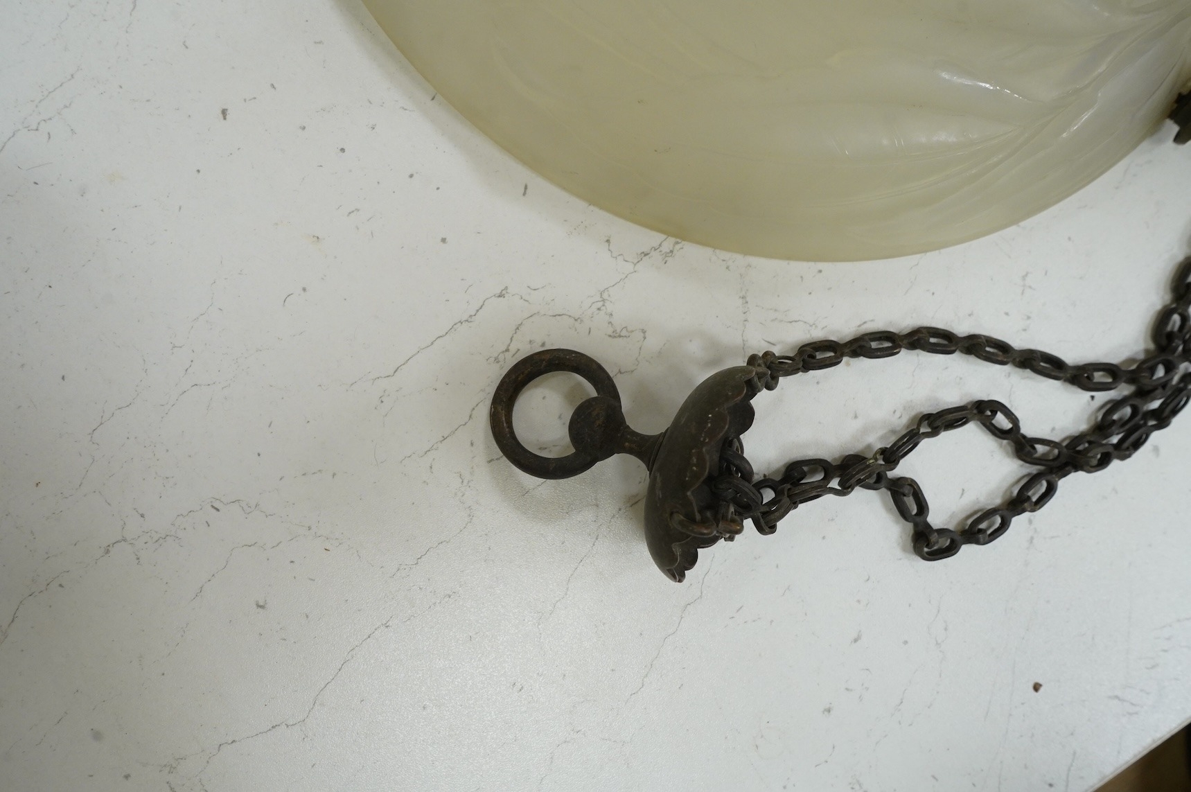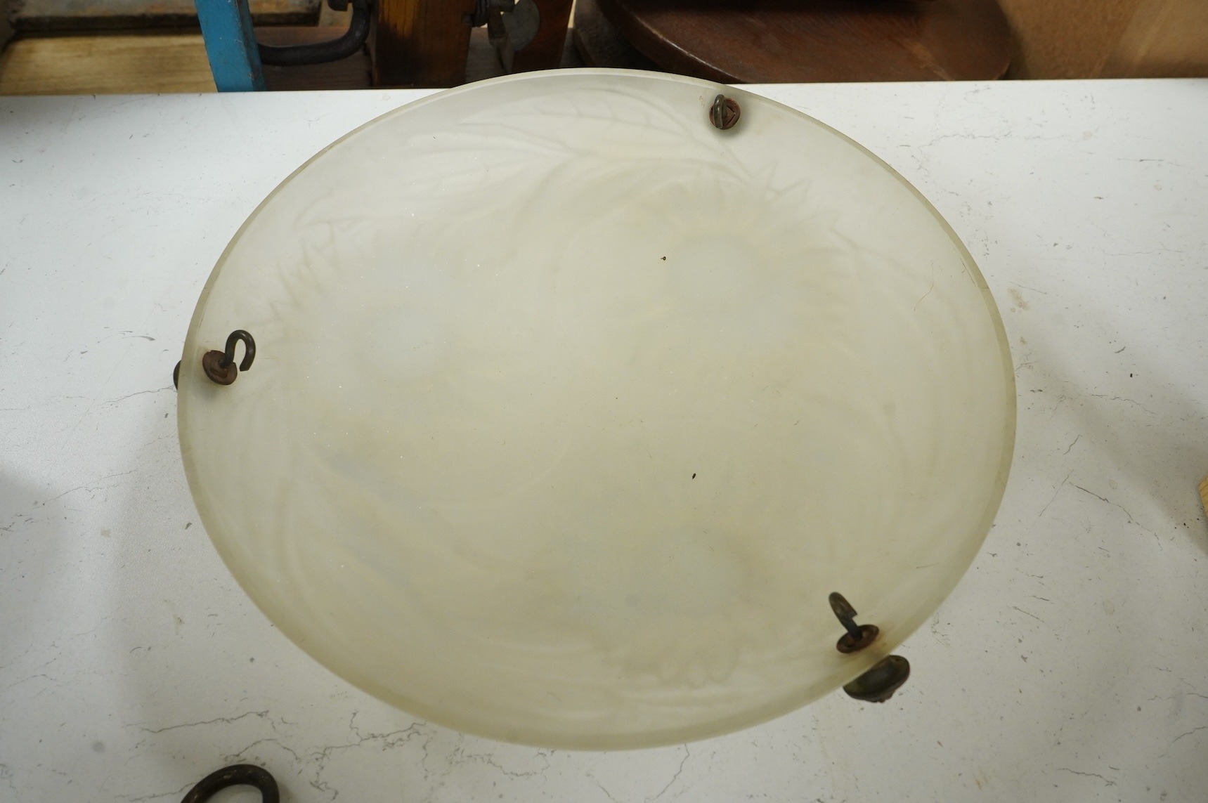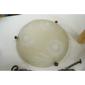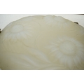 A Lalique-style opalescent glass ceiling shade decorated with three sunflowers, 34cm in diameter