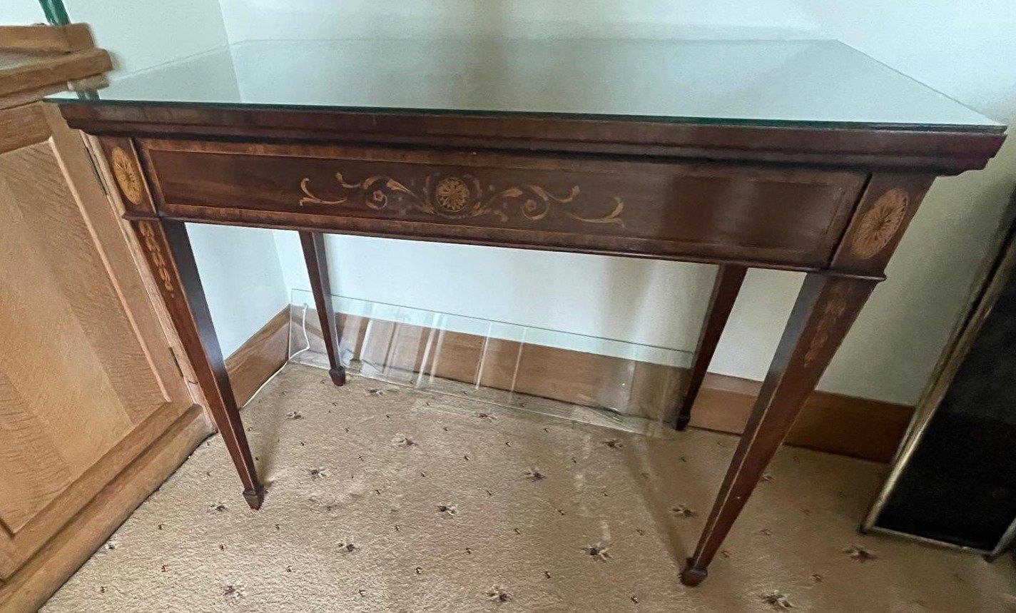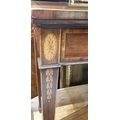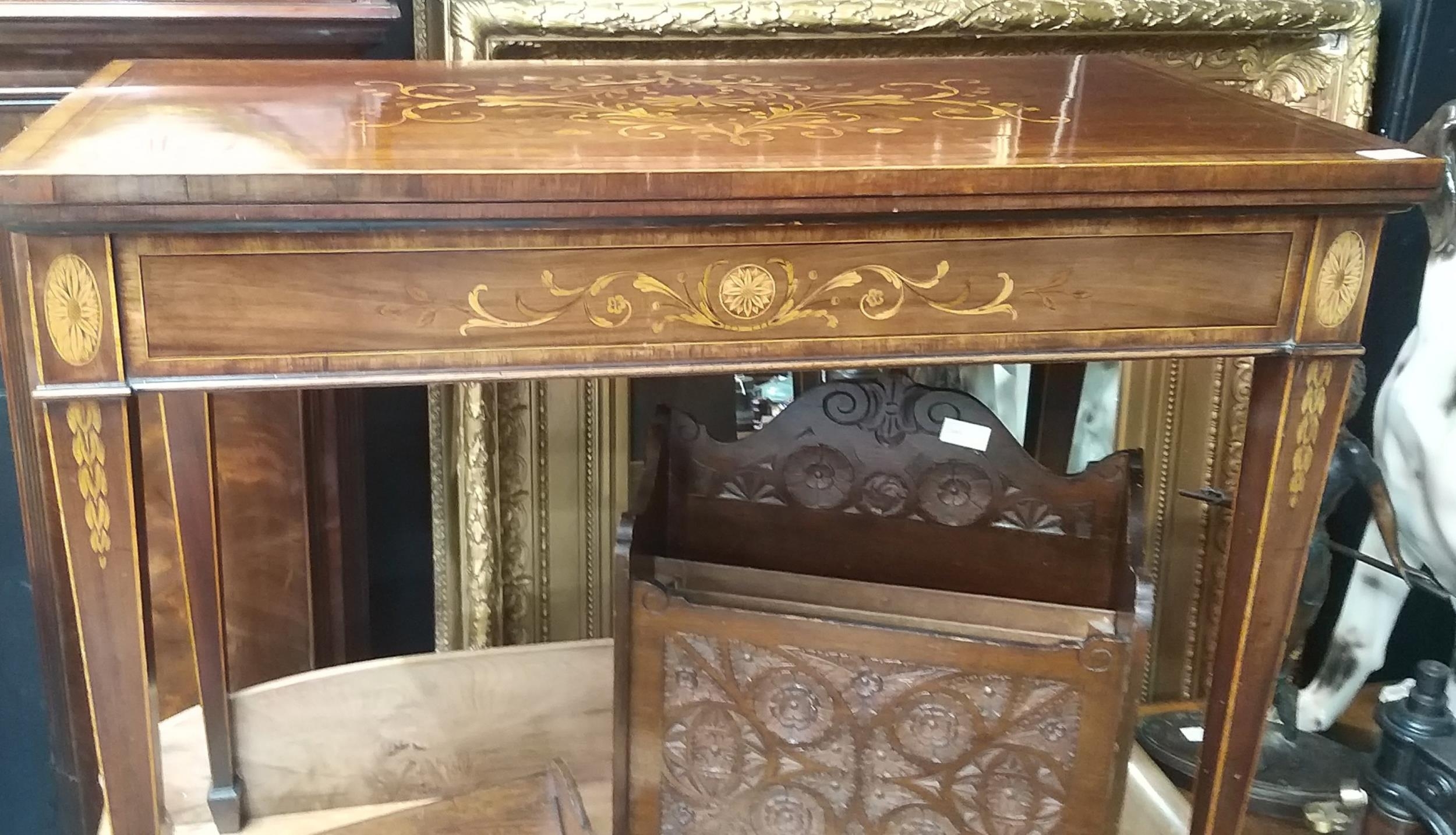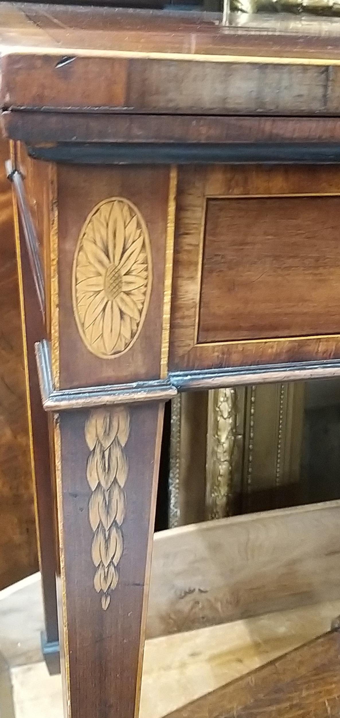 EXCEPTIONAL QUALITY - An ANTIQUE (c1890) SHERATON revival mahogany fold-out card table with marquetry inlay - the top has been protected with glass for a long time, the green baize is in good condition(replaced 3/4 years ago) - fold-out card table on four fluted leg supports, with lovely inlay detail - in nice condition - - dimensions 92cm width x 45cm depth unextended - 92cm x 90cm approx - when folded-out in use