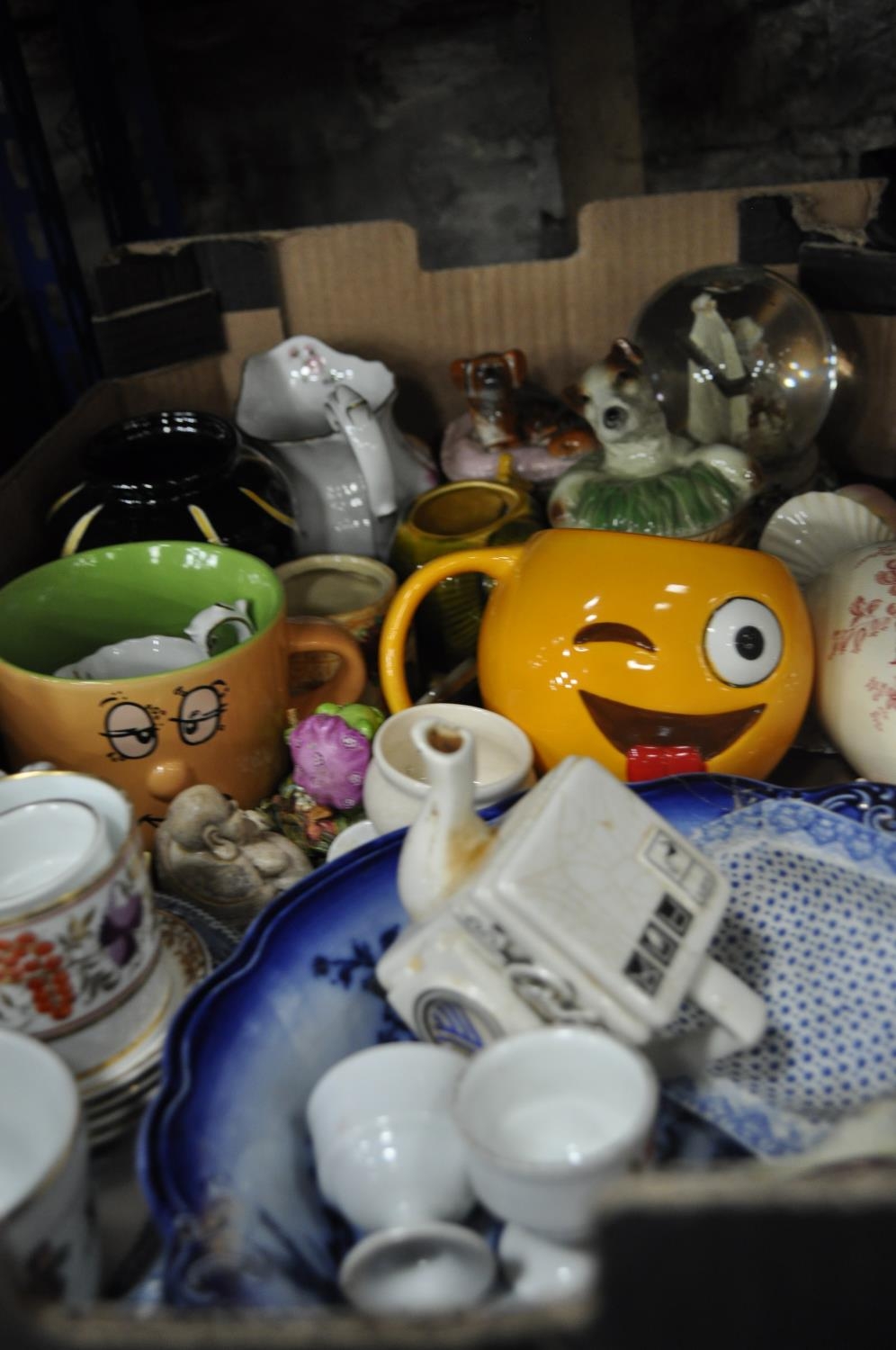 BOX INC EMOJI MUG, SNOWGLOBE, STAFFORDSHIRE, CRESTEDWARE AND CERAMIC ANIMAL FIGURES