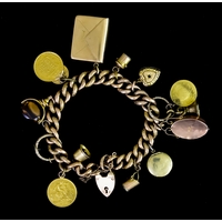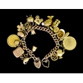A 9ct Gold Charm Bracelet with padlock clasp, with suspended mounted 1809 shield sovereign, and twenty other suspended charms, various, total gross weight 50g