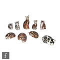Nine Royal Crown Derby Cat paperweights to include Catnip Kitten, made exclusively for the collectors guild, Sitting Kitten, Sleeping Kitten, Cornered Kitten, Kitten, Majestic Kitten numbered 724 of 5000, Molly made exclusively for the collectors guild, all with printed marks, all with gold stoppers, boxes for Sleeping Kitten, Sitting Kitten, Cornered Kitten and Kitten. (9)