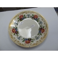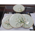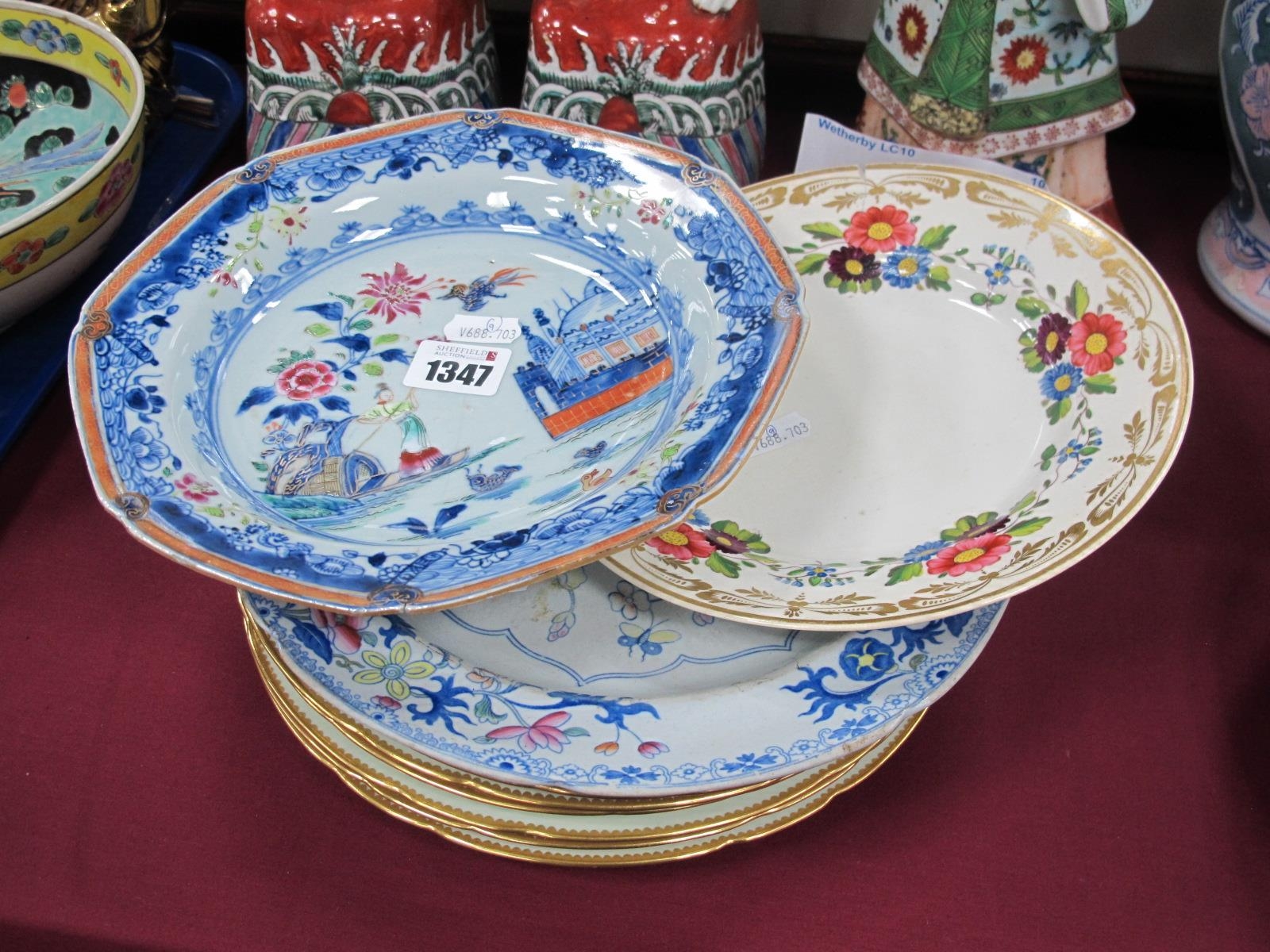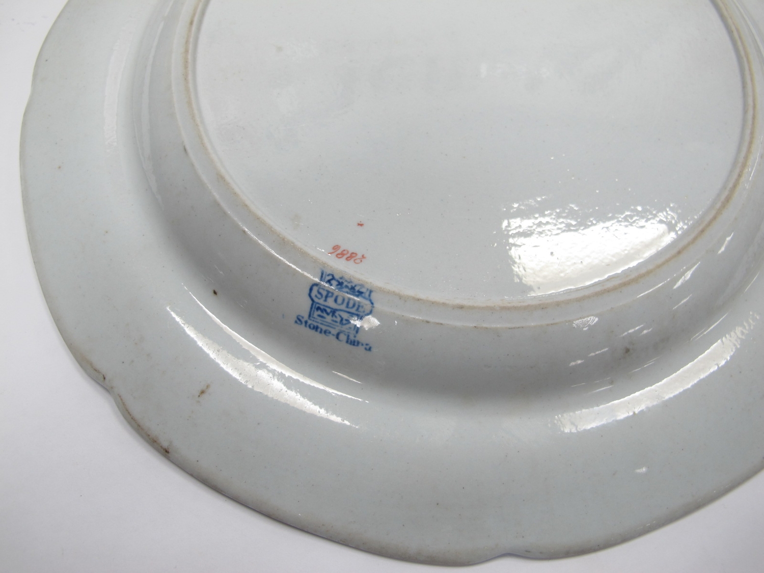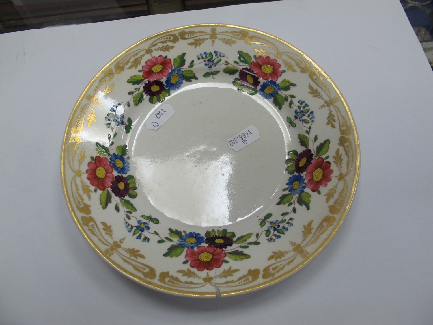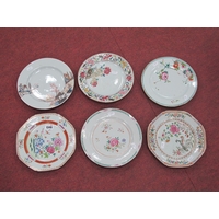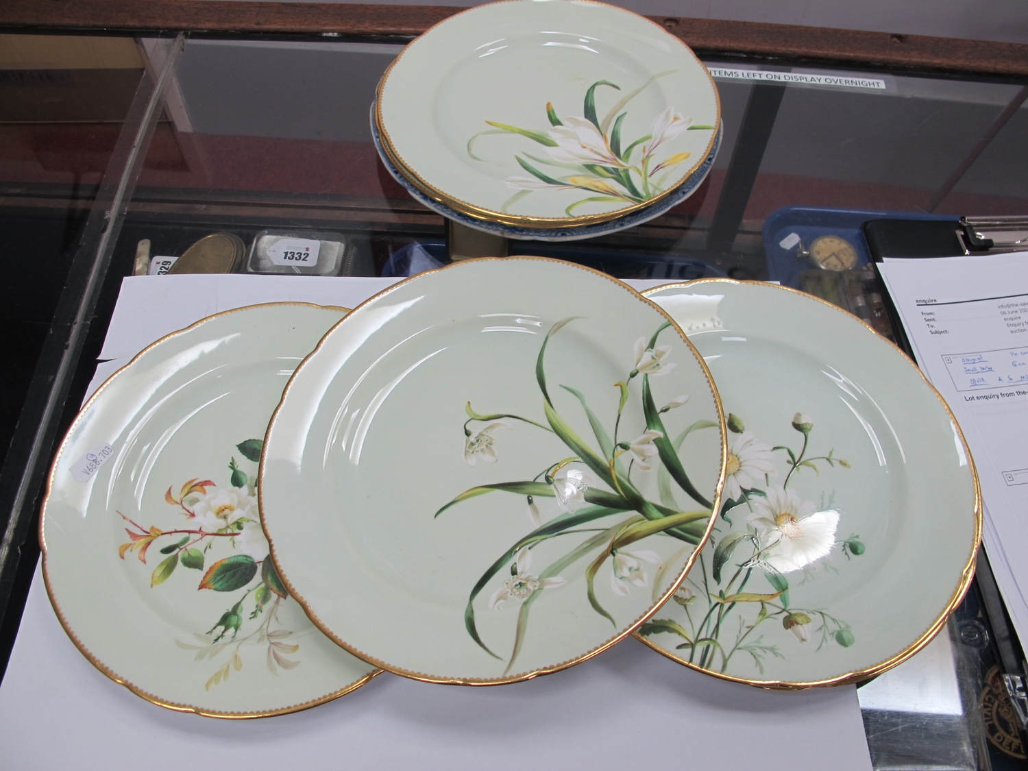 Minton - Set of six hand painted floral cabinet plates on pale green ground, with gilt rims. XIX Century Spode, Derby and Chinese temple examples. (9).