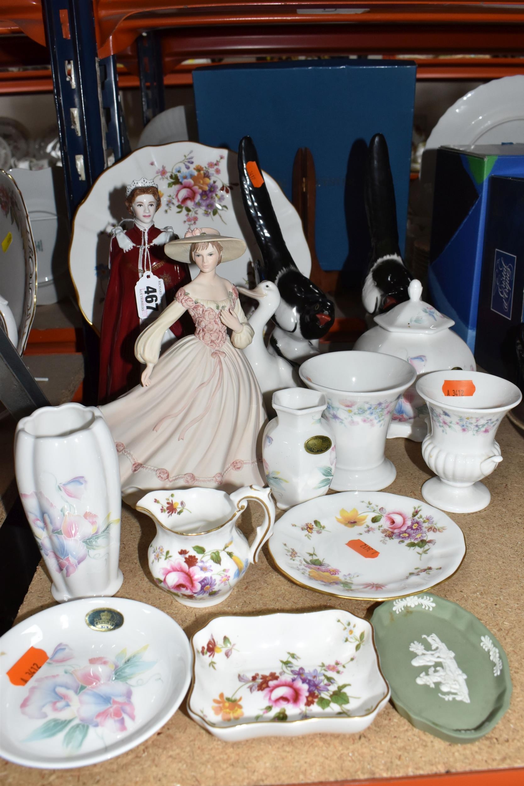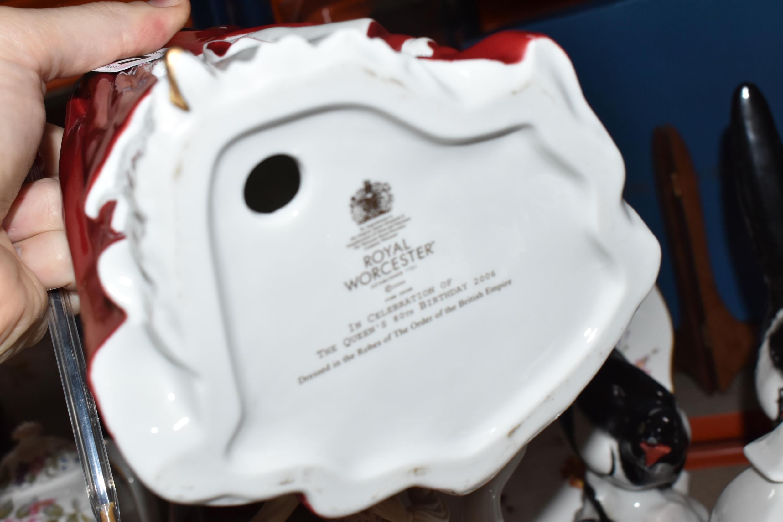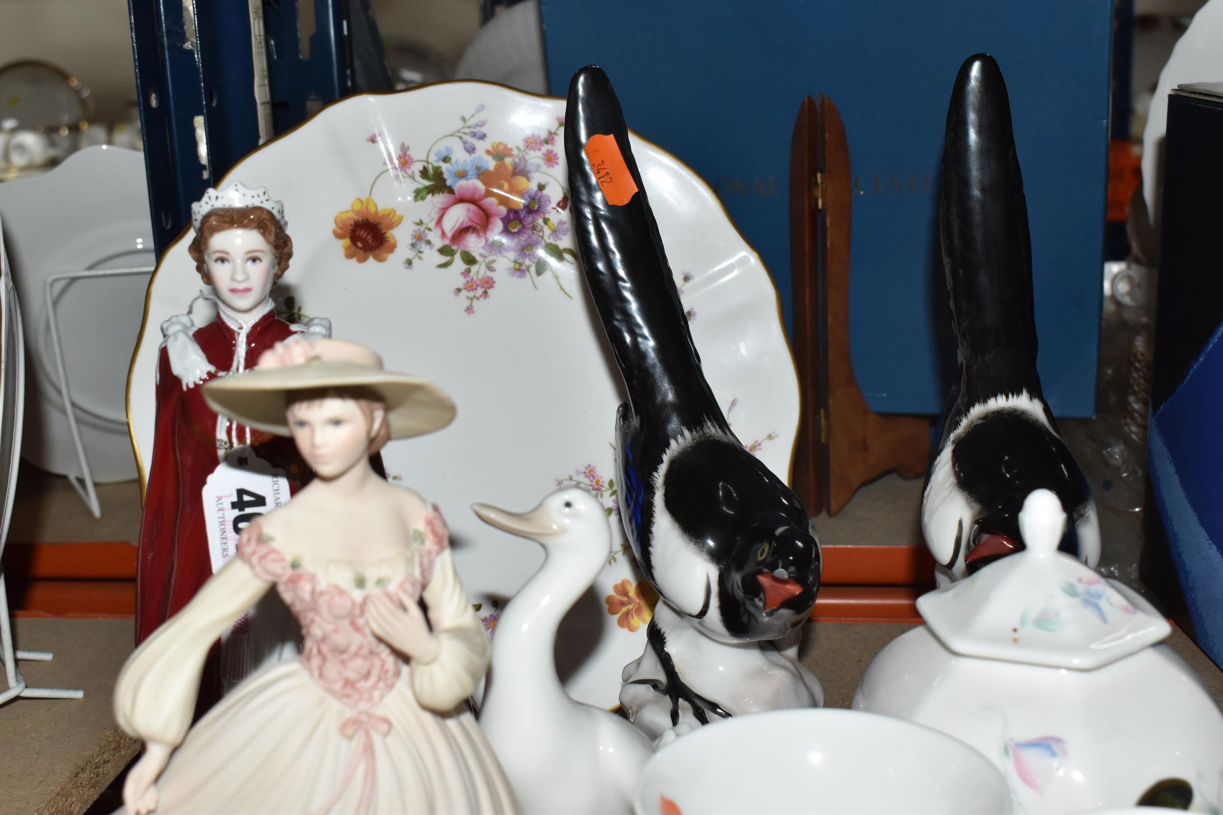A GROUP OF CERAMICS, to include a Royal Worcester figure of HM Queen Elizabeth II to celebrate 'The Queen's 80th Birthday 2006', two Lomonosov magpie figures, height 25cm (one with damaged beak), a Royal Crown Derby 'Derby Posies' dinner plate, cream jug, trinket dish and saucer, a Coalport 'Jean' figurine, a Nao figure of a duck, other items of giftware in Aynsley Little Sweetheart and Wedgwood Angela patterns, etc (16) (Condition Report: most pieces appear ok, obvious specific damage as stated, would benefit from a clean)