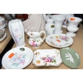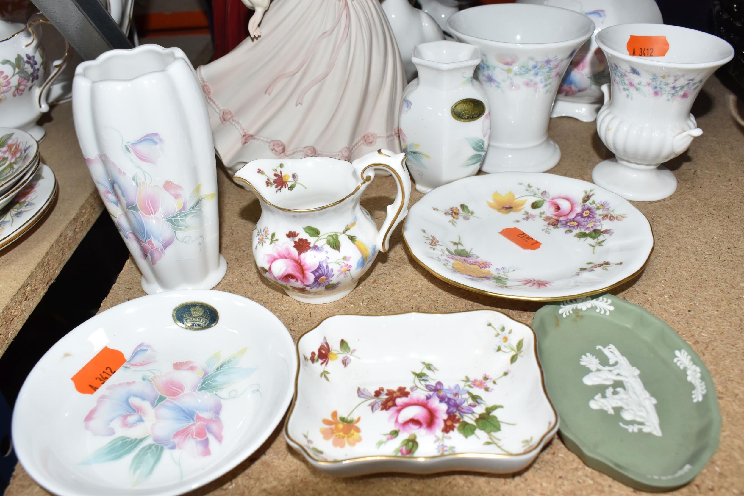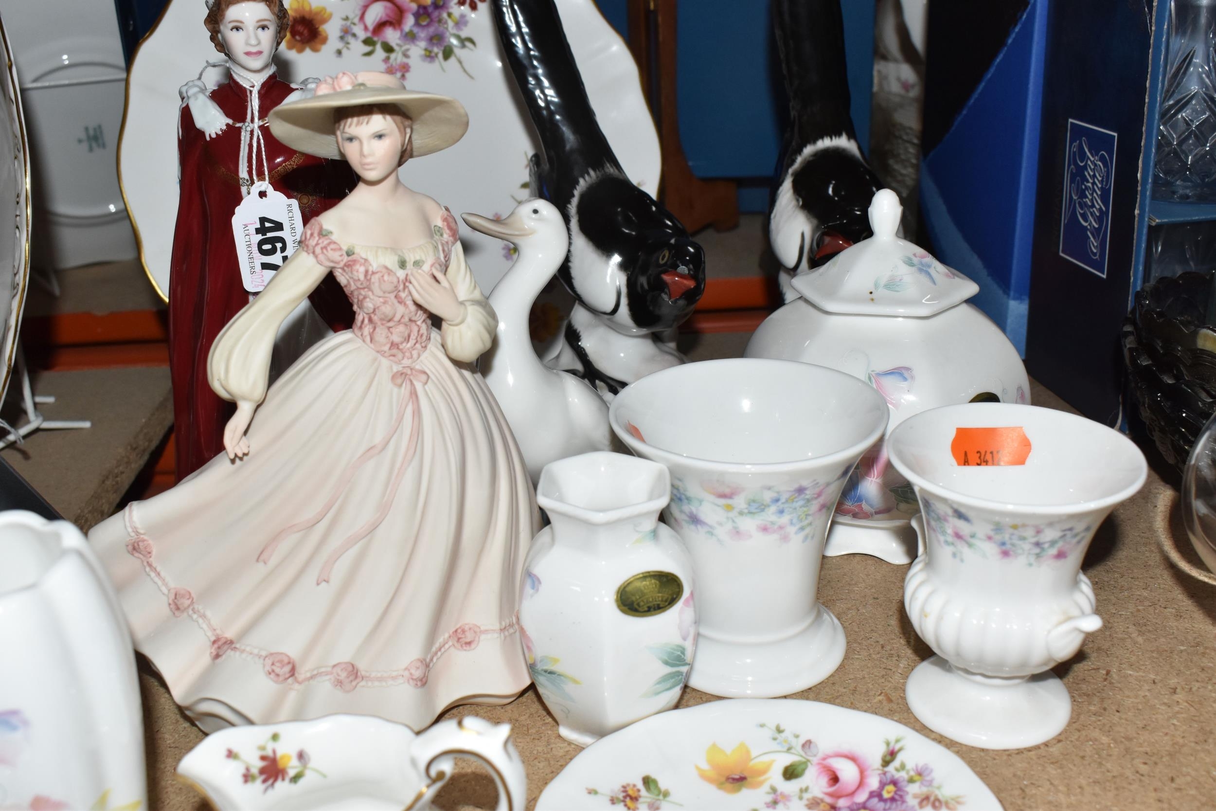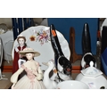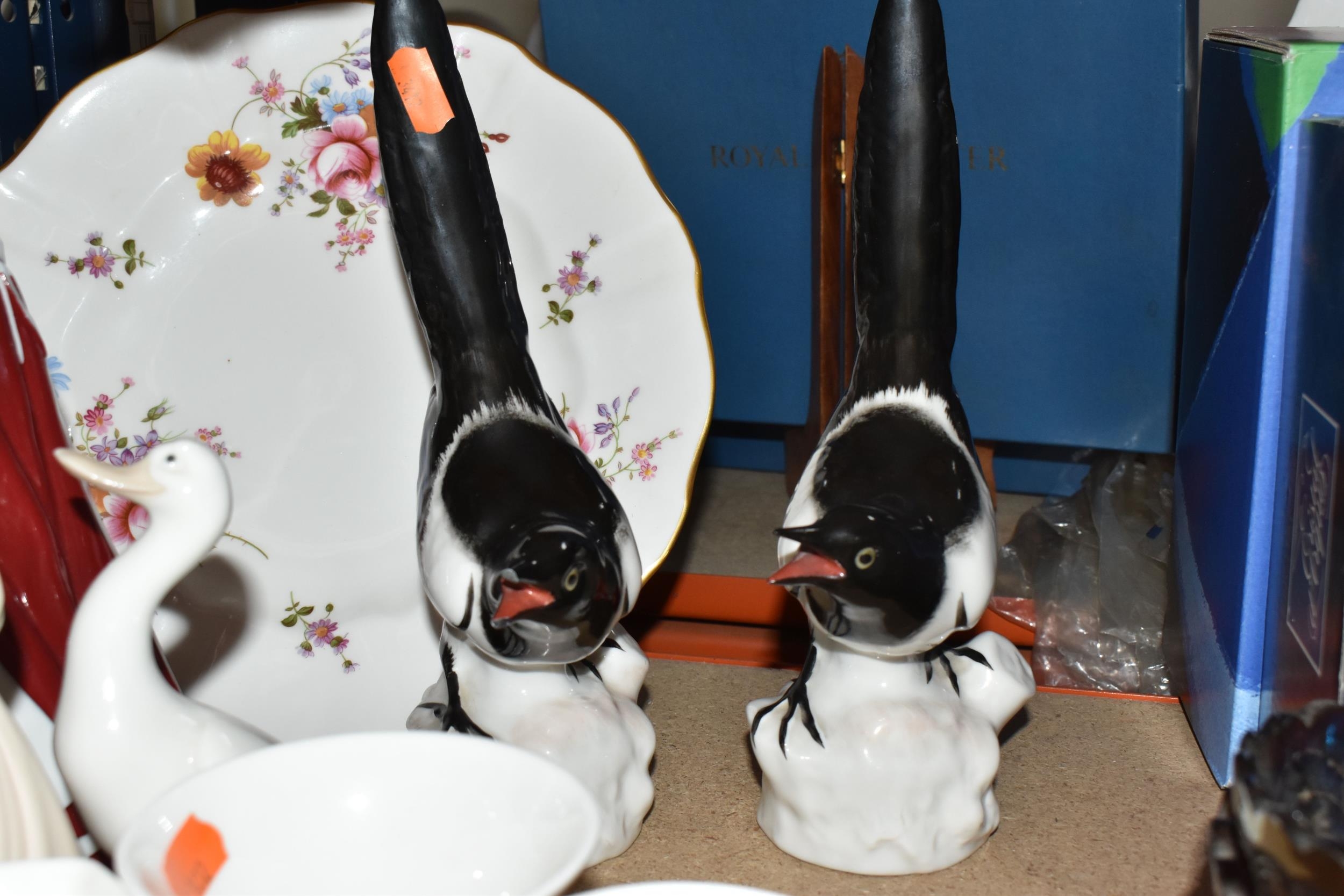 A GROUP OF CERAMICS, to include a Royal Worcester figure of HM Queen Elizabeth II to celebrate 'The Queen's 80th Birthday 2006', two Lomonosov magpie figures, height 25cm (one with damaged beak), a Royal Crown Derby 'Derby Posies' dinner plate, cream jug, trinket dish and saucer, a Coalport 'Jean' figurine, a Nao figure of a duck, other items of giftware in Aynsley Little Sweetheart and Wedgwood Angela patterns, etc (16) (Condition Report: most pieces appear ok, obvious specific damage as stated, would benefit from a clean)
