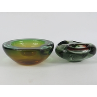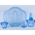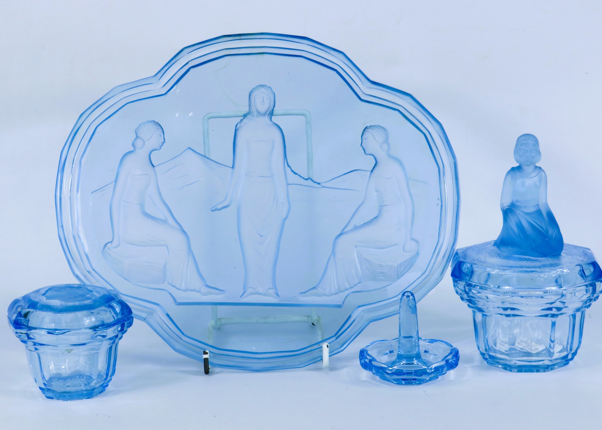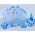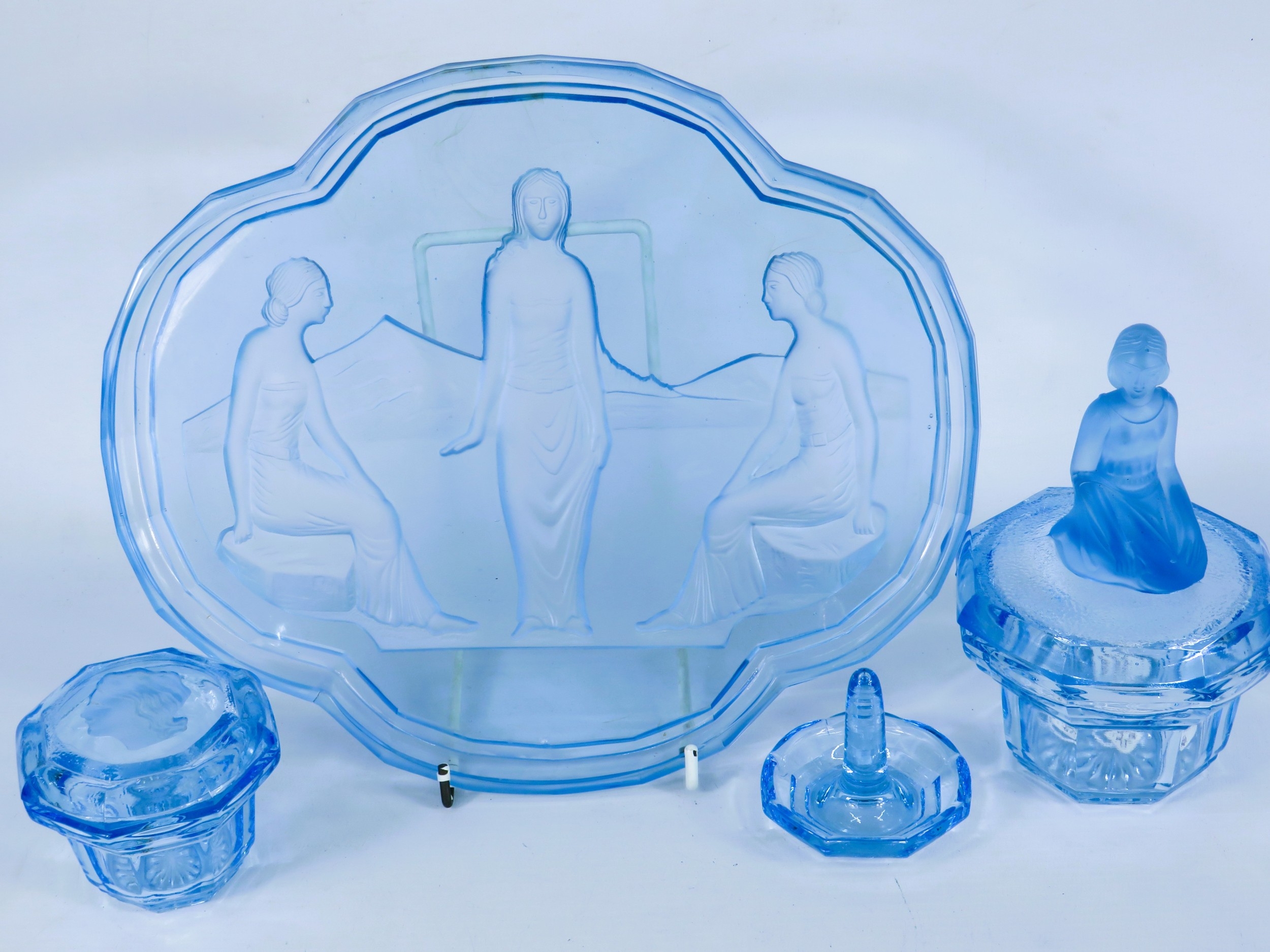Walther & Sohne Art Deco Blue Glass Egyptian Revival Dressing Table Set - Tray Powder Boxes & Ring Holder