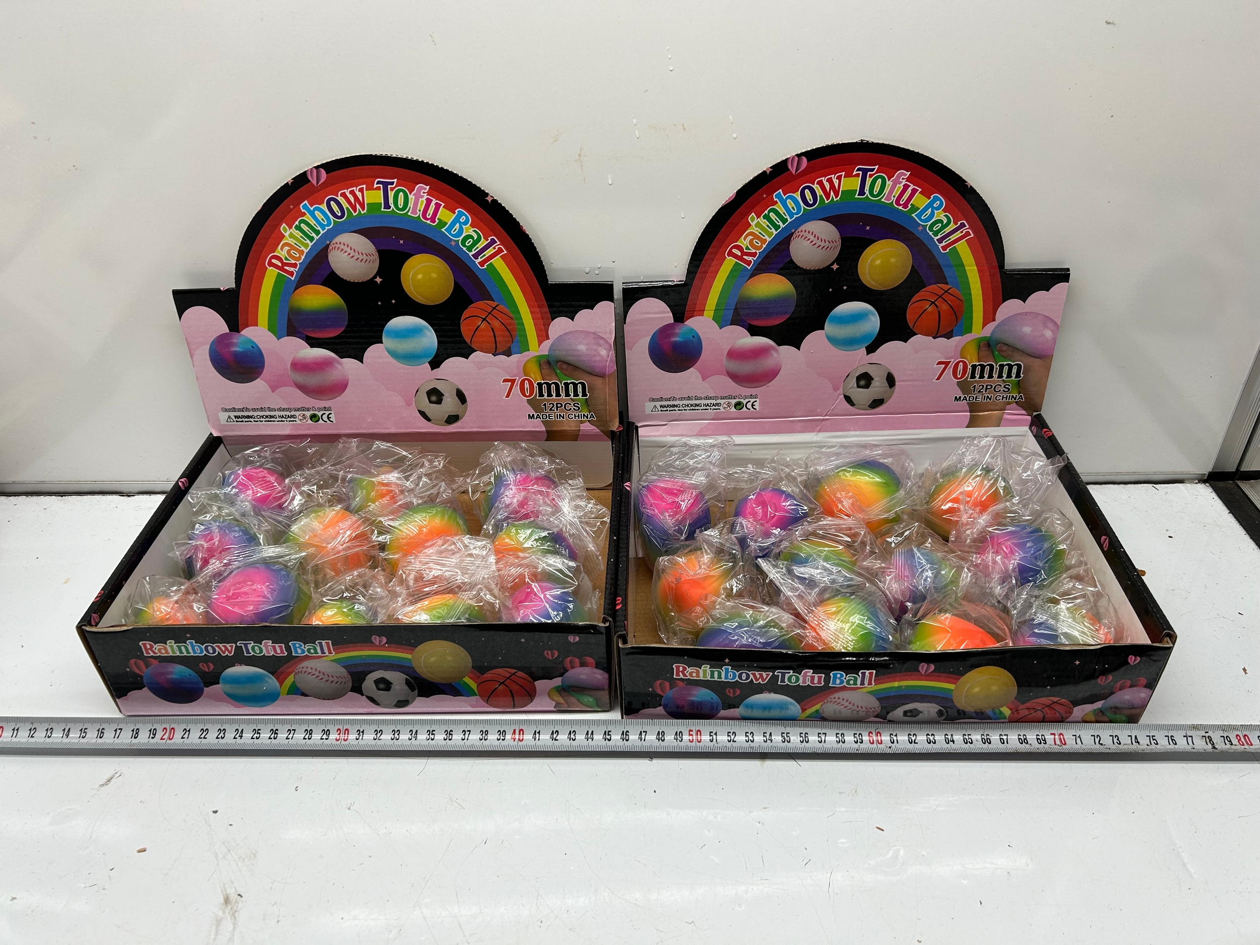 Two Display Boxes of Assorted Toy Balls / Fidget Toys – Rainbow Tofu Balls – Qty Approx 24