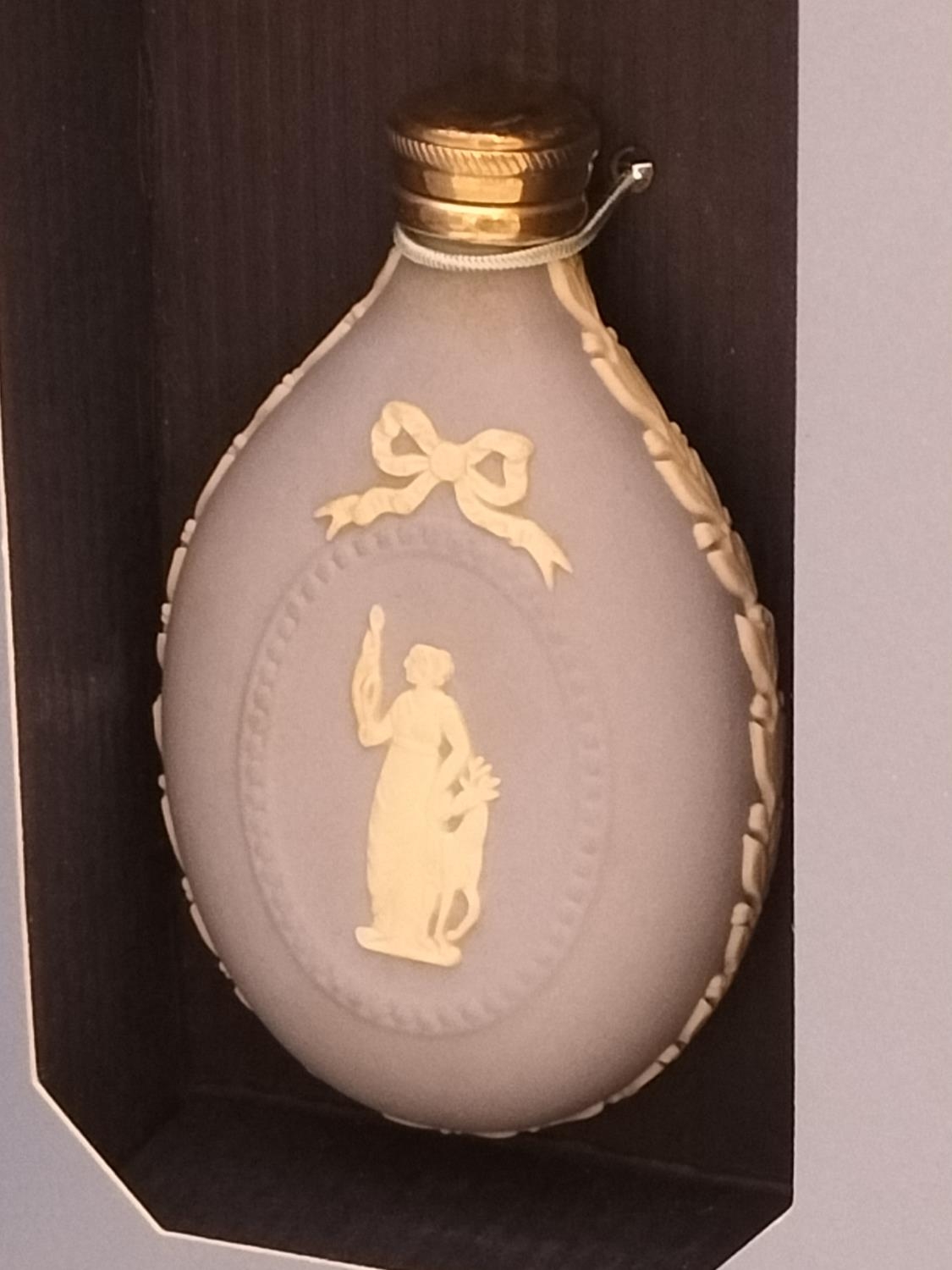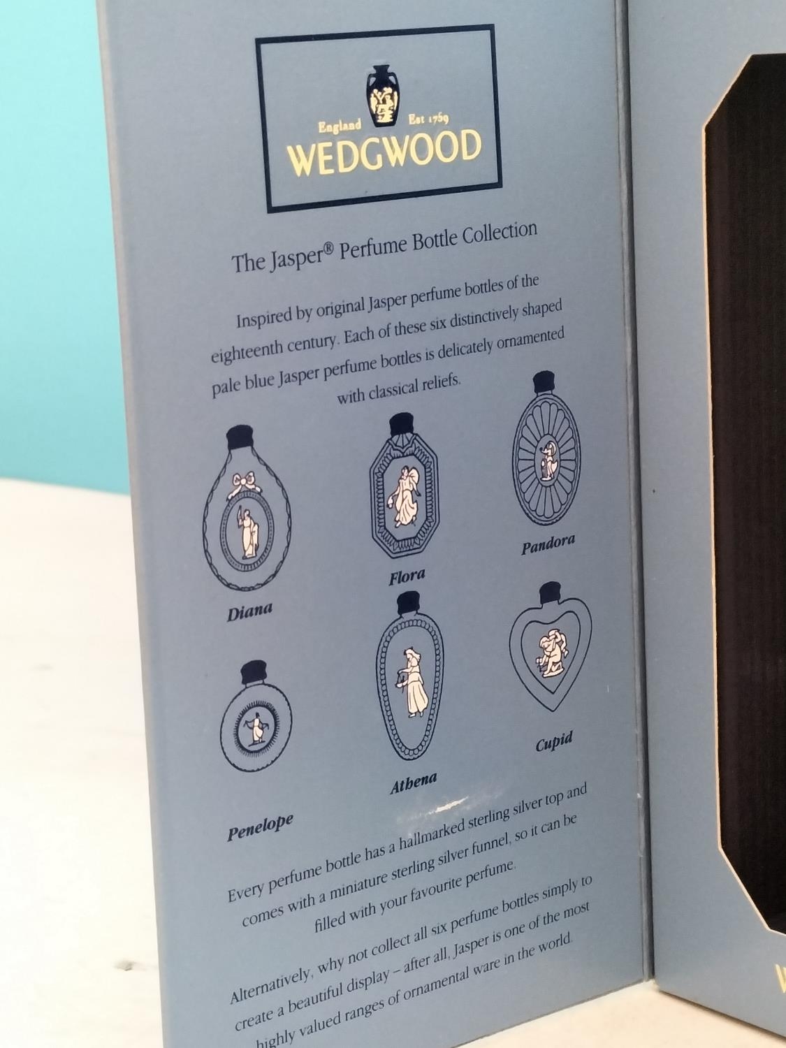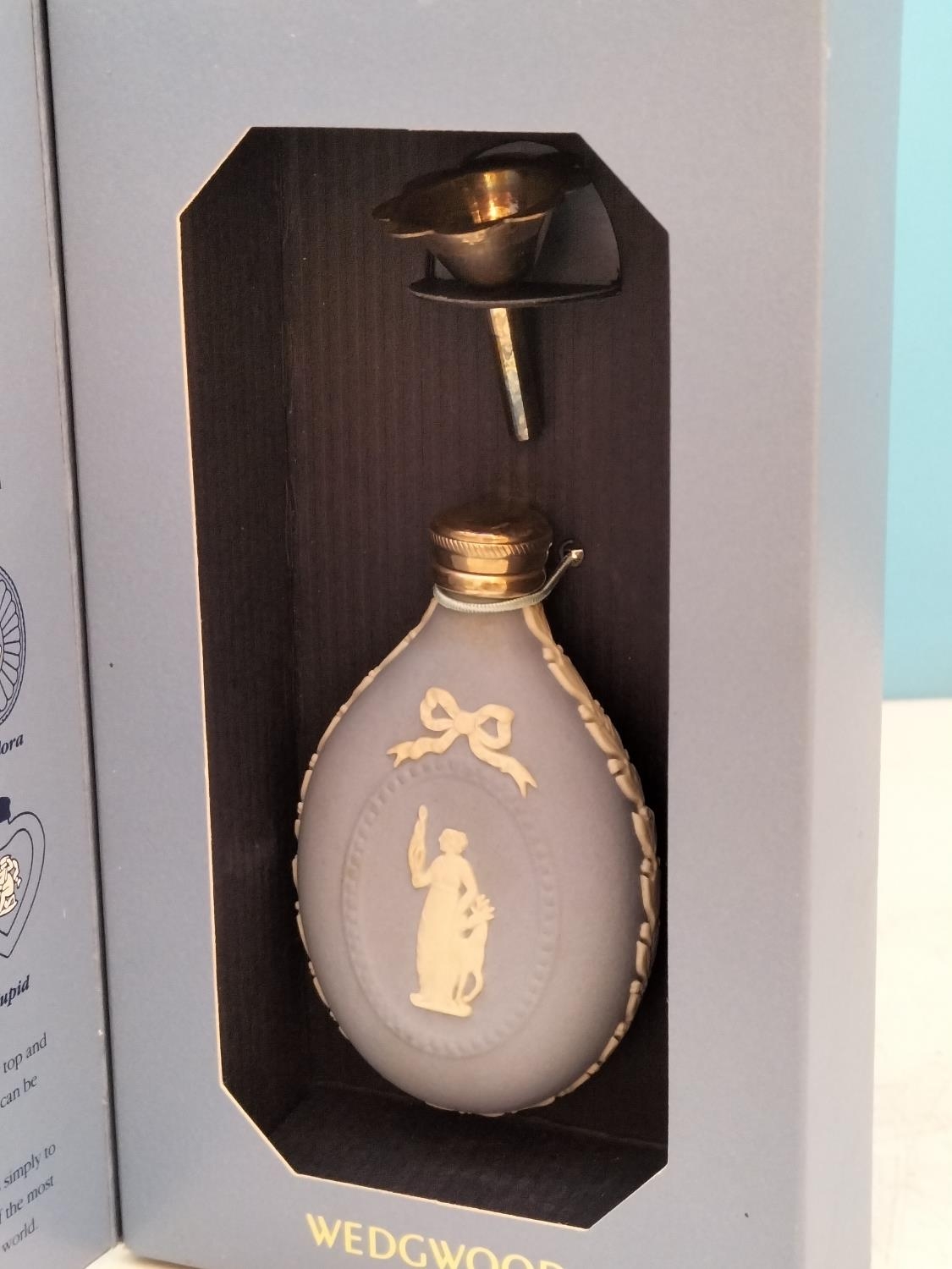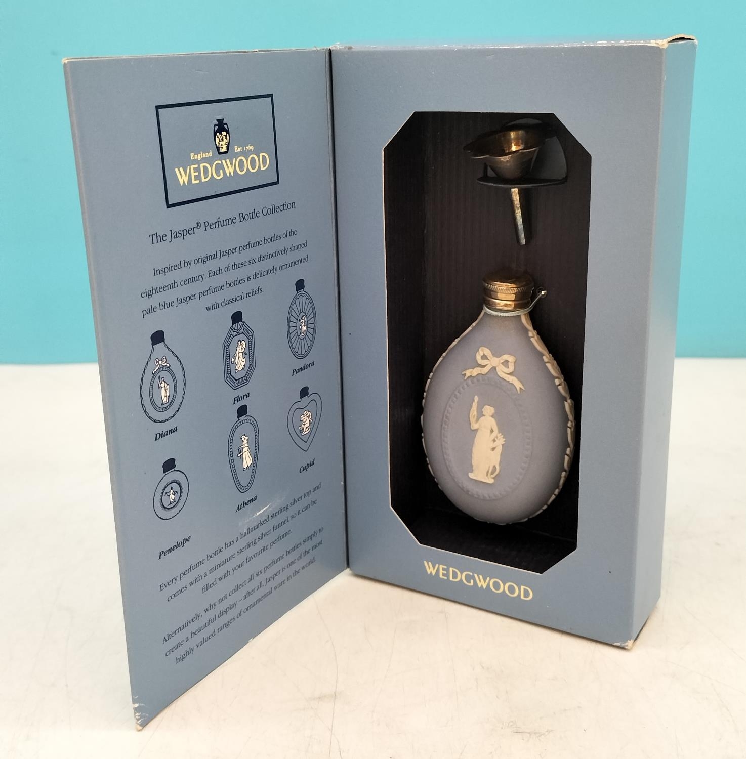Boxed Wedgwood Blue Jasperware Perfume Bottle 'Diana' with Sterling Silver Top and Funnel. 7.5cm Long.