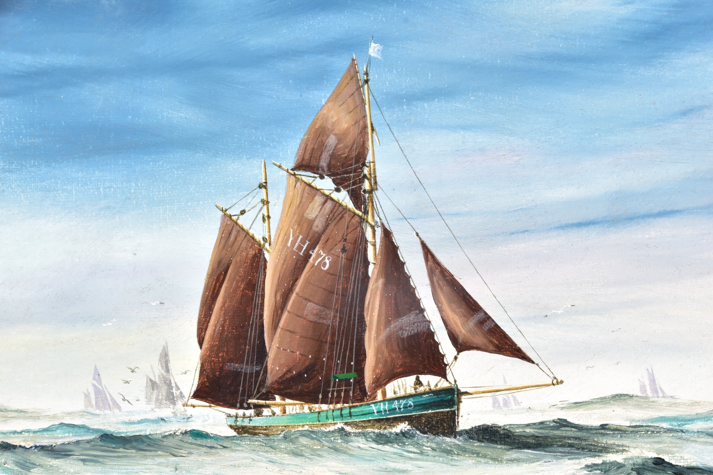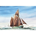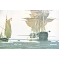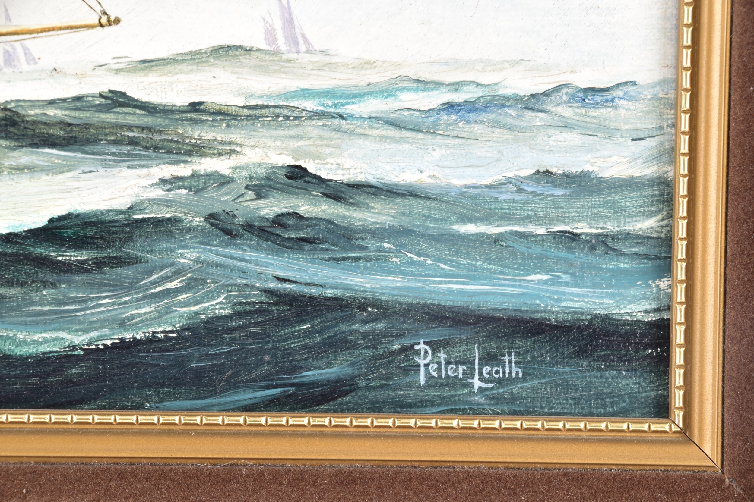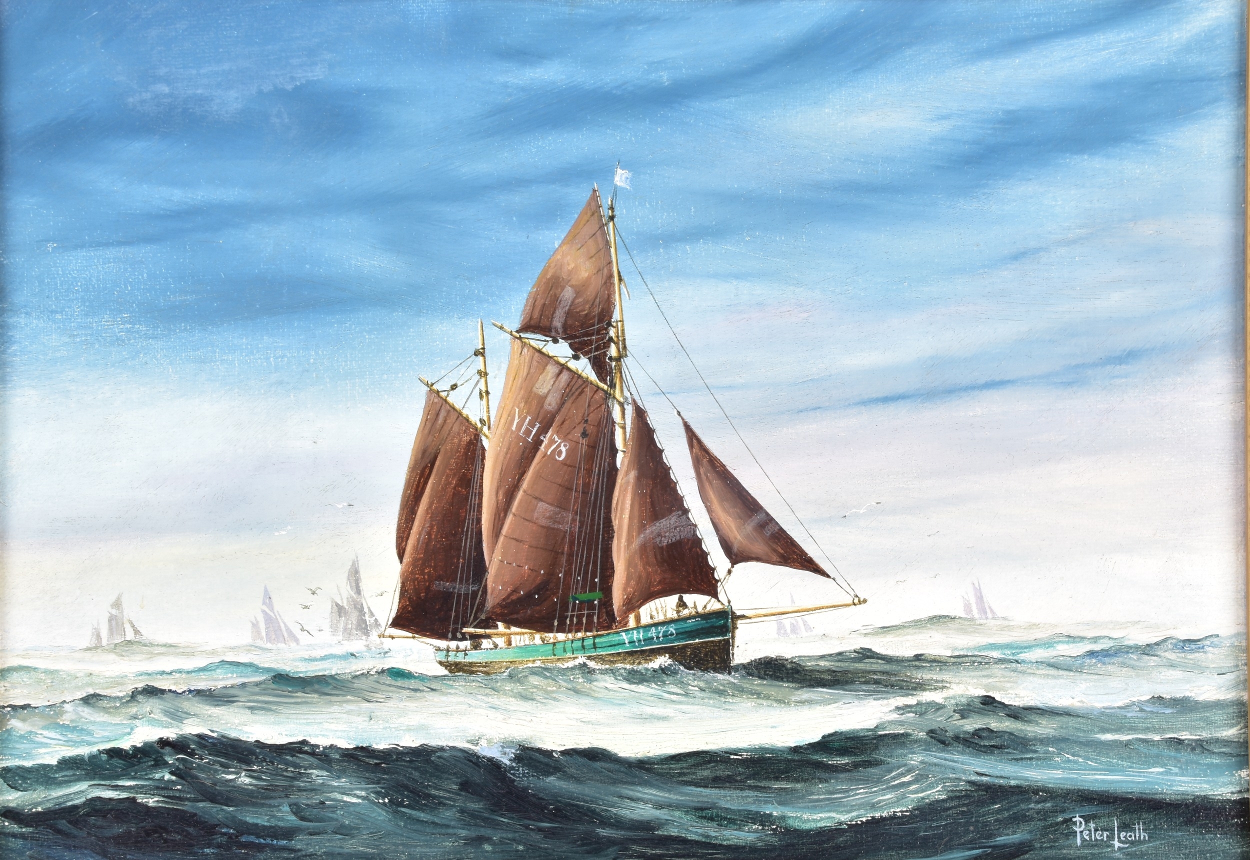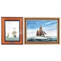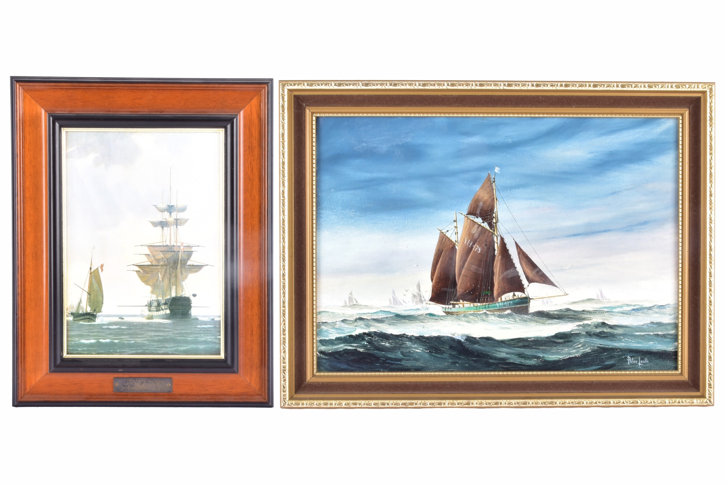 Two seascapes, including 'Heading for the Grounds' by Peter Leath (British, 1935-), depicting the Yarmouth sailing trawler 'Venetia' heading for the fishing grounds which lay 180 miles out in the North Sea, signed to lower right, oil on canvas, 24 x 34.5 cm, framed, together with an embellished print of 'Preparing to Sail' by Christoffer Wilhelm Eckersberg, 23.5 x 16.5 cm, Stephen Selby's Gift Collection label to verso, framed. (2)